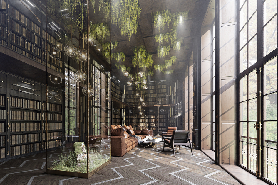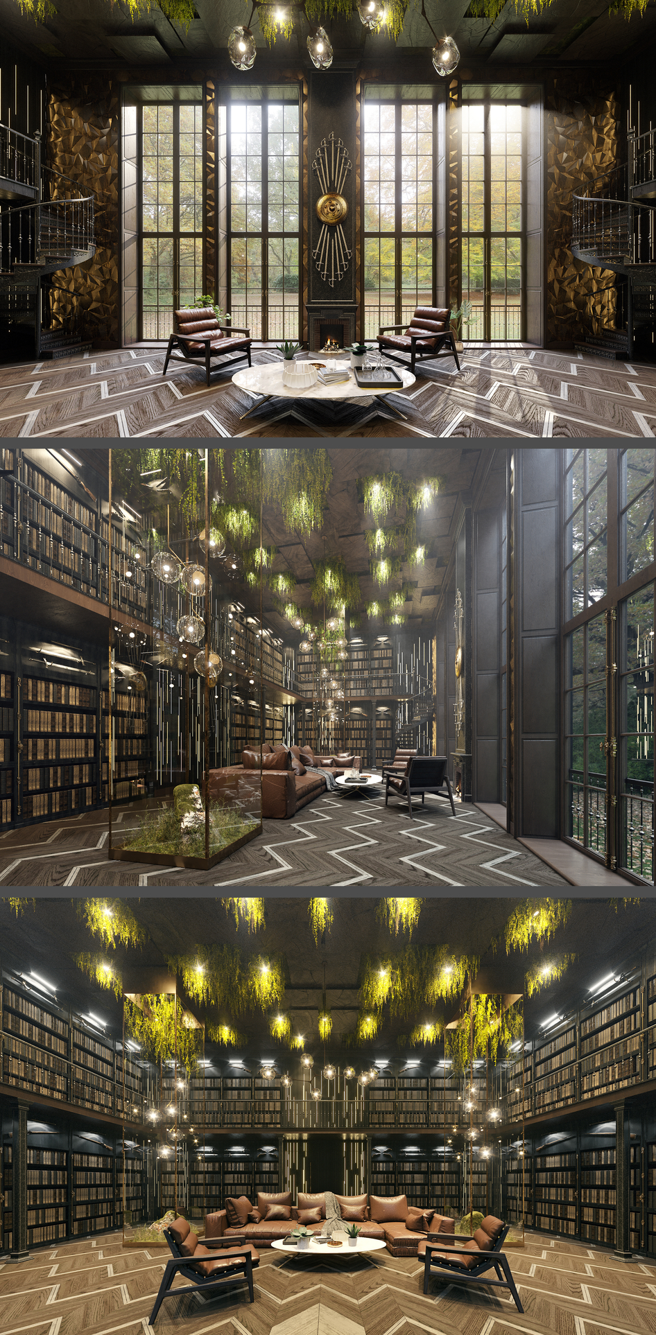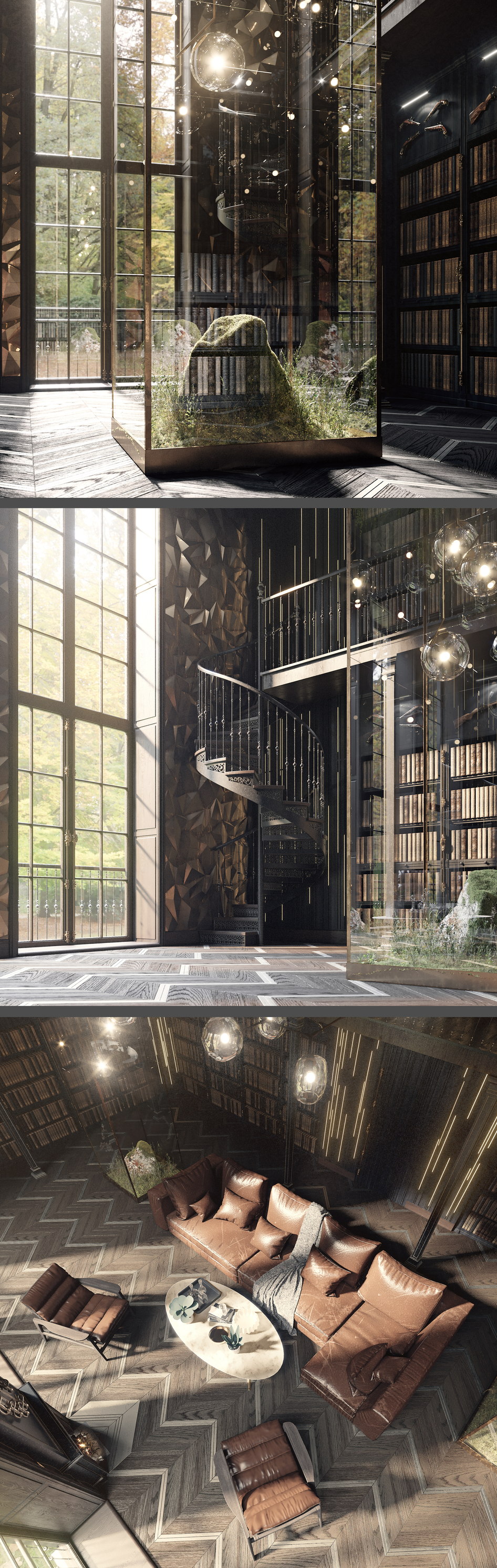 Дизайн концепция частной библиотеки без привязки к помещению, так как помещение захотели проектировать исключительно под неё! Из предпочтений заказчика были выявлено два основных пожелания по концепту: оружие, и приближенность к природе. Потом в проекте обозначились металл и дерево, как основные два отделочных материала.