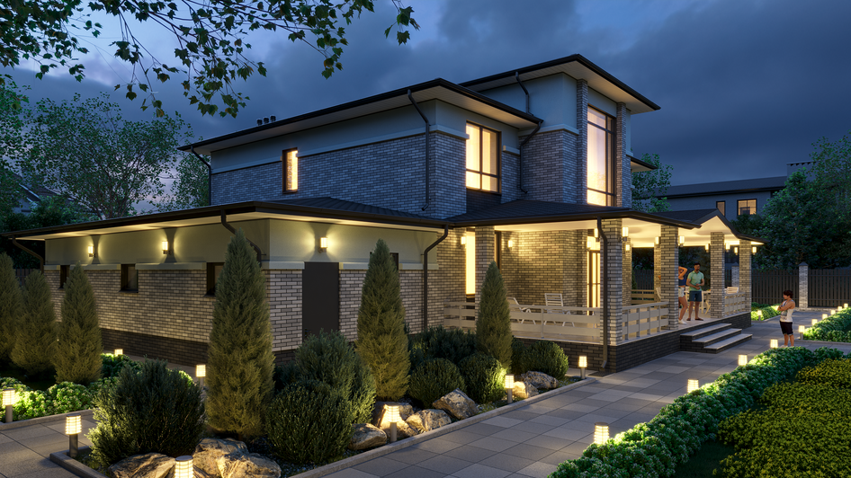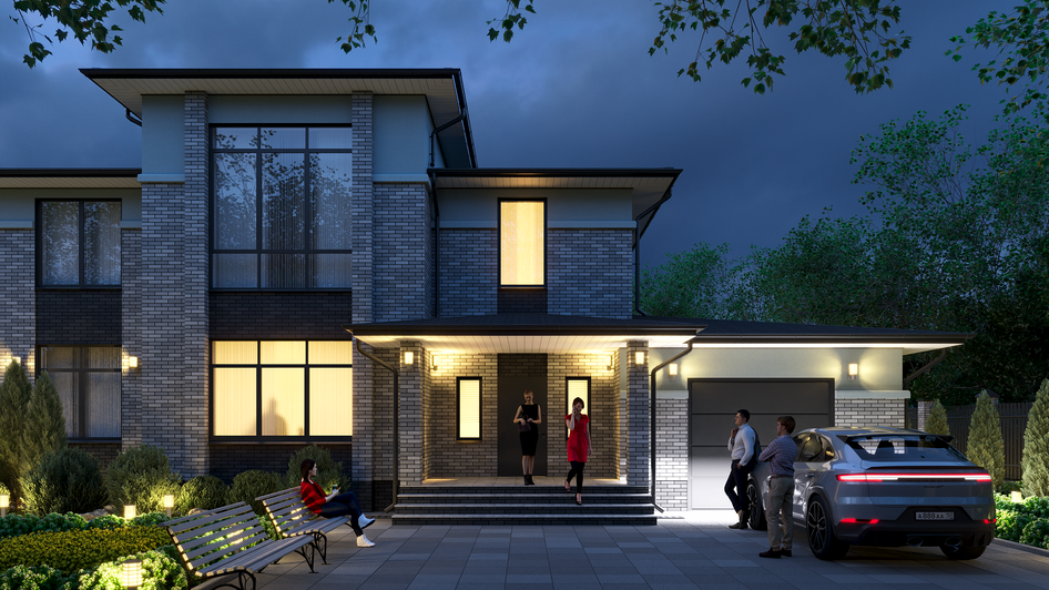 Что сделано: архикадовская 3Д-модель подкорректирована, оптимизирована и текстурирована, окружение полостью "из головы", но в пределах участка (дом только строится). Соседние домики и растительность - условно.