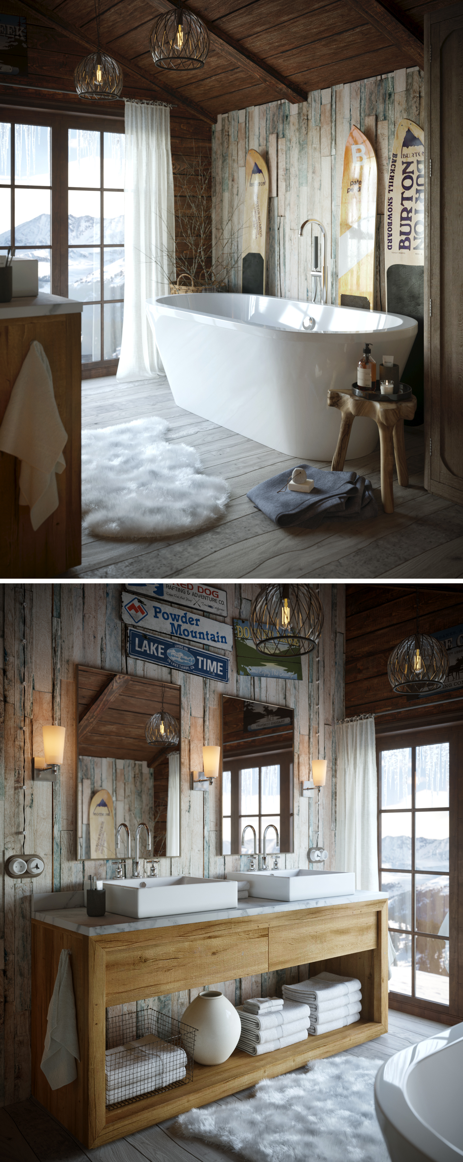 Снаружи все очень фундаментально и грубо. Крупный округлый брус, неотесанное дерево. Внутри камин с украшениями, елка и мягкие пледы с подушками.