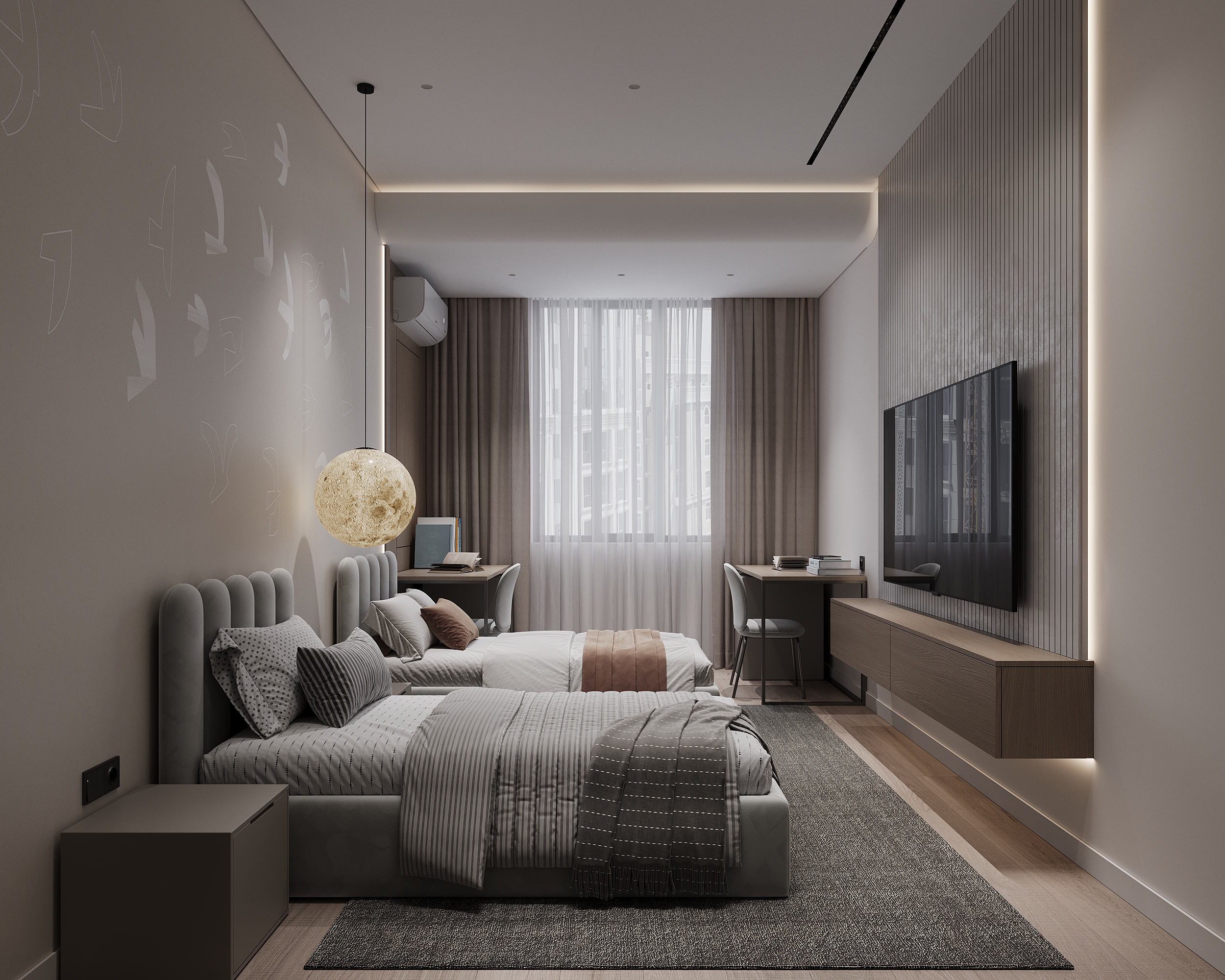 "Лунный уют: современная детская с мягкими тонами, волшебным освещением и атмосферой спокойствия."