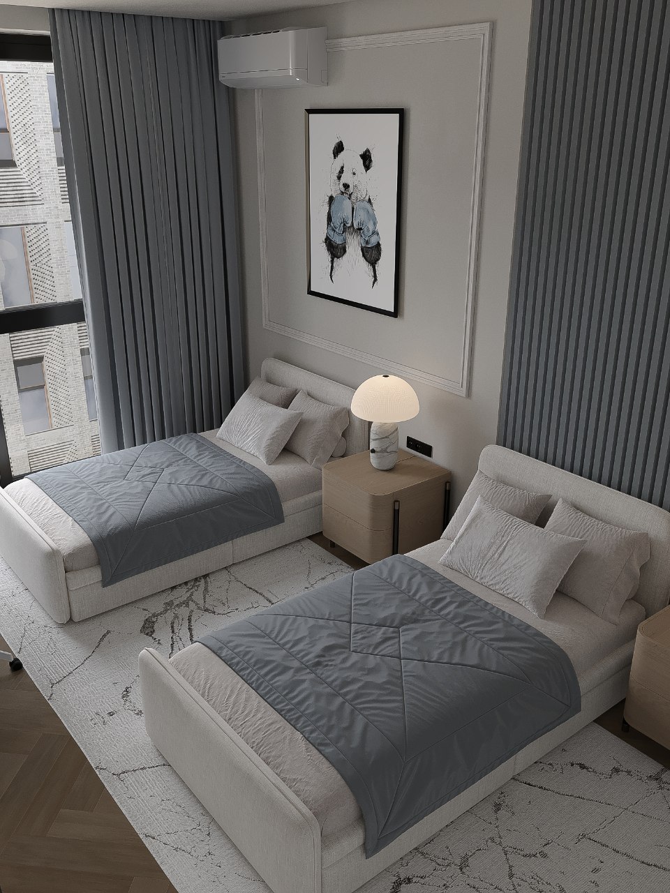 Все конечно очень красиво, лаконично , эстетично , но не ужели рамка за кроватью настолько важна что стоило ее вот так вот обрезать кондиционером ?! Прям как вилкой по стеклу....