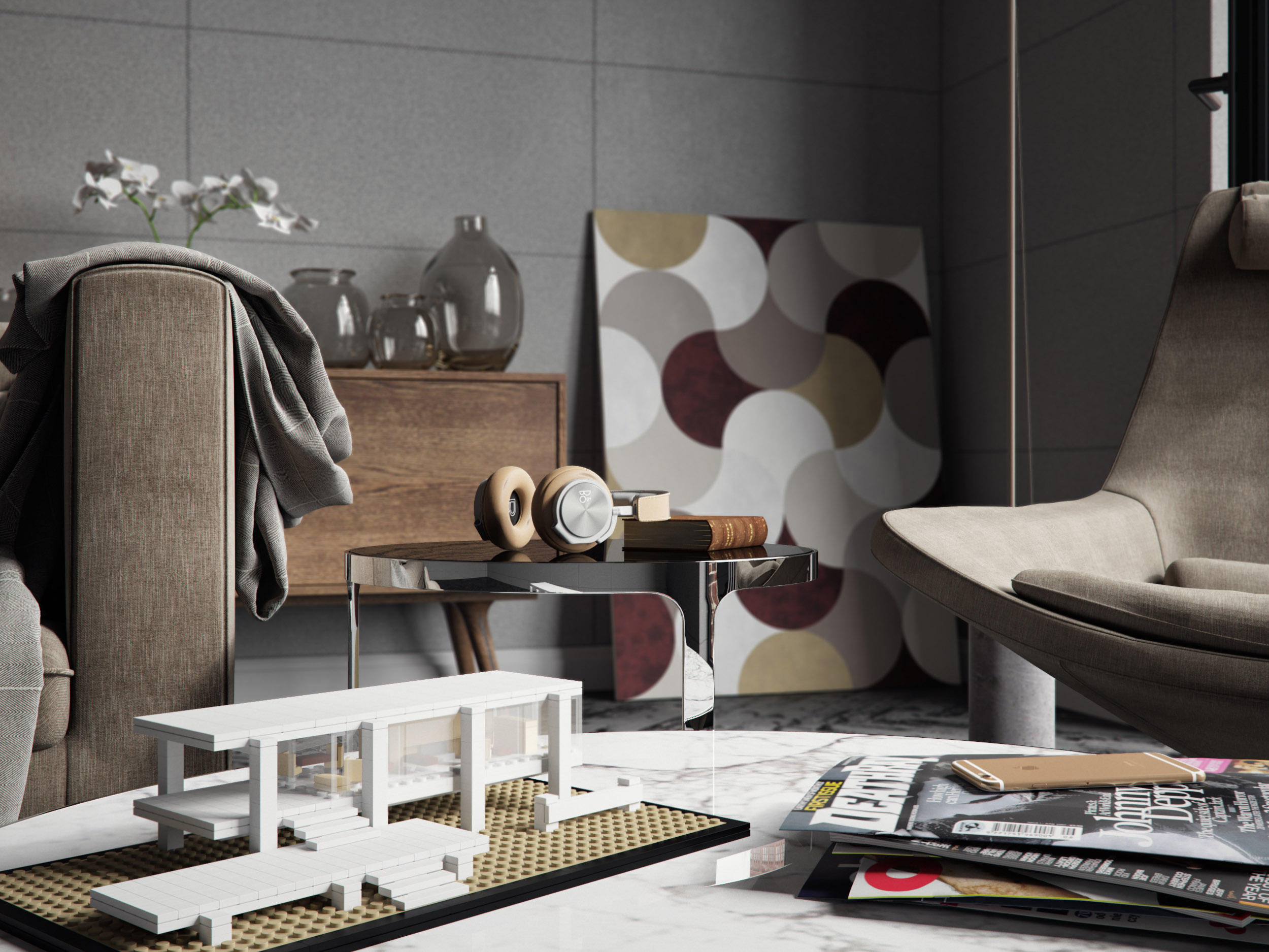 как раз шума не много, это материал на панелях такой-текстура. Металл и стекло не шумят, дерево тоже отлично выглядит. А вот орхидейка на заднем плане подкачала-но это больше сама модель.