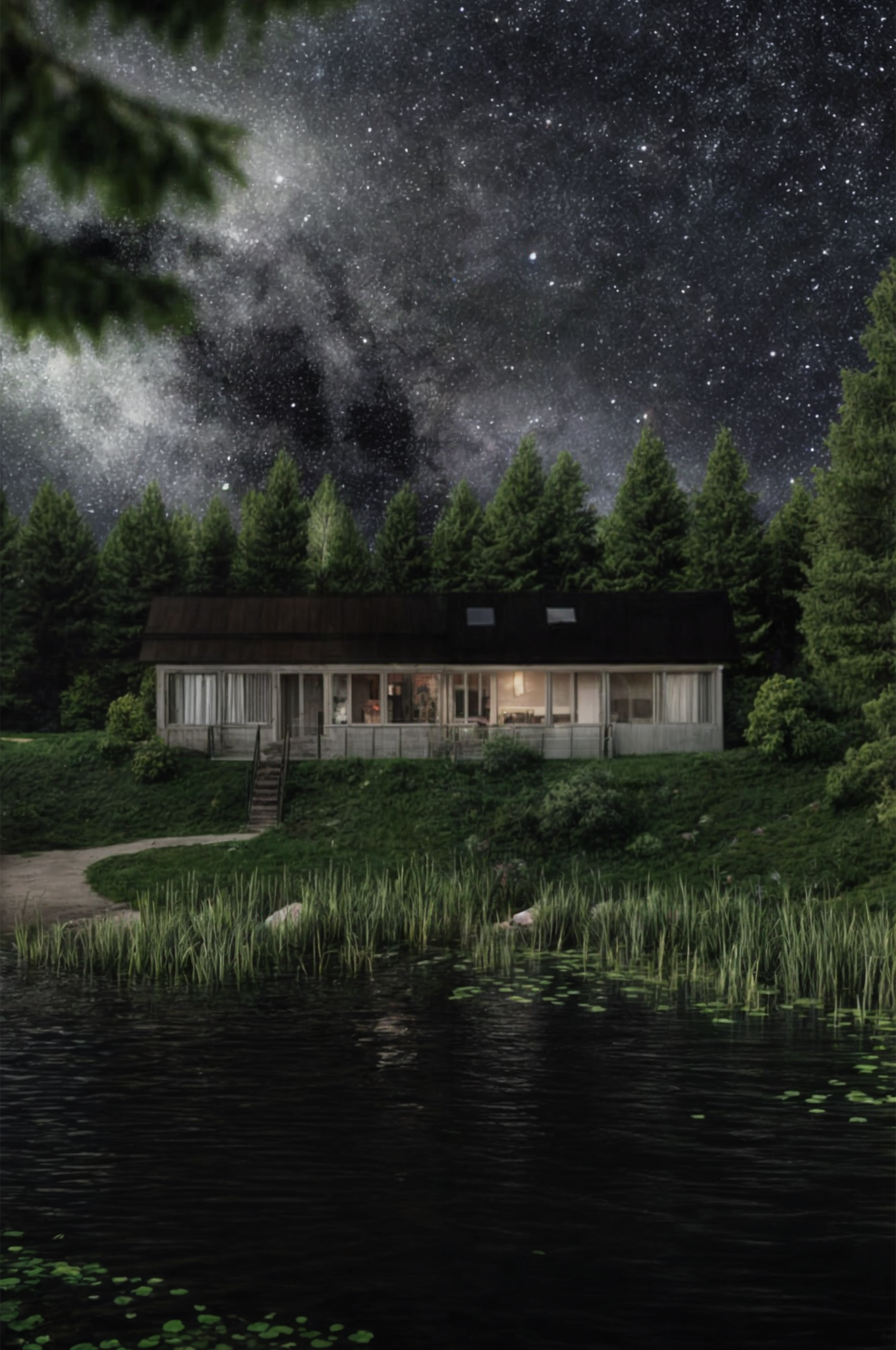 A visualization of a country house set against a forest backdrop with a lake in front. Different lighting scenarios are presented based on the time of day. Special attention is given to the realism of materials, water reflections, and the surrounding atmosphere.