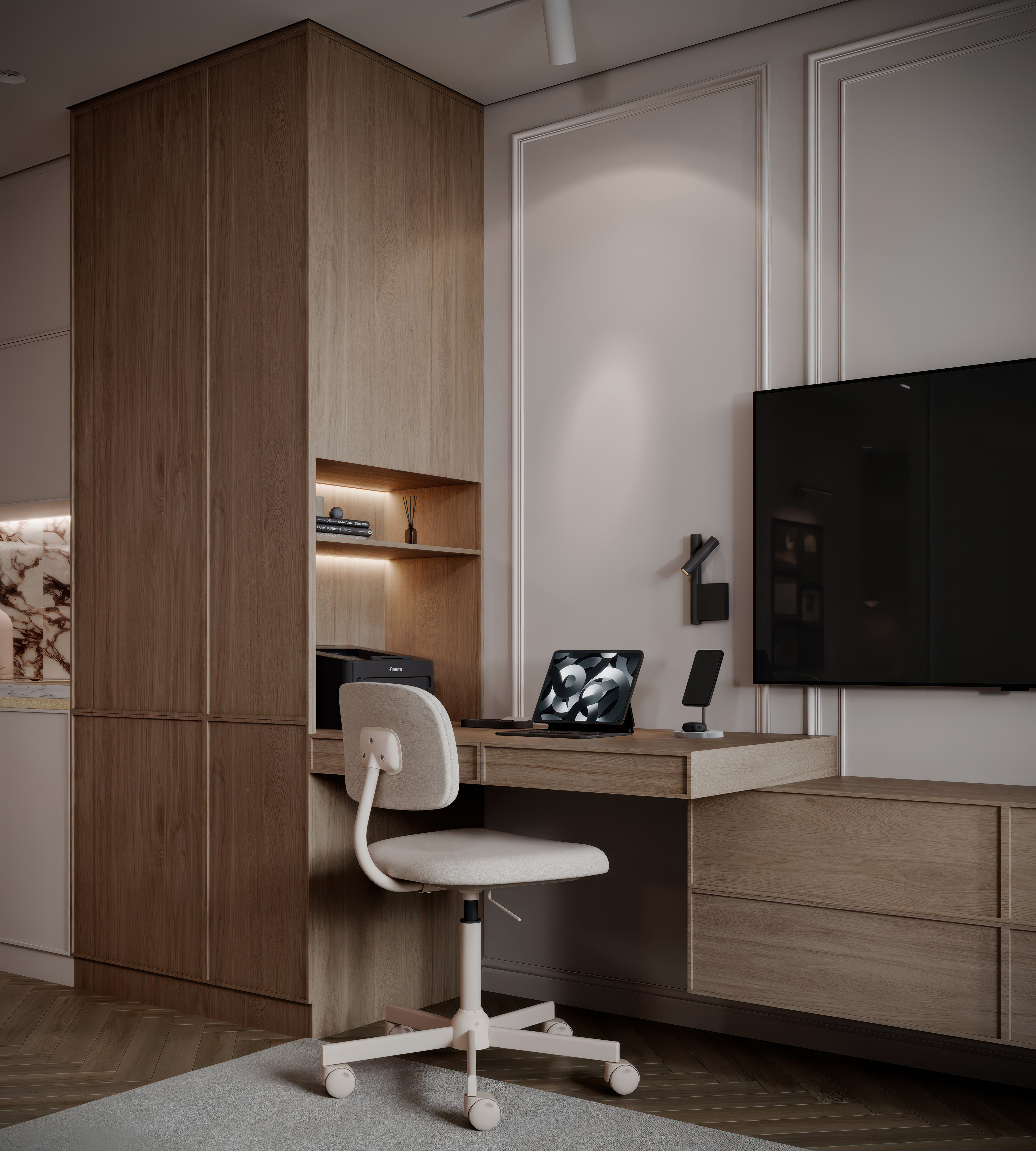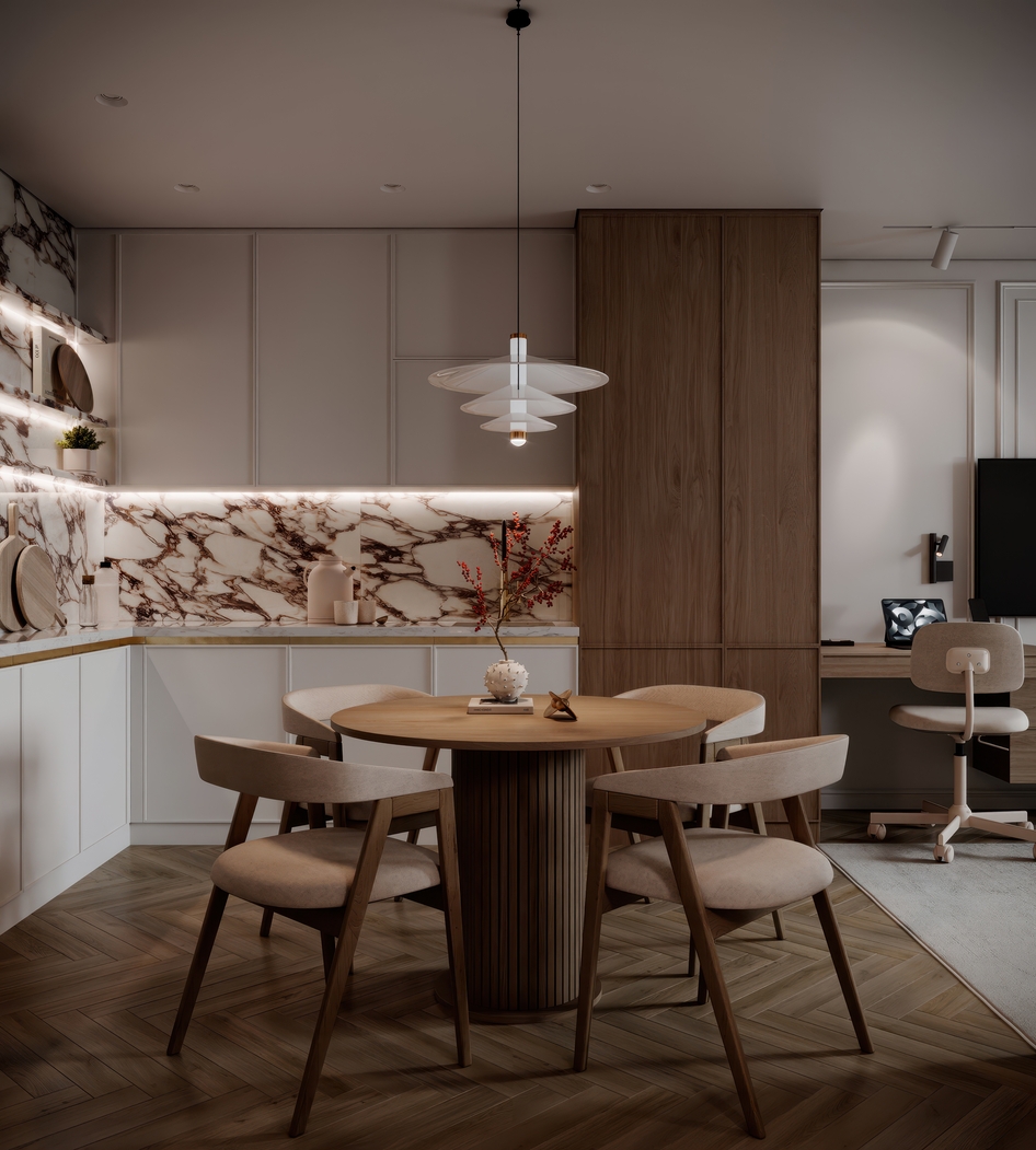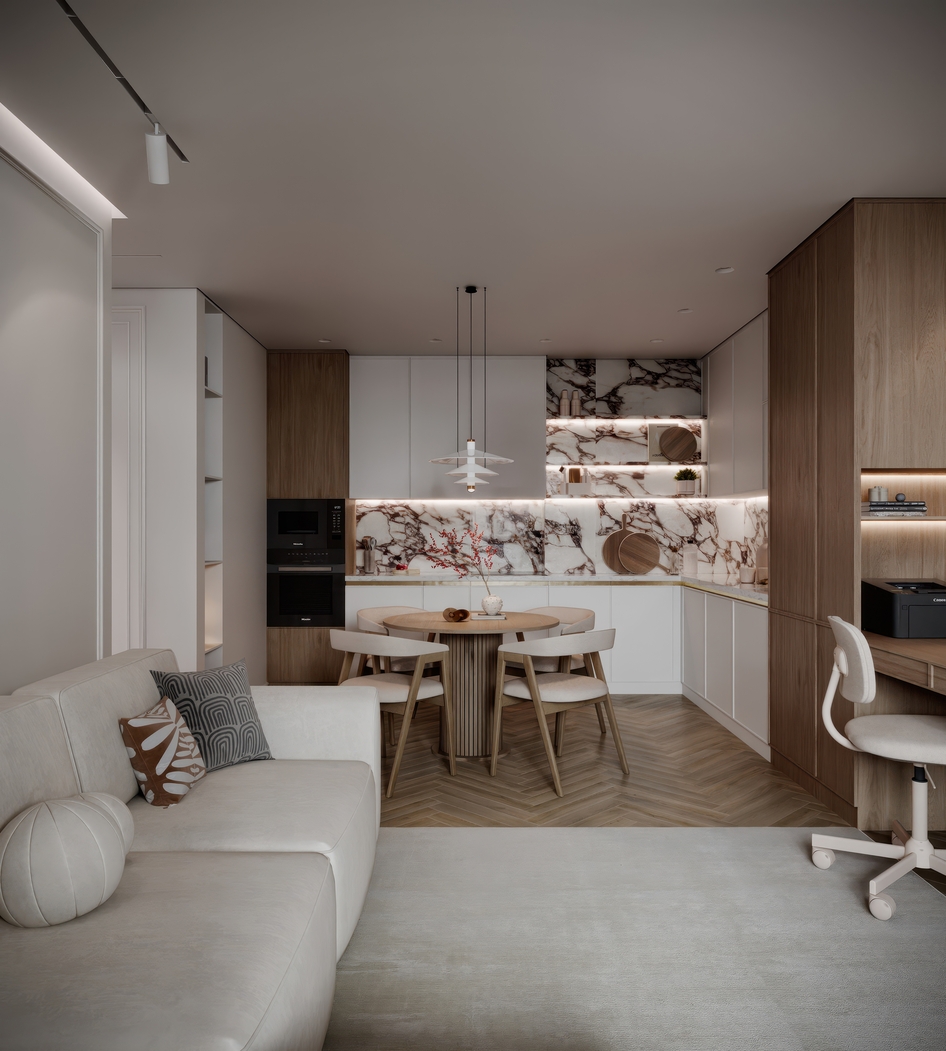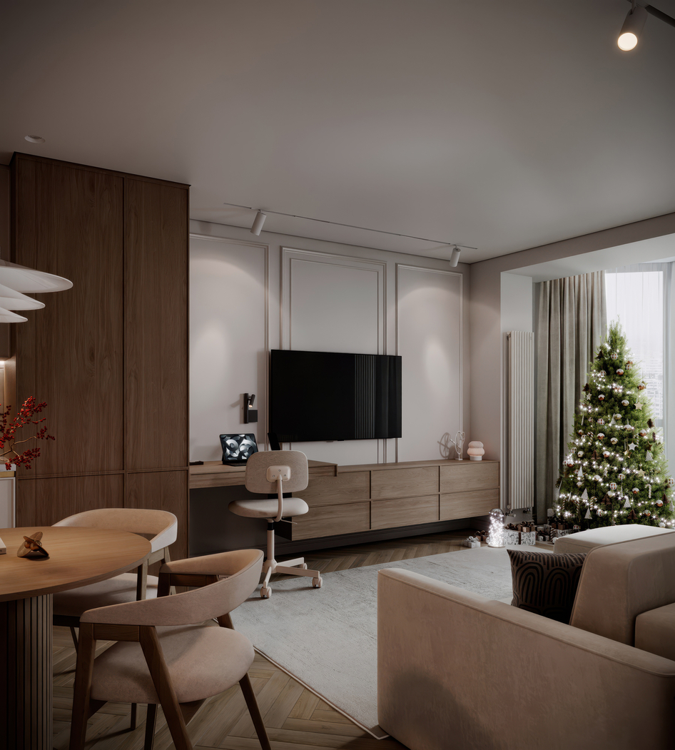 Design by : Parotkina _designer Viz by : abdumalikovv Проект современного уютного интерьера с новогодним декором. Основная визуализация выполнена мной, несколько дополнительных ракурсов были частично улучшены с помощью искусственного интеллекта.
