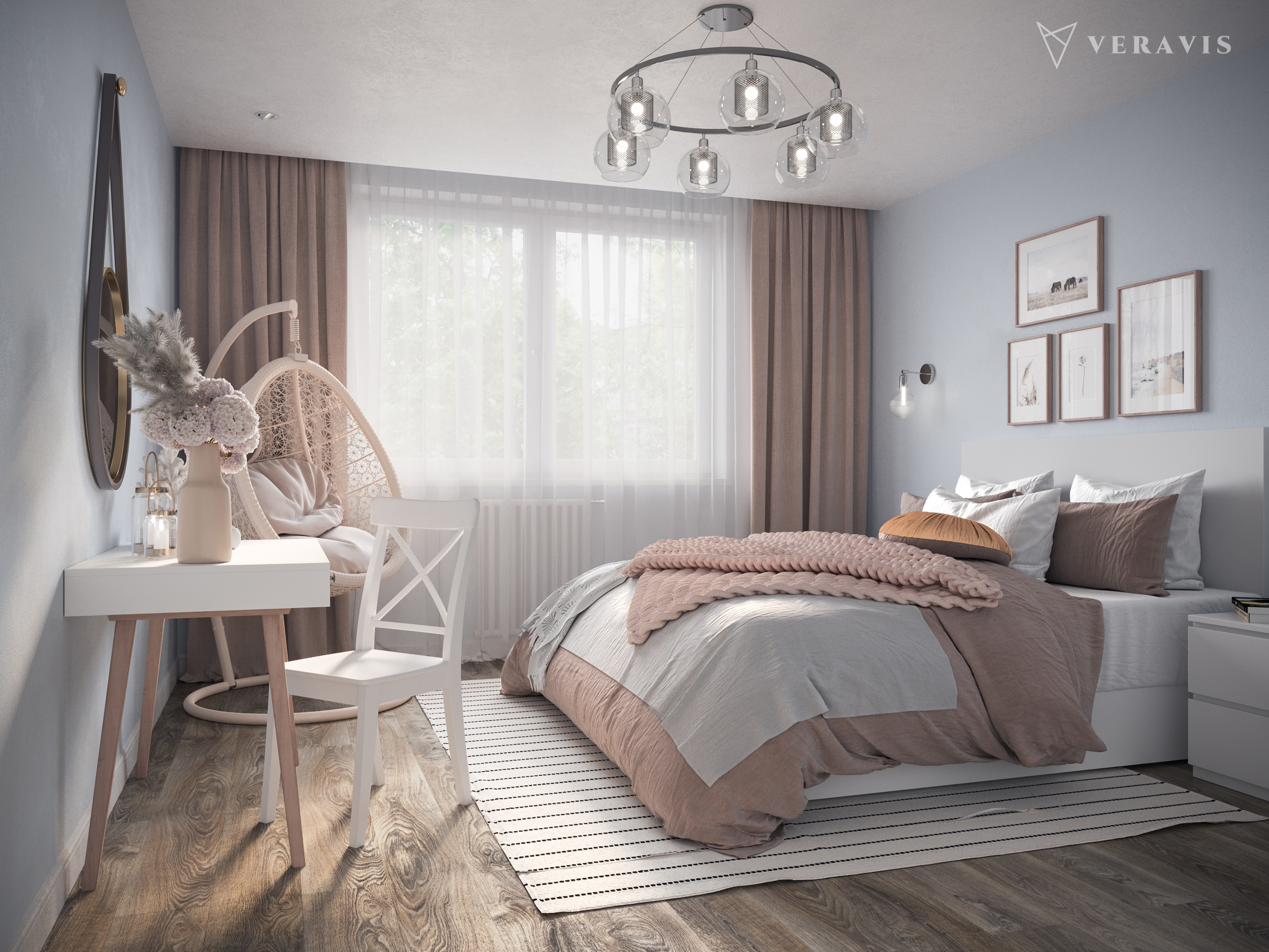 Тот случай, когда очень хочется придраться, но никак))) Штора спрятана за скрытым потолочным карнизом, люстра действительно центрирована не по кровати (по плану освещения дизайнера она была именно по центру комнаты), ну и с плинтусом всё ок. Вот странно, что на ковер никто не сделал акцент, забыла убрать этот косяк в фотошопе..)))