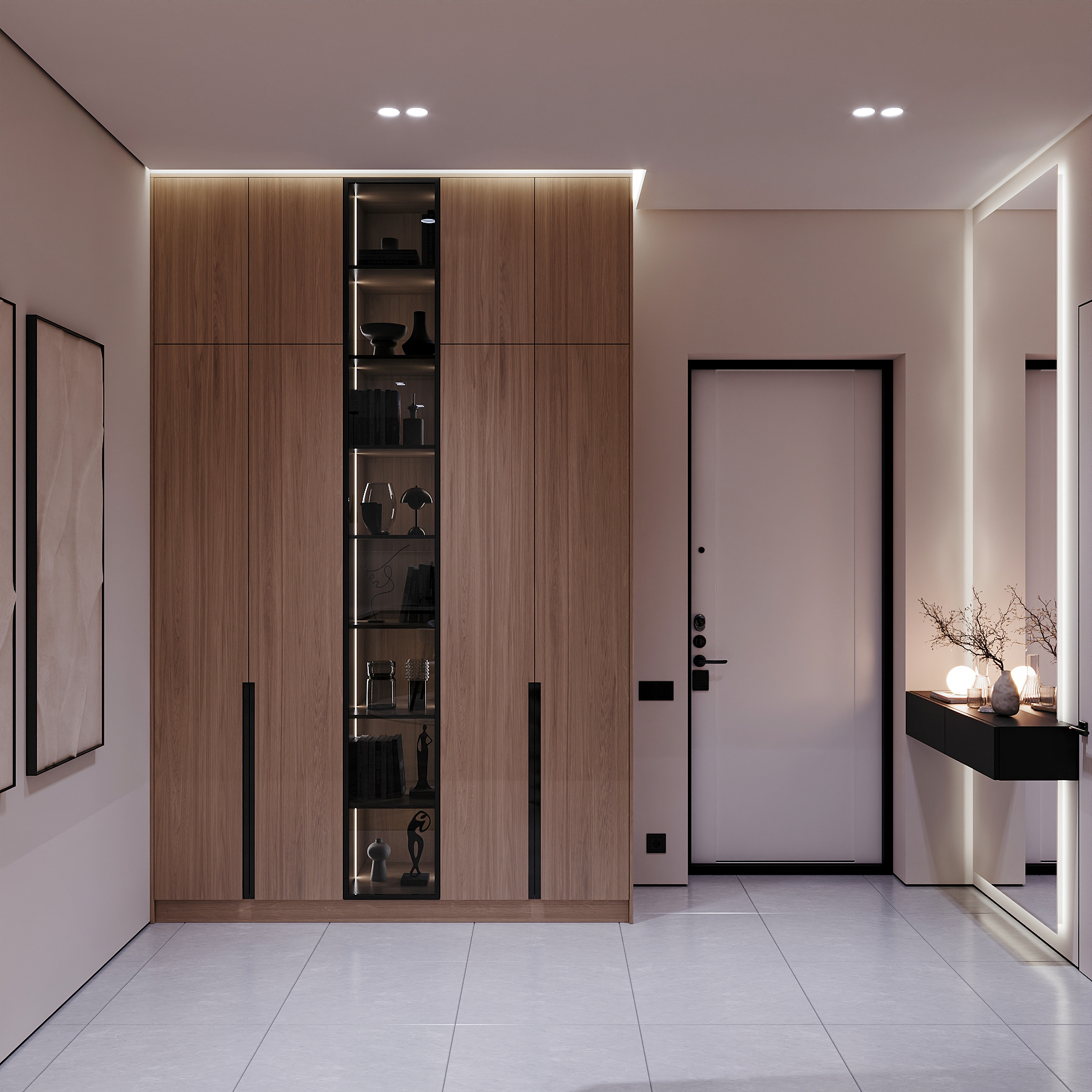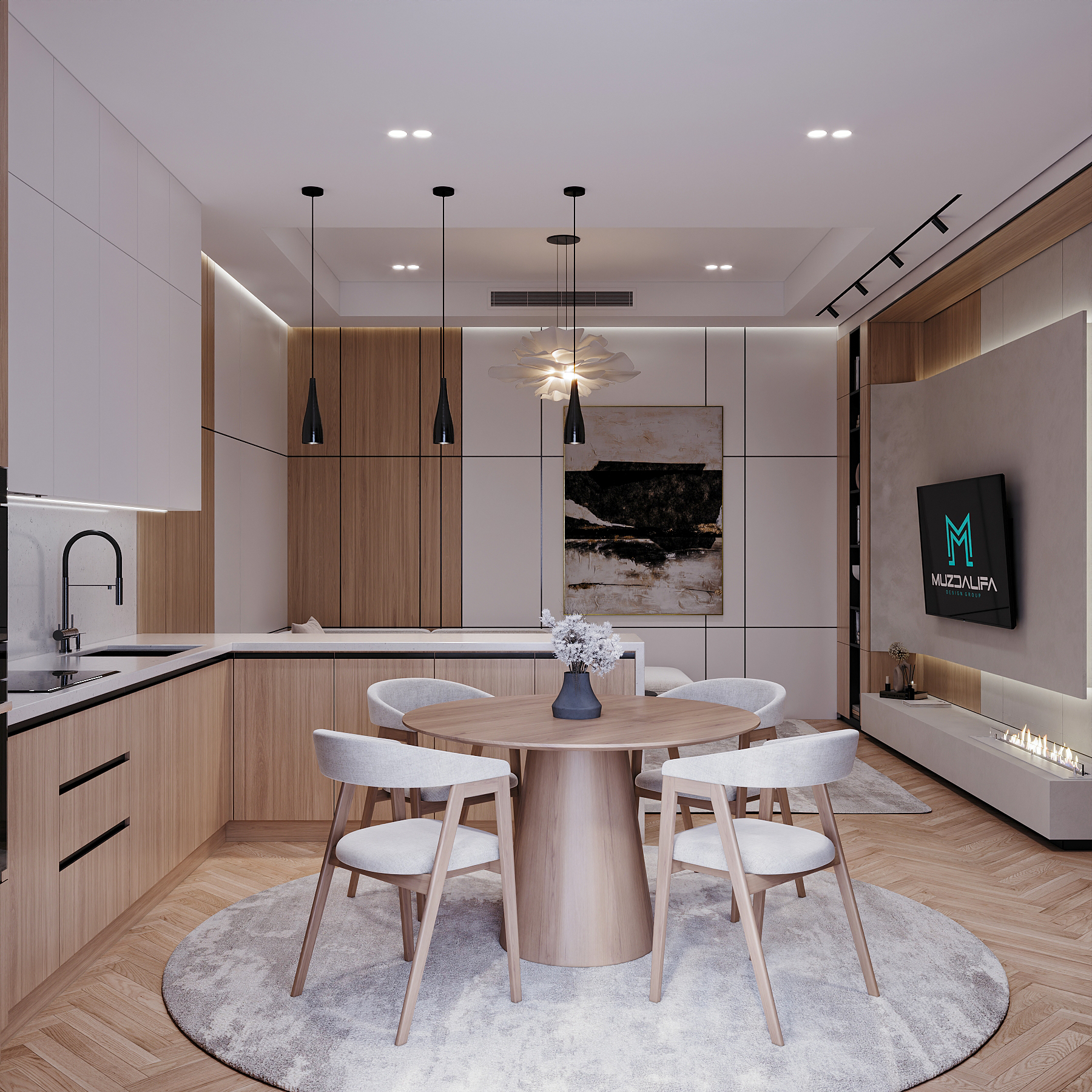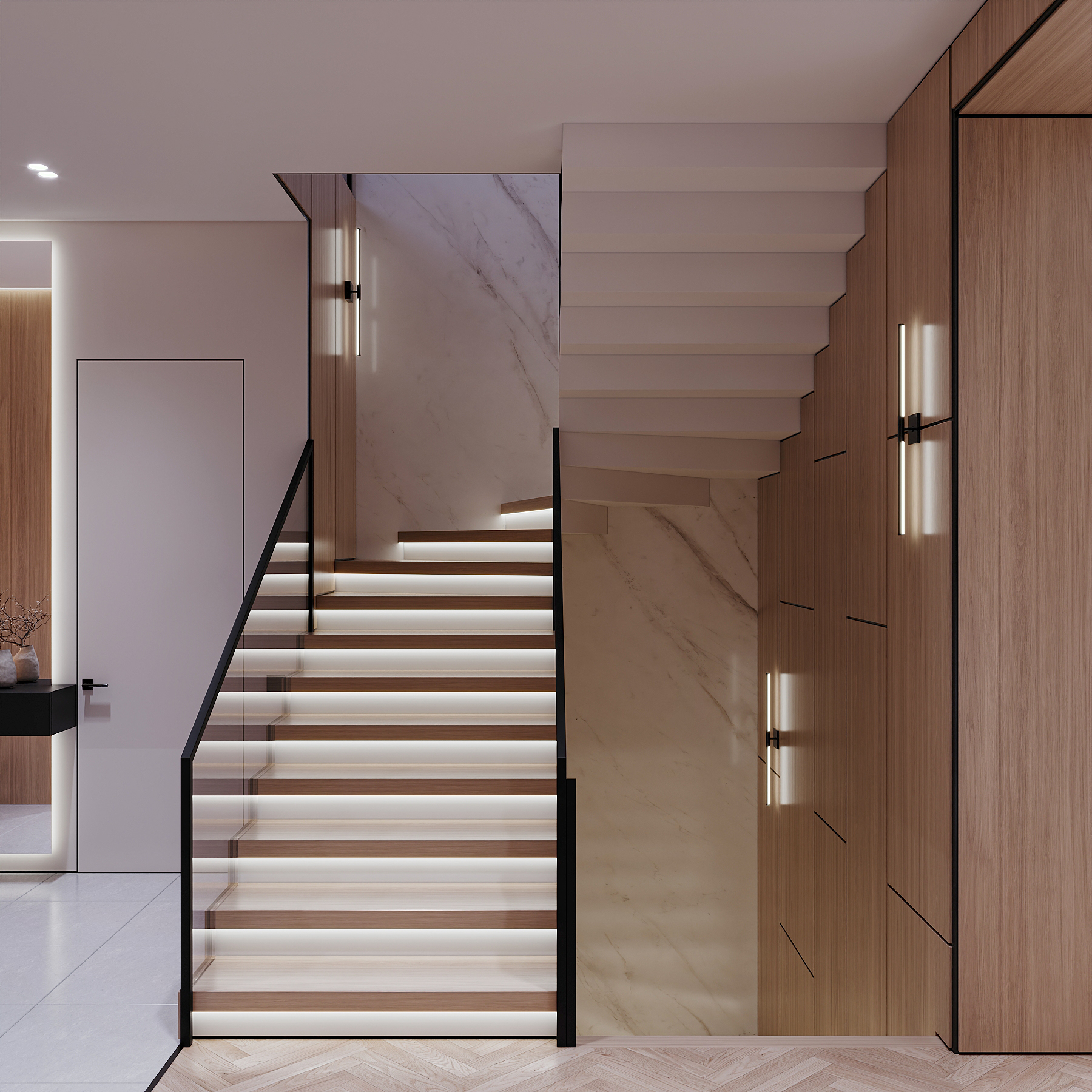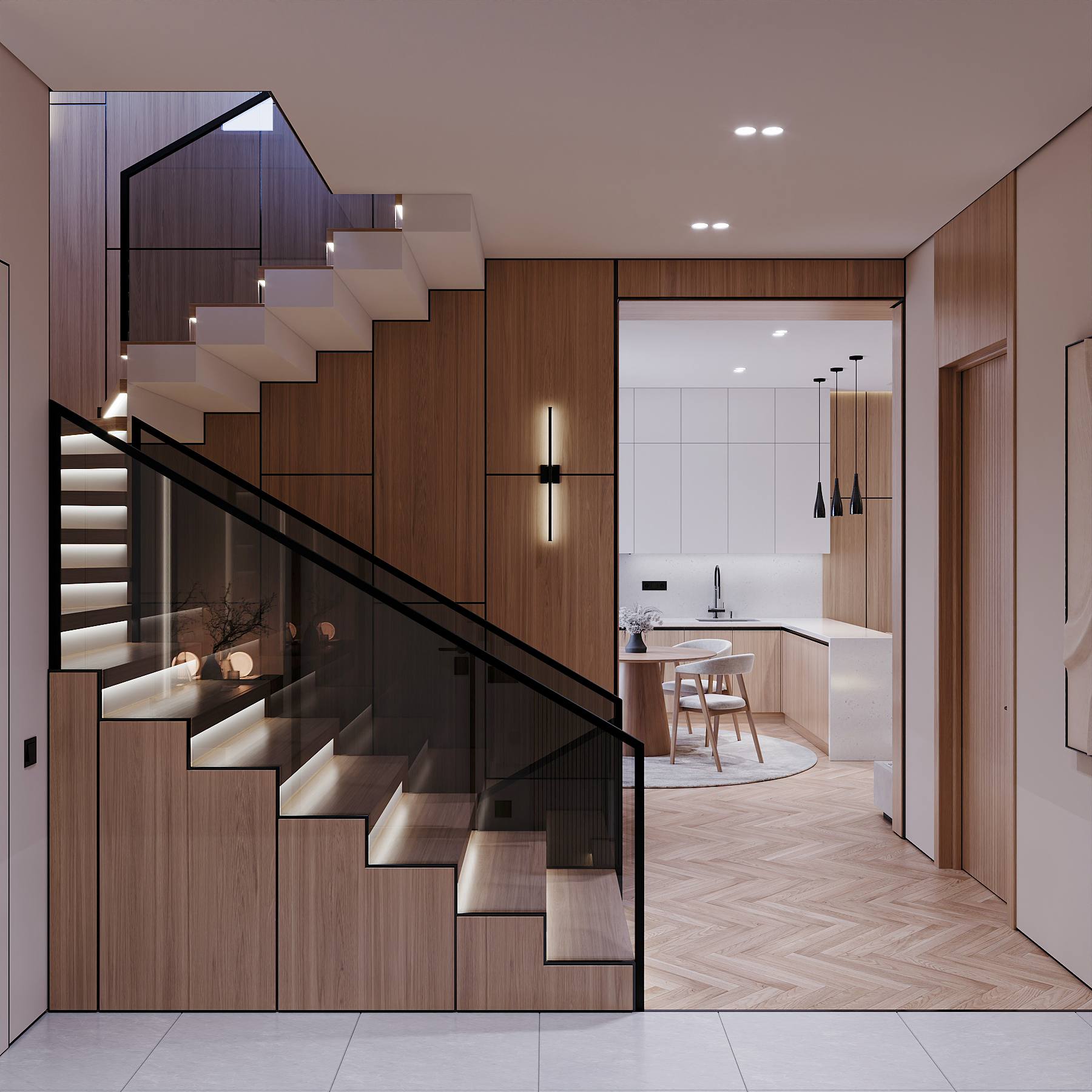 Design for a 2-story residential building located in Tashkent Yunusabad region, 6th quarter. Here is the entrance hall, kitchen and living room. The rest of the rooms are shown in the next section, if you like it, leave a comment