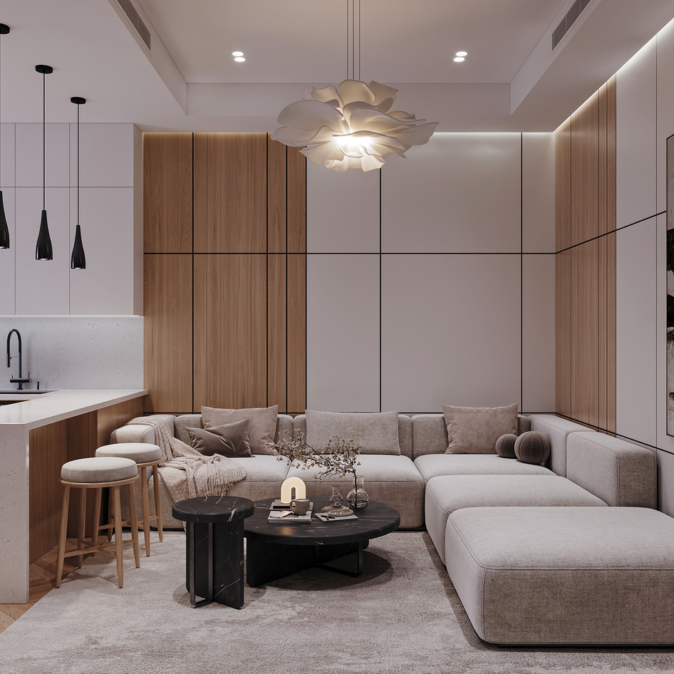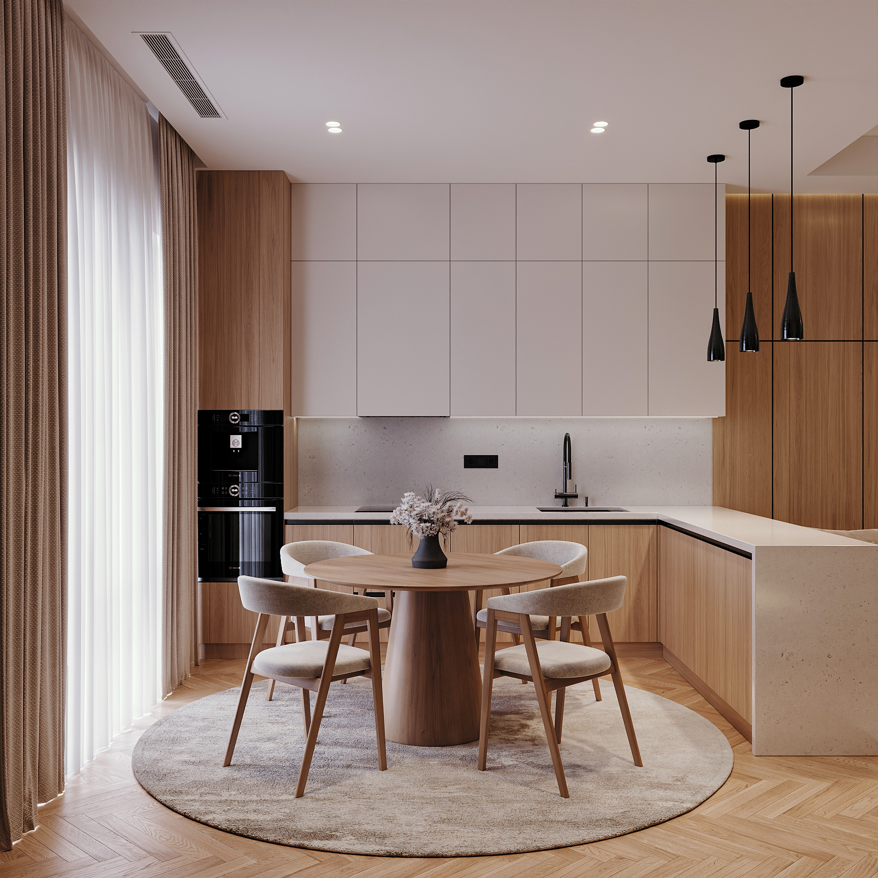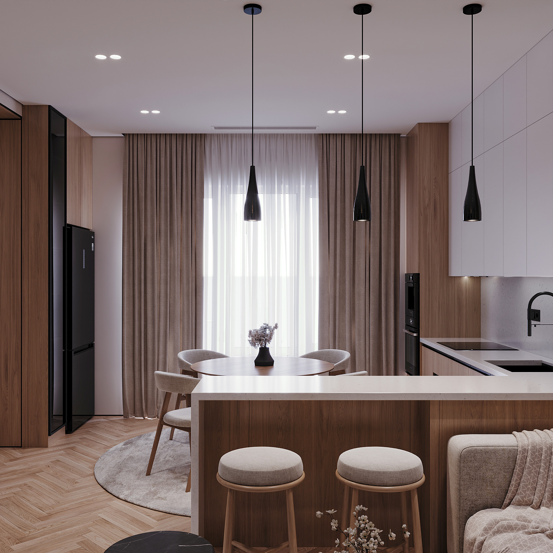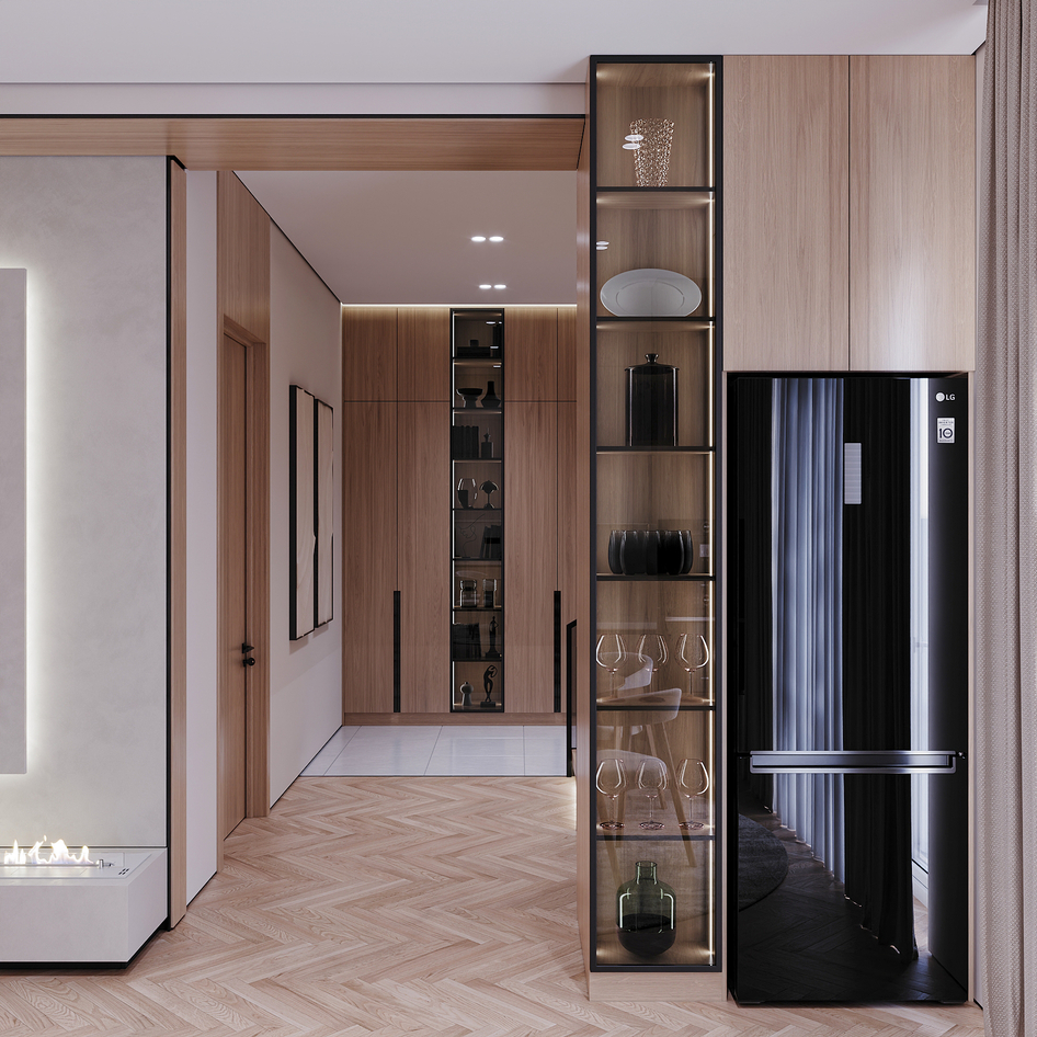 Design for a 2-story residential building located in Tashkent Yunusabad region, 6th quarter. Here is the entrance hall, kitchen and living room. The rest of the rooms are shown in the next section, if you like it, leave a comment