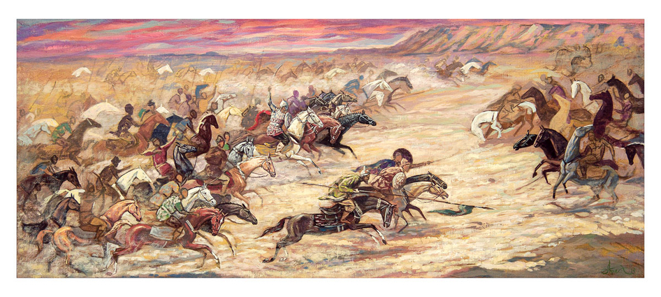 Ощущение такое, что противник просто засмущался от такого натиска. А ведь по сути, это, скорее всего, не так. Если был принят бой, то могут быть следы его развития (затоптанные раненые, упавшие или мечущиеся в шоке лошади, у которых чувство табуна, предлагающее двигаться в потоке, будет правиться всадником). И смотрите по настоящему великих художников батальной живописи, смотрите, как ни странно, композицию комиксов и реальных спортивных сражений, к примеру хоккей. Это поможет понять динамику насступления и представить драматическую завязку сцены.