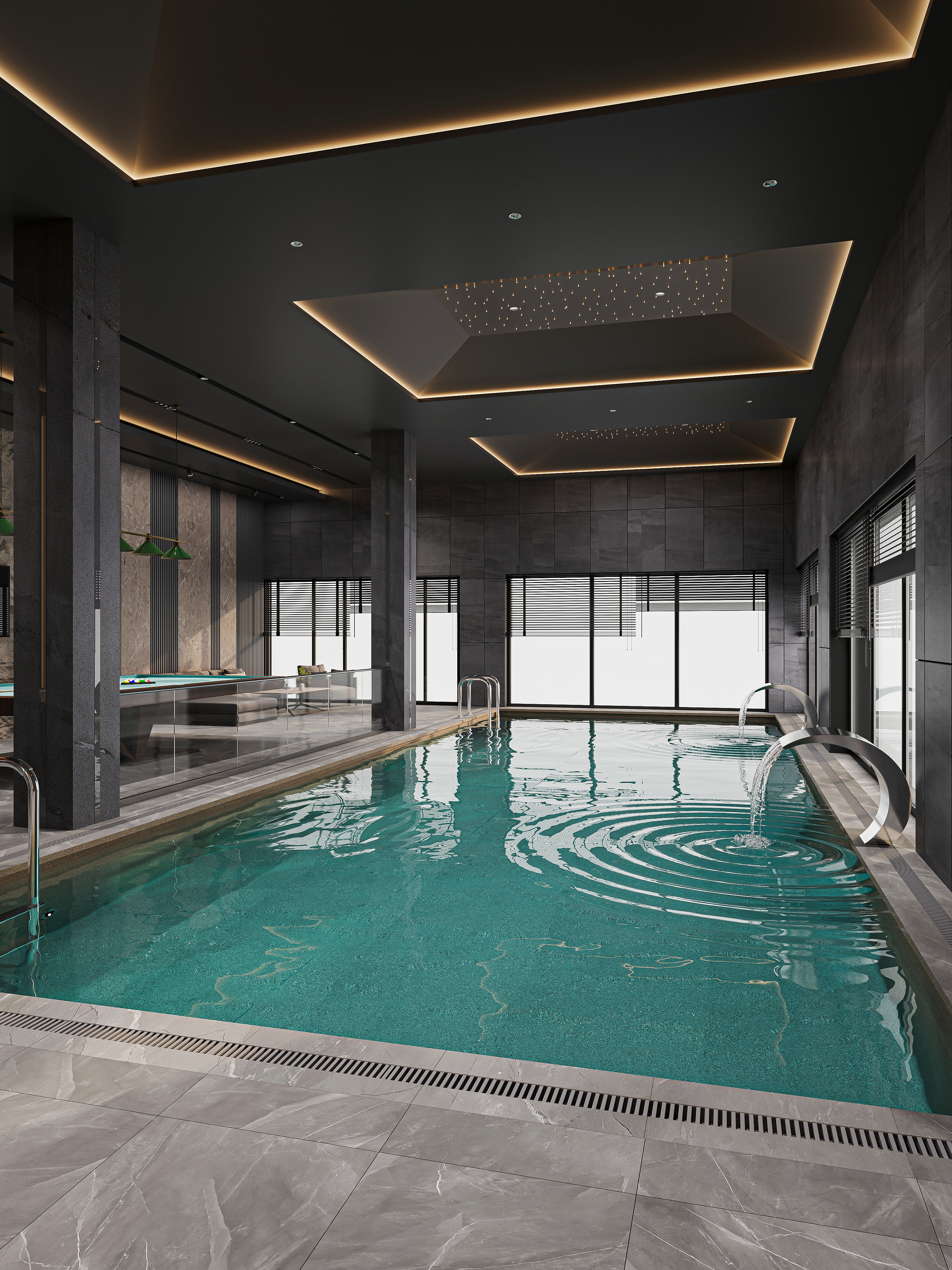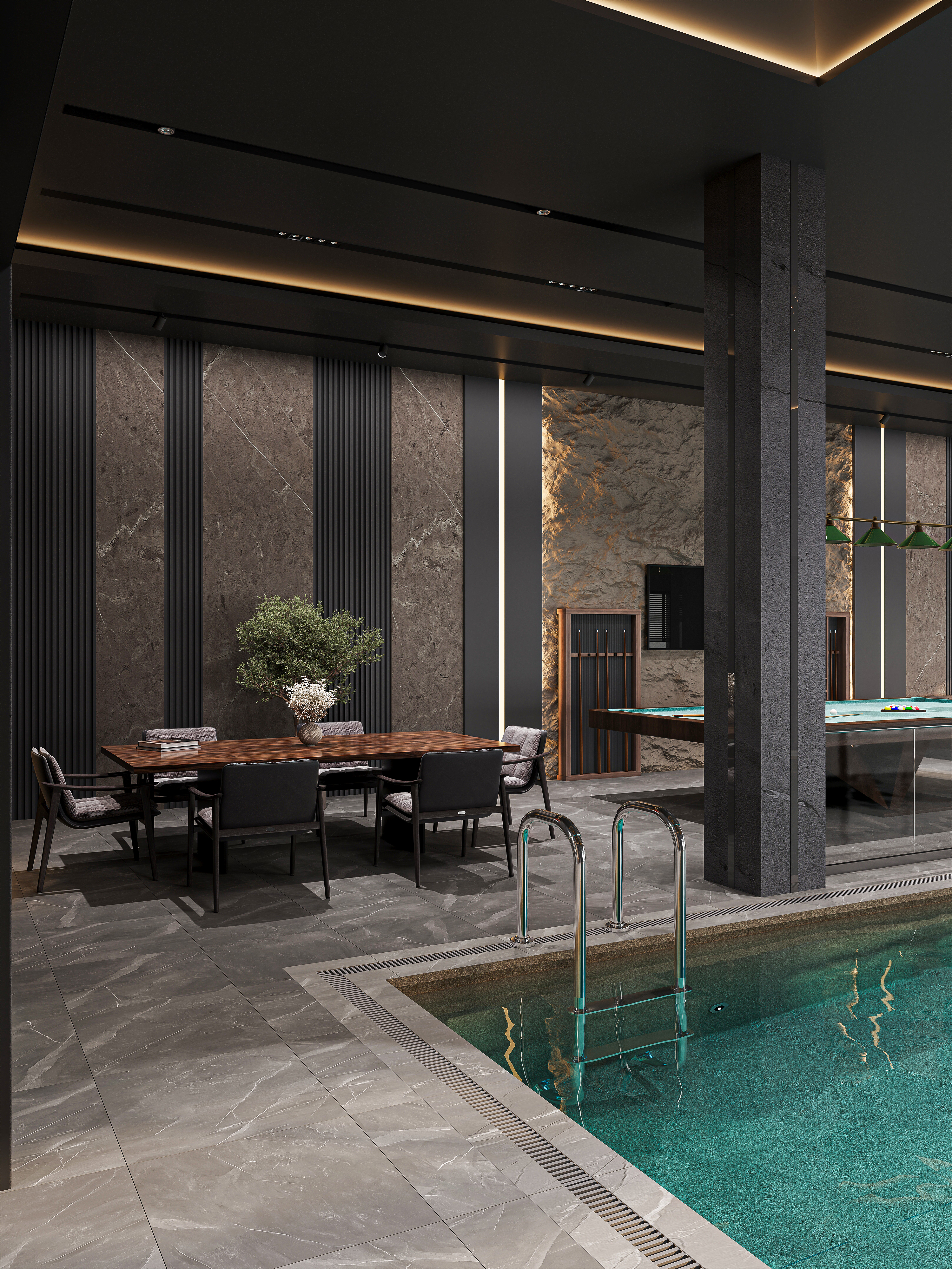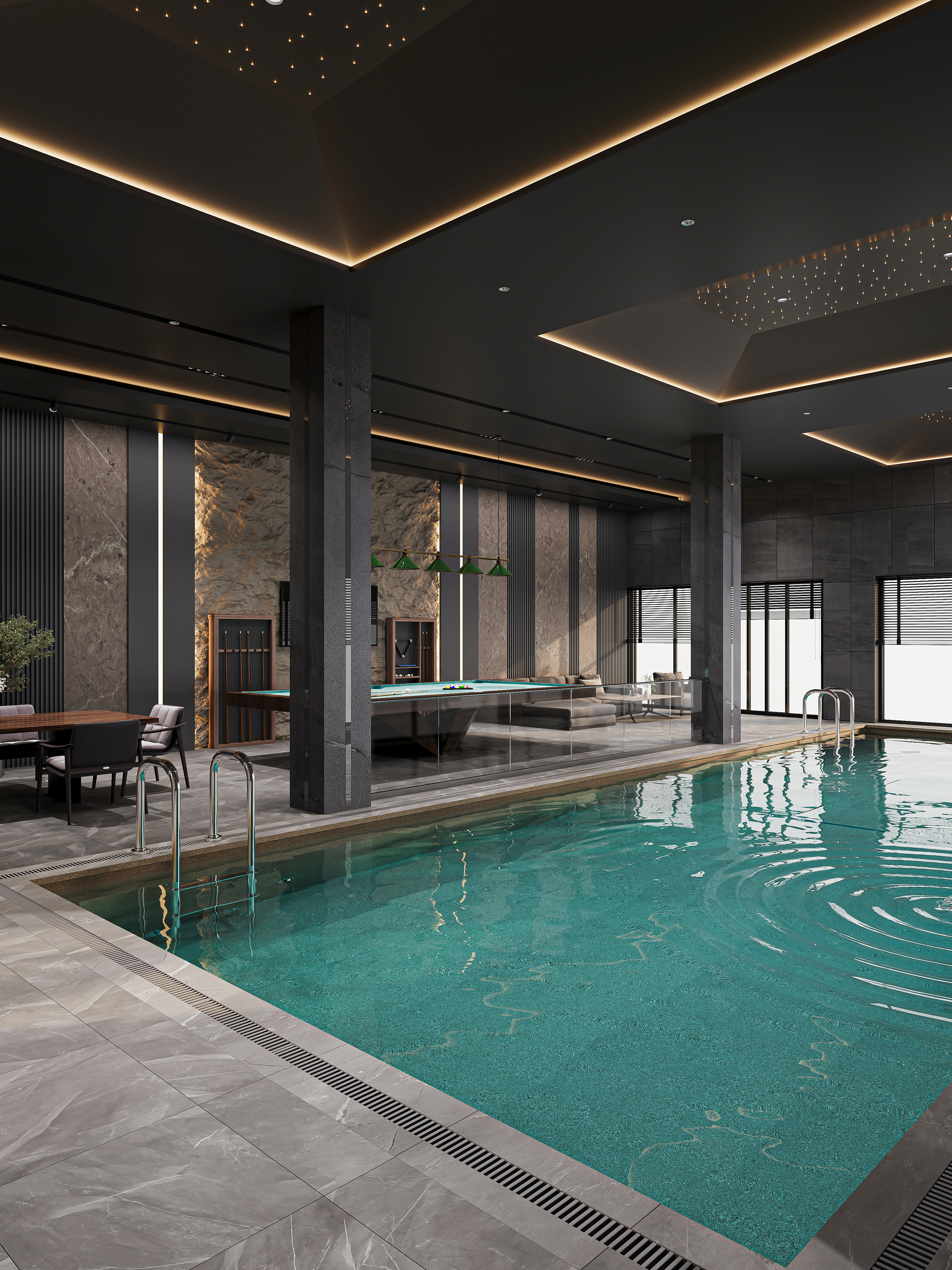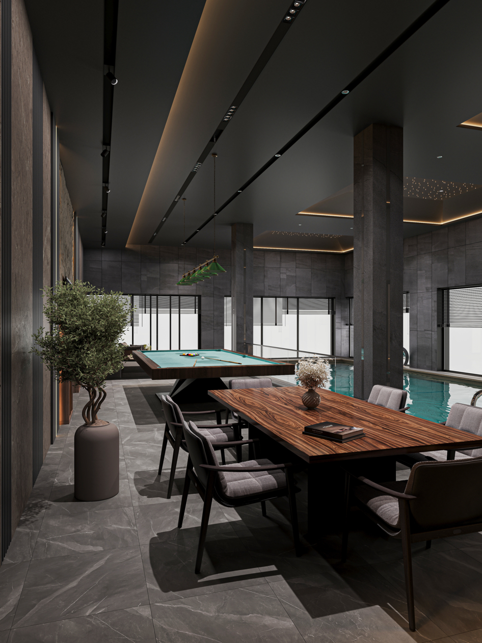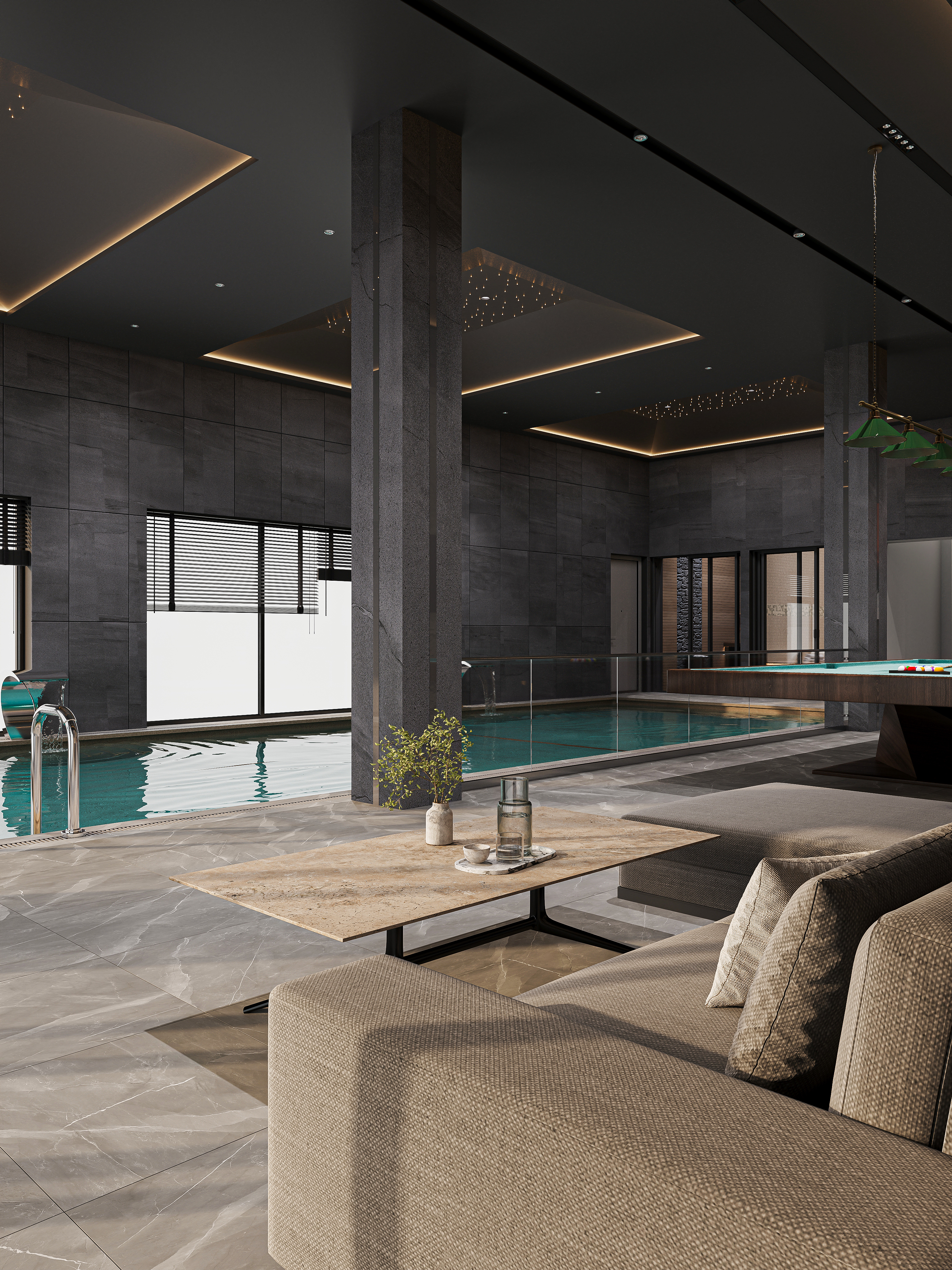 This project presents a modern indoor pool designed in a refined dark style. The space is built around a balance of minimalism and luxury, where deep tones, natural textures, and soft lighting create a calm yet sophisticated atmosphere. The ceiling features integrated linear lighting and subtle star-like spotlights, adding depth and visual interest. Large-format stone walls enhance the premium feel, while vertical light accents emphasize the height of the space. A relaxation zone with comfortable seating and a billiard area complements the pool, turning the interior into a multifunctional leisure environment. Glass partitions maintain openness while clearly defining zones. The water’s turquoise tone contrasts beautifully with the dark surroundings, becoming the central visual highlight of the composition.