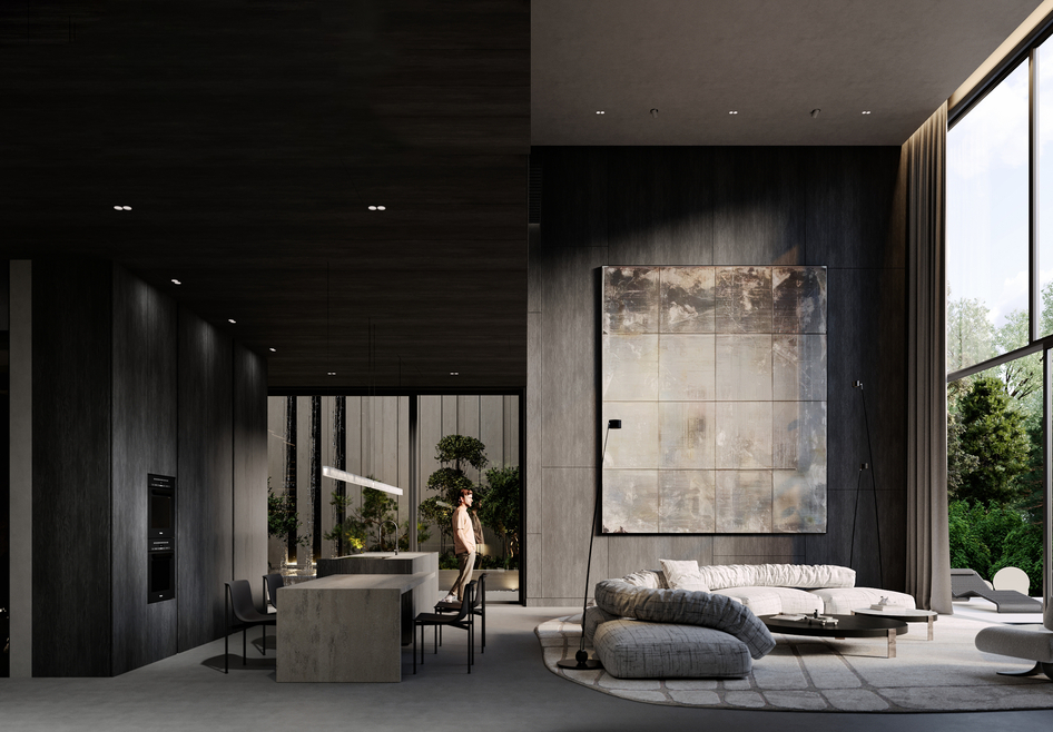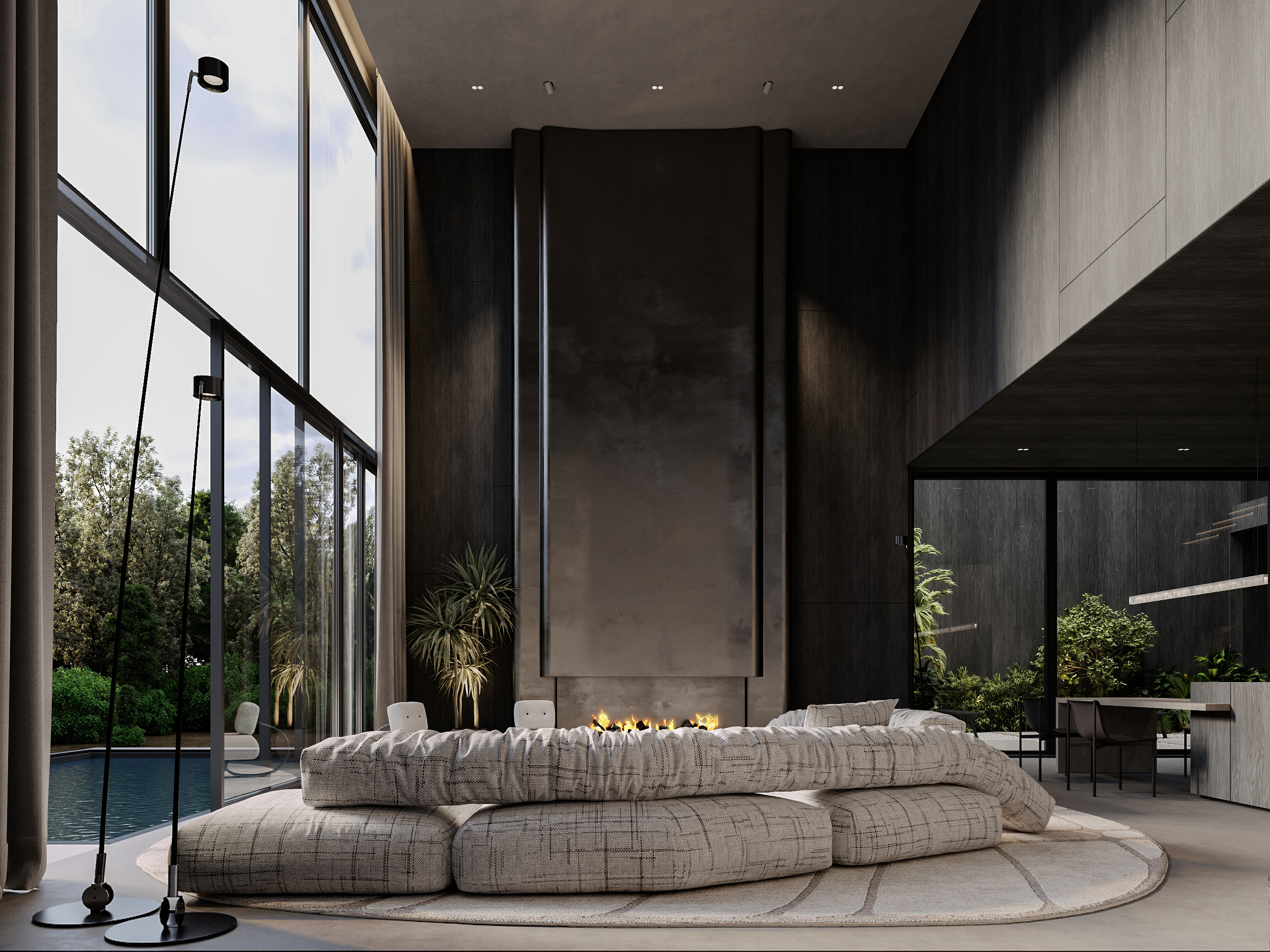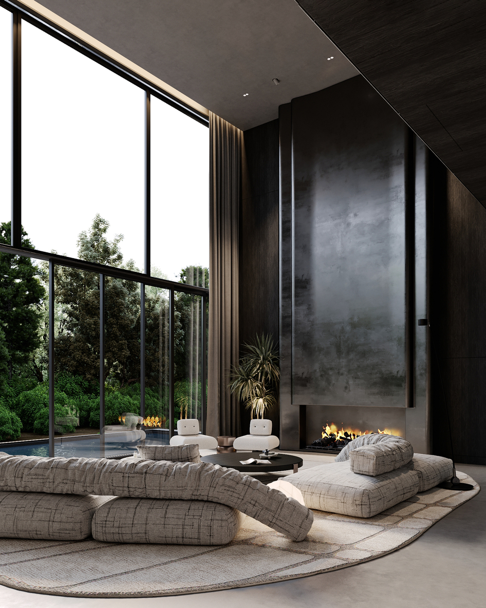 This is the heart of the villa, a unified space where raw power meets refined luxury. The open-concept kitchen and living area is a masterclass in tonal depth and tactile materiality, designed not for mere living, but for profound experience.