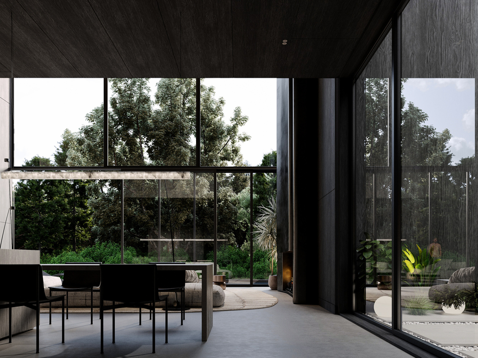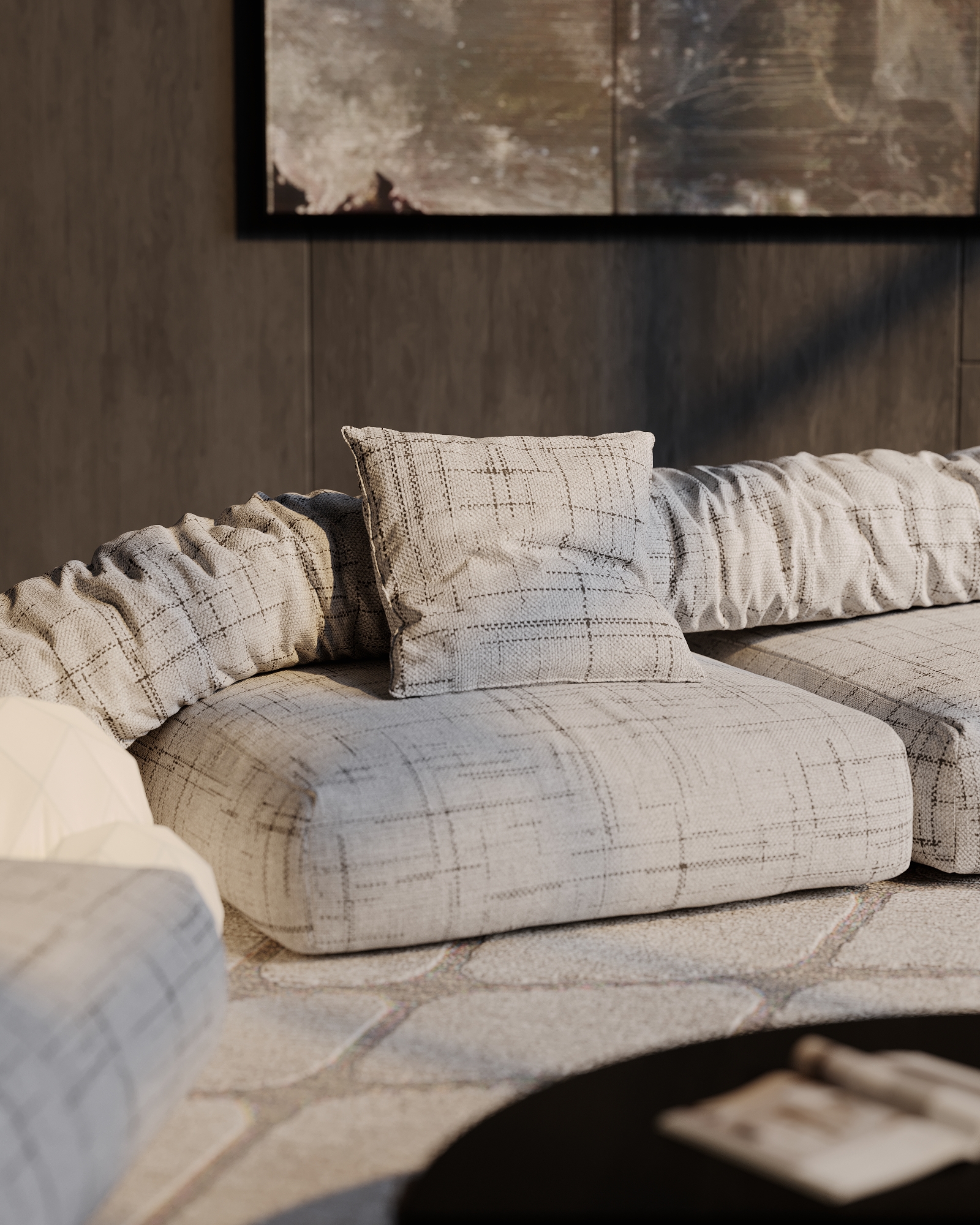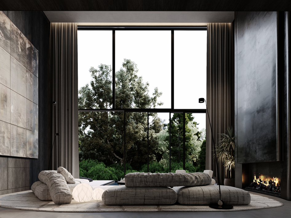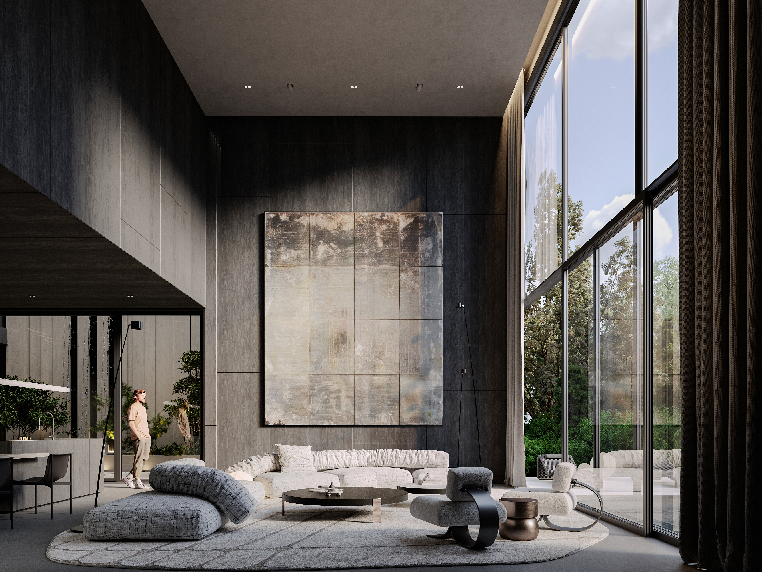 This is the heart of the villa, a unified space where raw power meets refined luxury. The open-concept kitchen and living area is a masterclass in tonal depth and tactile materiality, designed not for mere living, but for profound experience.