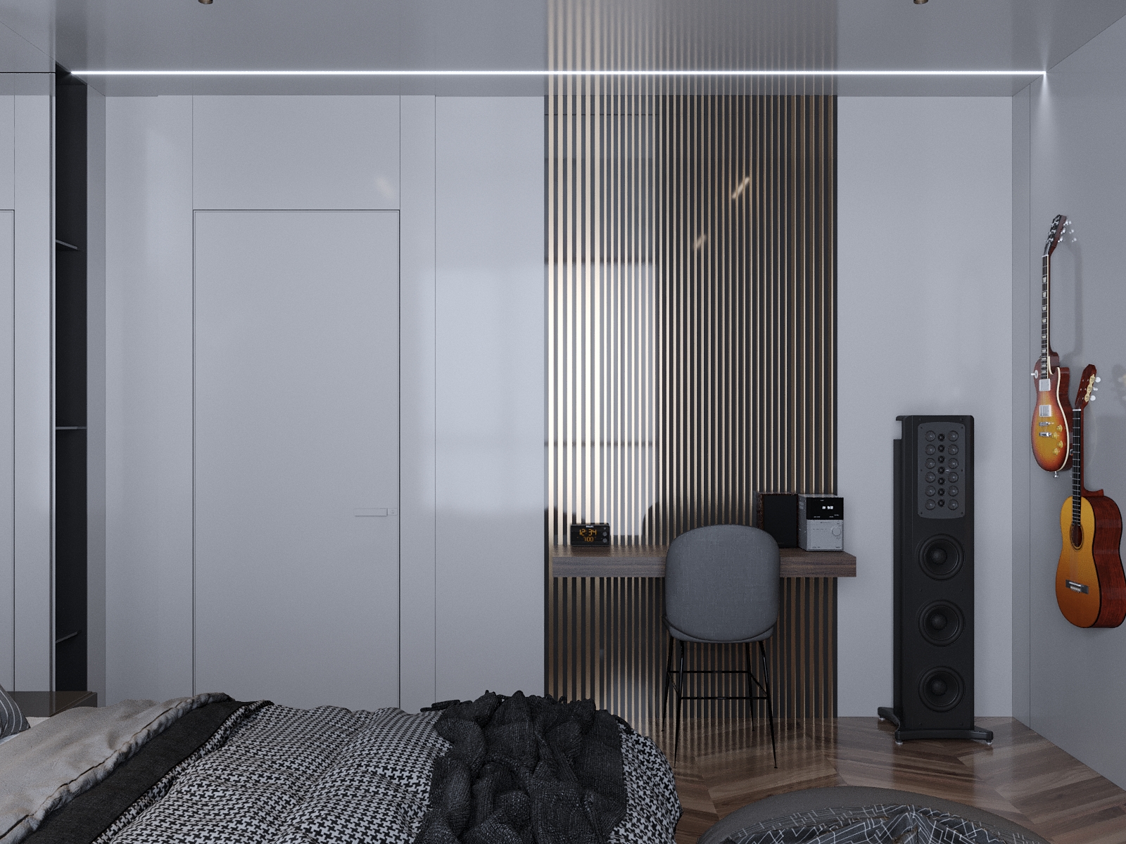 Bedroom design for a young person whose hobby is playing guitar