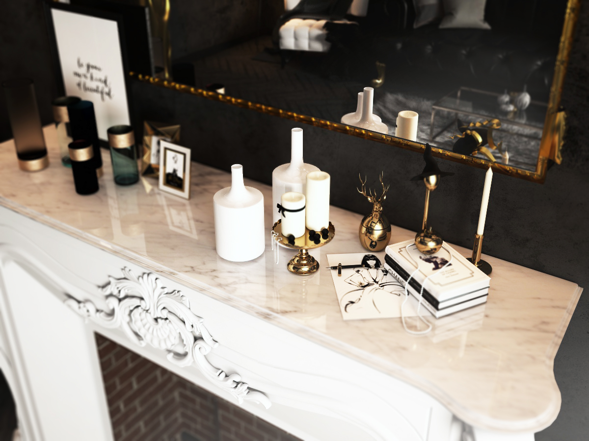 На третьем кадре очень жесткий свет - предметы утратили форму и материалы, - камин, зеркало и основание бра - поэтому выглядят вырезанными или со слетевшими матами.