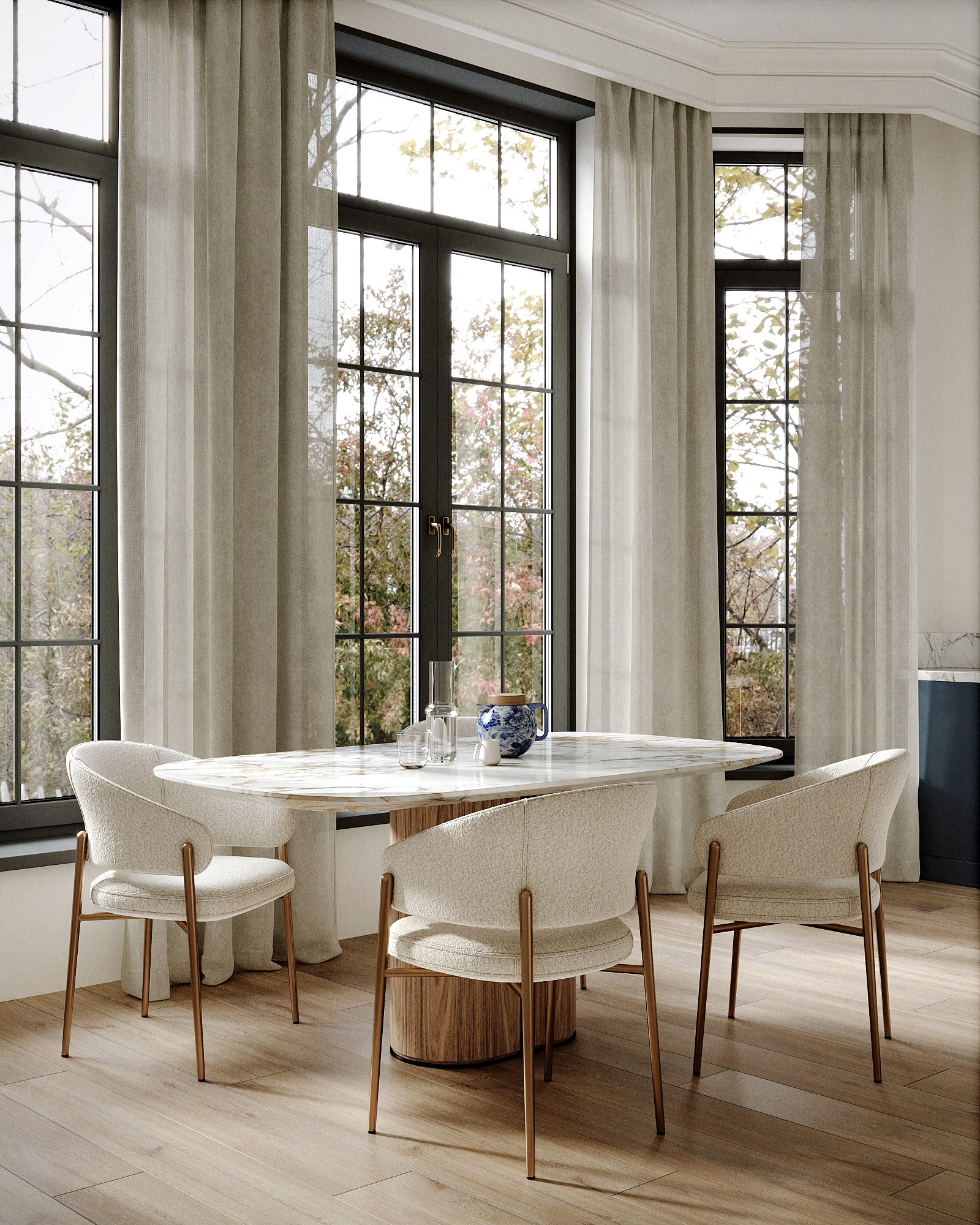 Что мне совсем режет глаза так это грязная (10 лет не стиранная) тюль, как будто ей вытирали лампы собаки после прогулок. И еще. похоже что есть ошибка геометрии в оконных наличниках сверху в эркере.