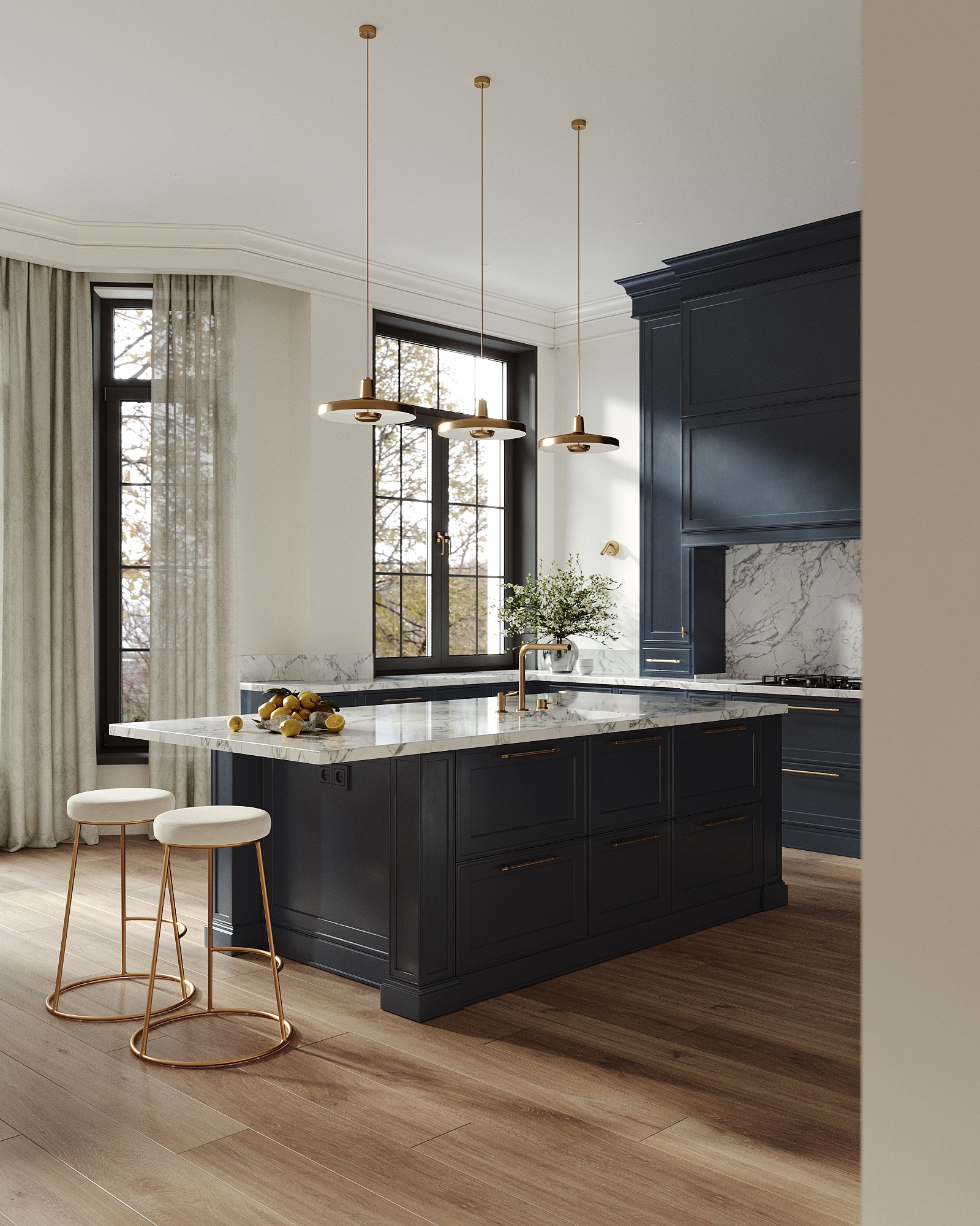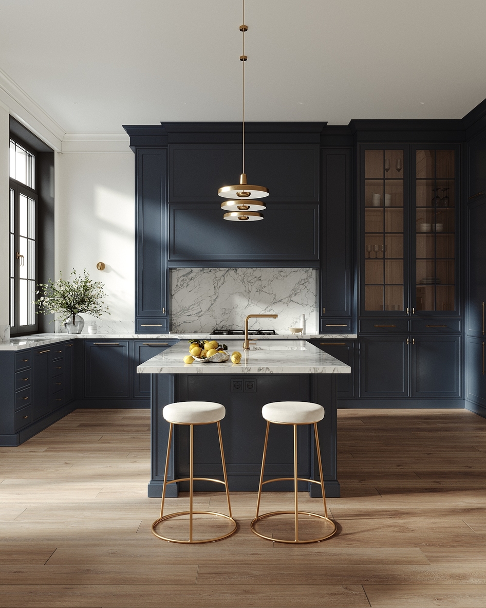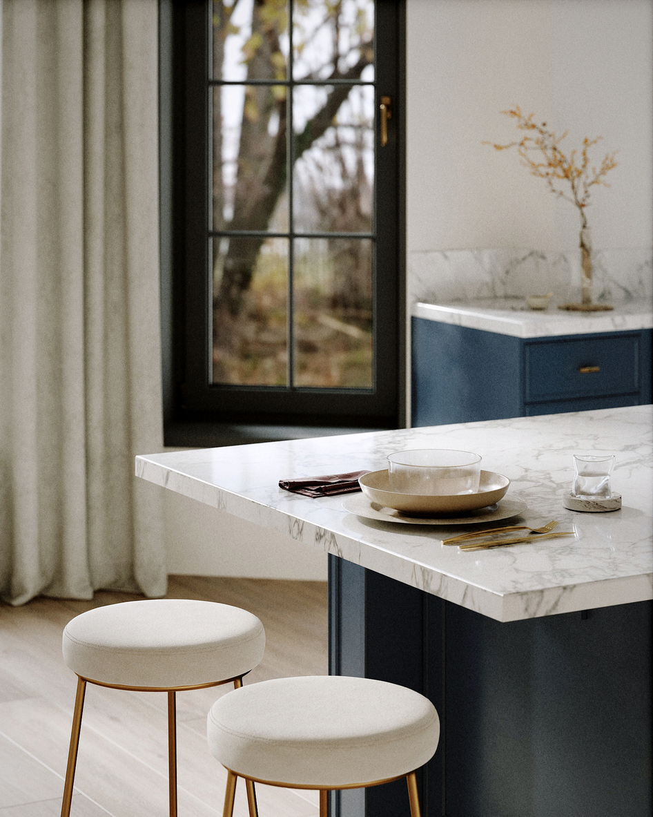 Я лично не понимаю зачем вы развернули остров. Он намного лучше станет вдоль кухни, и можно будет с внешней стороны поставить больше барных стульев. А то 2 штуки это совсем бюджетно. Почему то нет духовки, а только варочная панель. Тоже бюджетно выглядит. И стол с 4мя стульями как не из этой оперы. И 3 лампы тут не нужны, они слишком плотно висят.