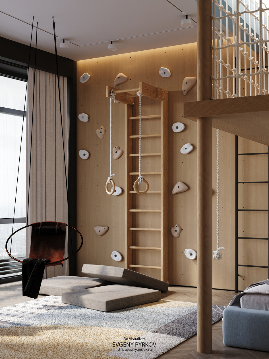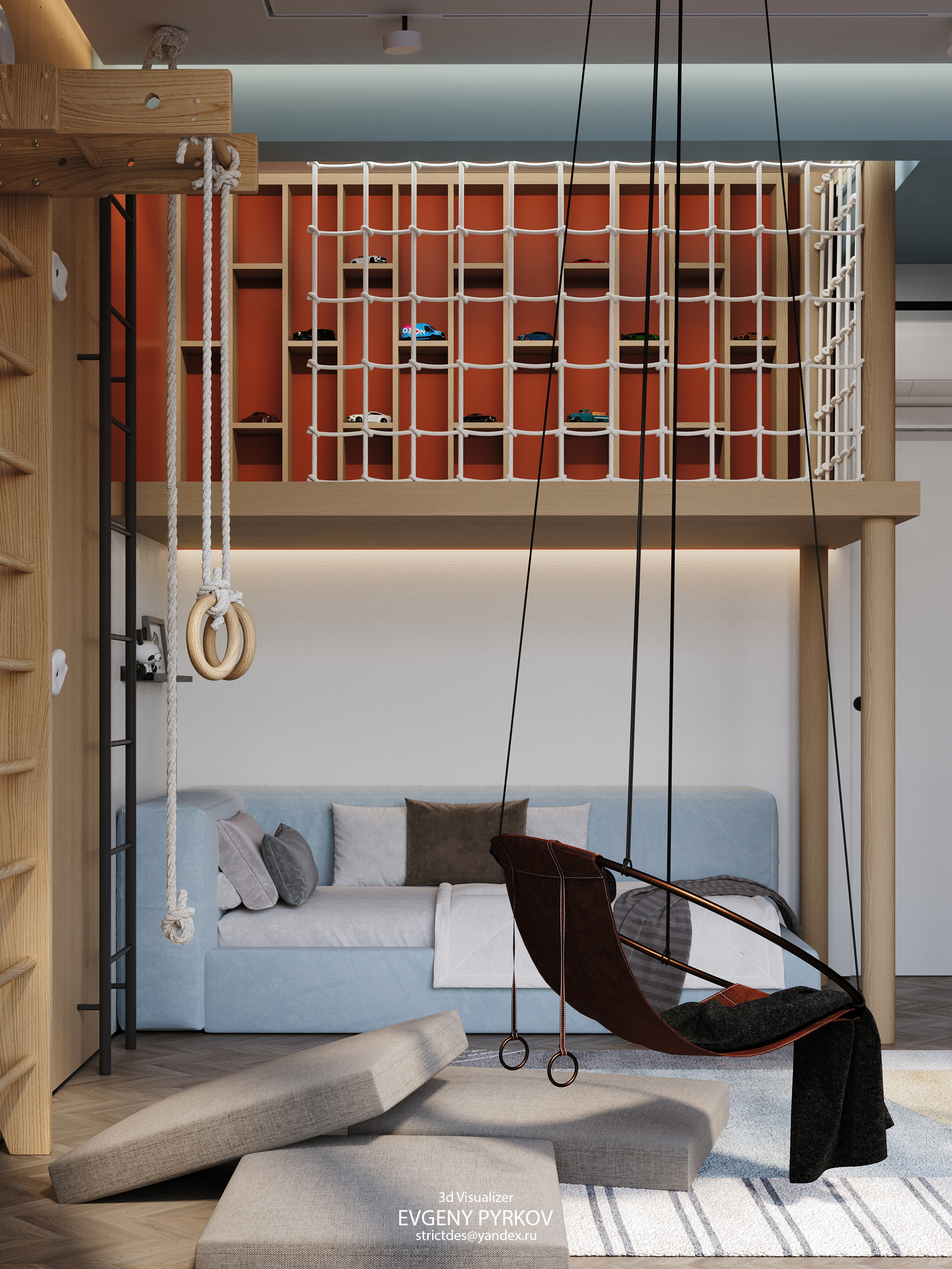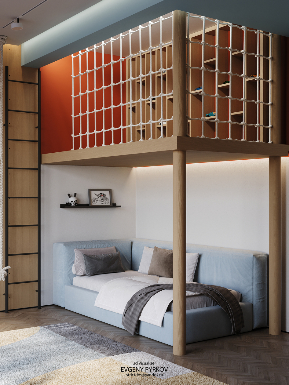 Не пойму на какой это возраст? Кровать большая, игровая зона на парня лет 8-10 точно. Но стол и стул как для 4-6 лет. Места под ПК нет т.е. дошкольник похоже. Ну если это дошкольник то он что полезет по этой стене? Выглядит это все так. как будто вы о детях ничего не знаете и просто налепили все что понравилось из библиотек моделей.