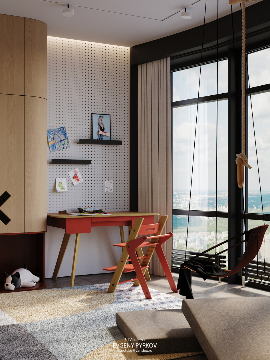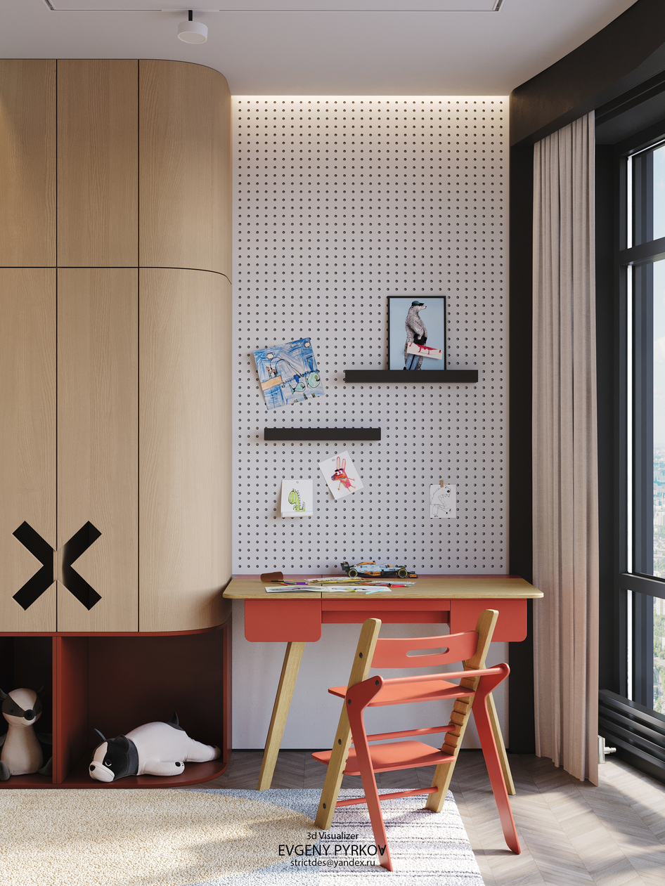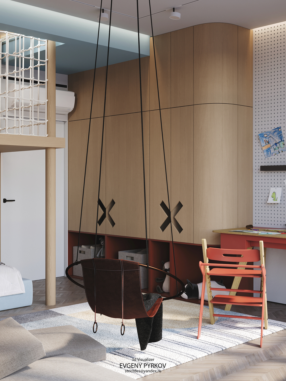 Не пойму на какой это возраст? Кровать большая, игровая зона на парня лет 8-10 точно. Но стол и стул как для 4-6 лет. Места под ПК нет т.е. дошкольник похоже. Ну если это дошкольник то он что полезет по этой стене? Выглядит это все так. как будто вы о детях ничего не знаете и просто налепили все что понравилось из библиотек моделей.