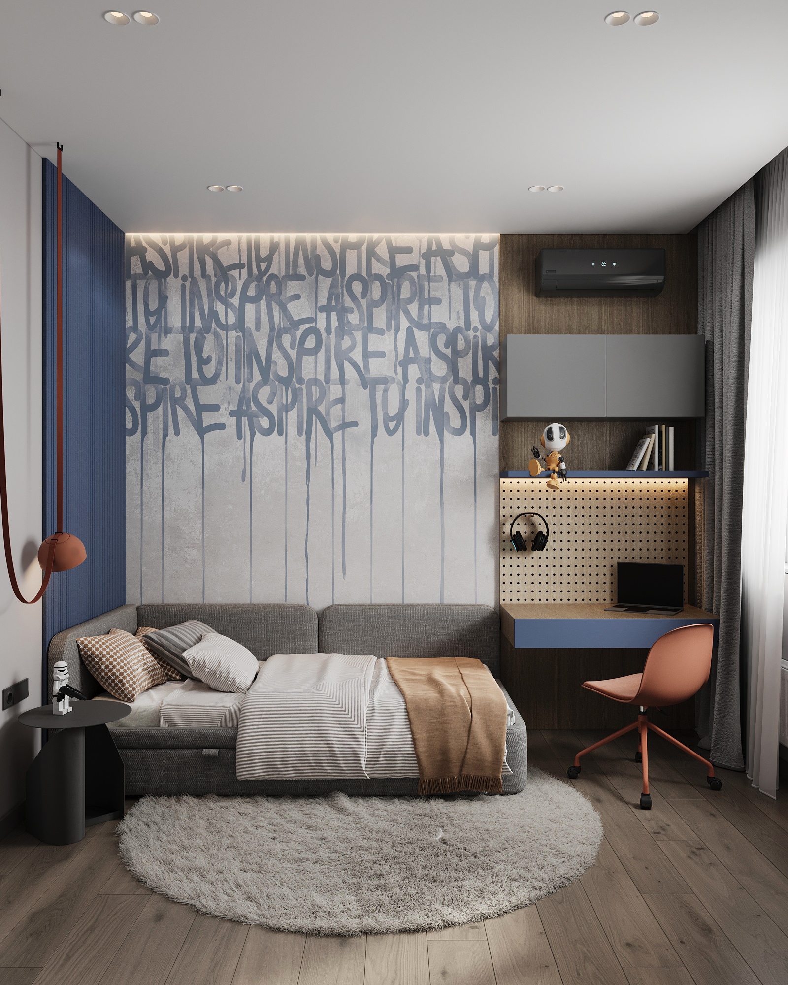 Рельефную синюю панель бы убрать, посвежее будет. Синий как раз можно добавить вместо темного дерева за кондиционером. Этот так...бросилось в глаза