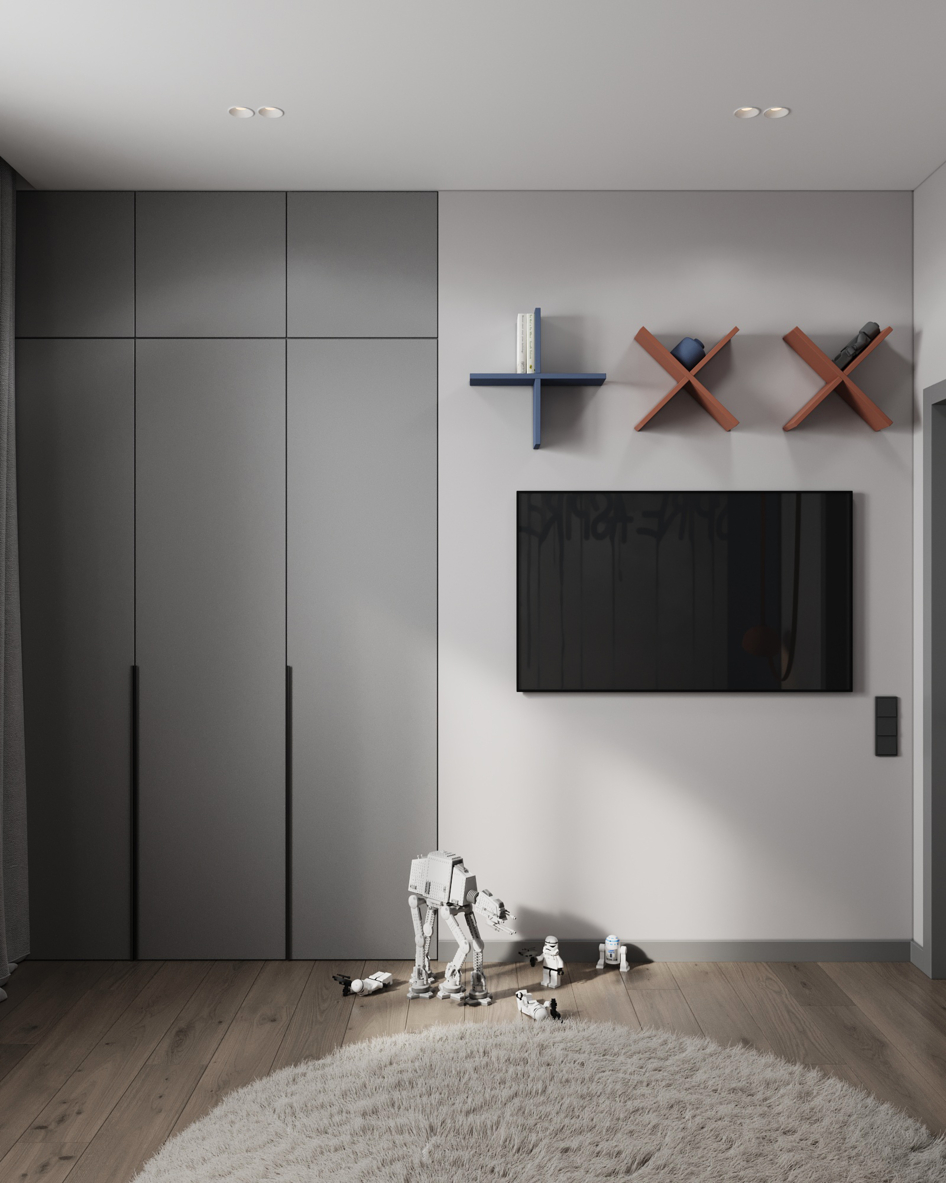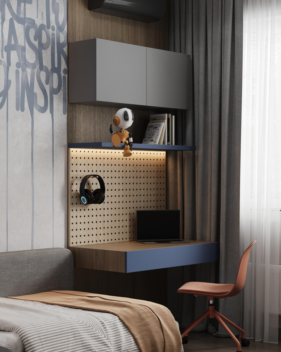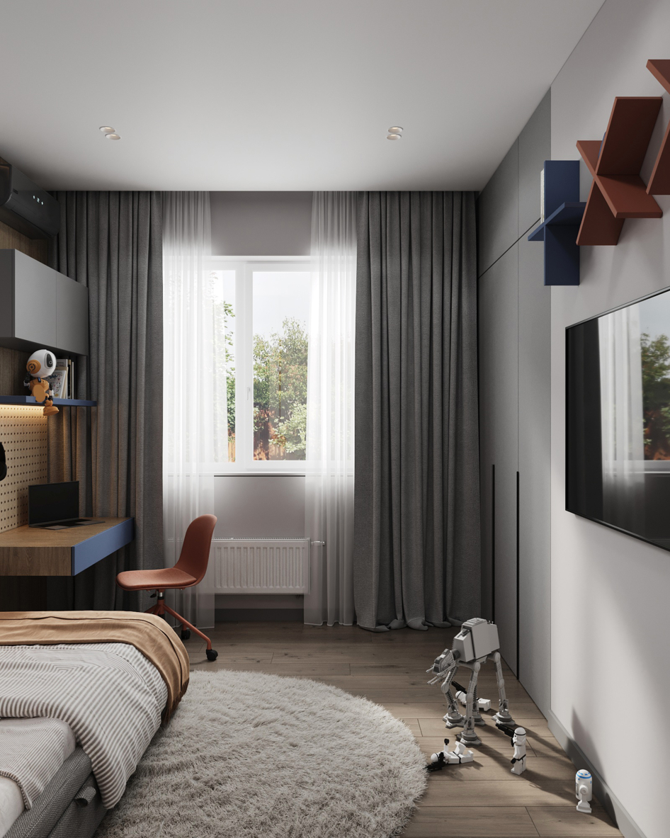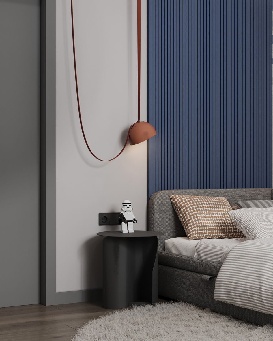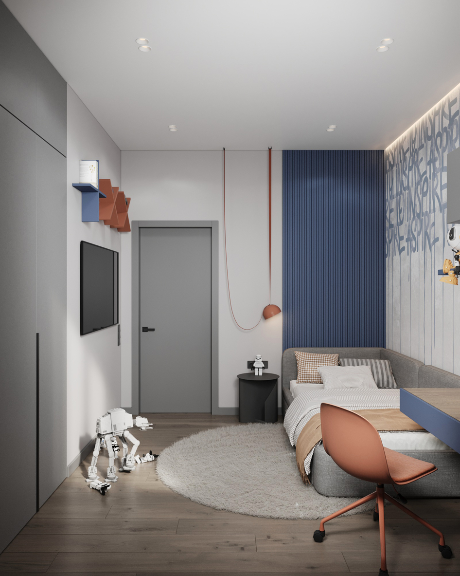 Насчет дерева соглашусь, возможно, нужно было заменить на что то, но вот синяя панель на мой взгляд не сильно грузит комнату