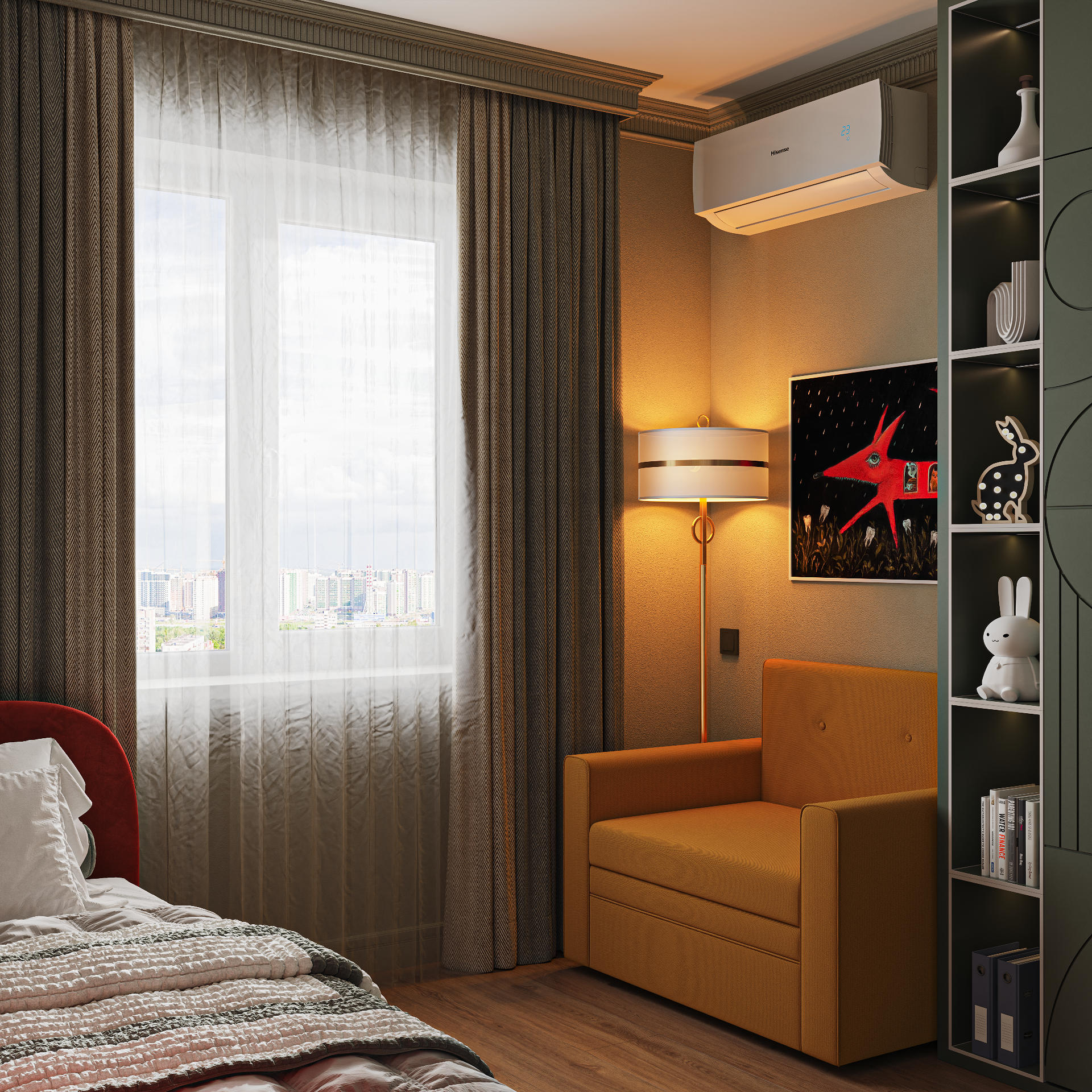 По визу. Штора тюль перемята, бэк за окном немного утяжеляет, лучше просто белый оставить, торшер почти в стене ему нет места и грустно, на кондёре цифру 23 лучше либо выключить либо ярче сделать, набор предметов в шкафу то ли для бабушки, то ли для археолога, на кровати слишком много текстиля, текстуру золота заменить везде.