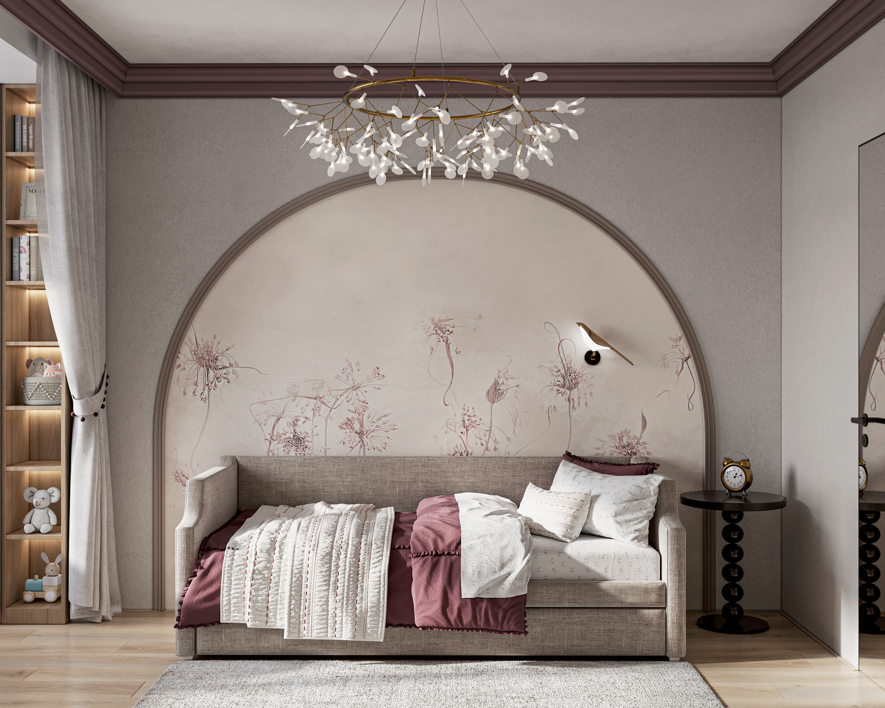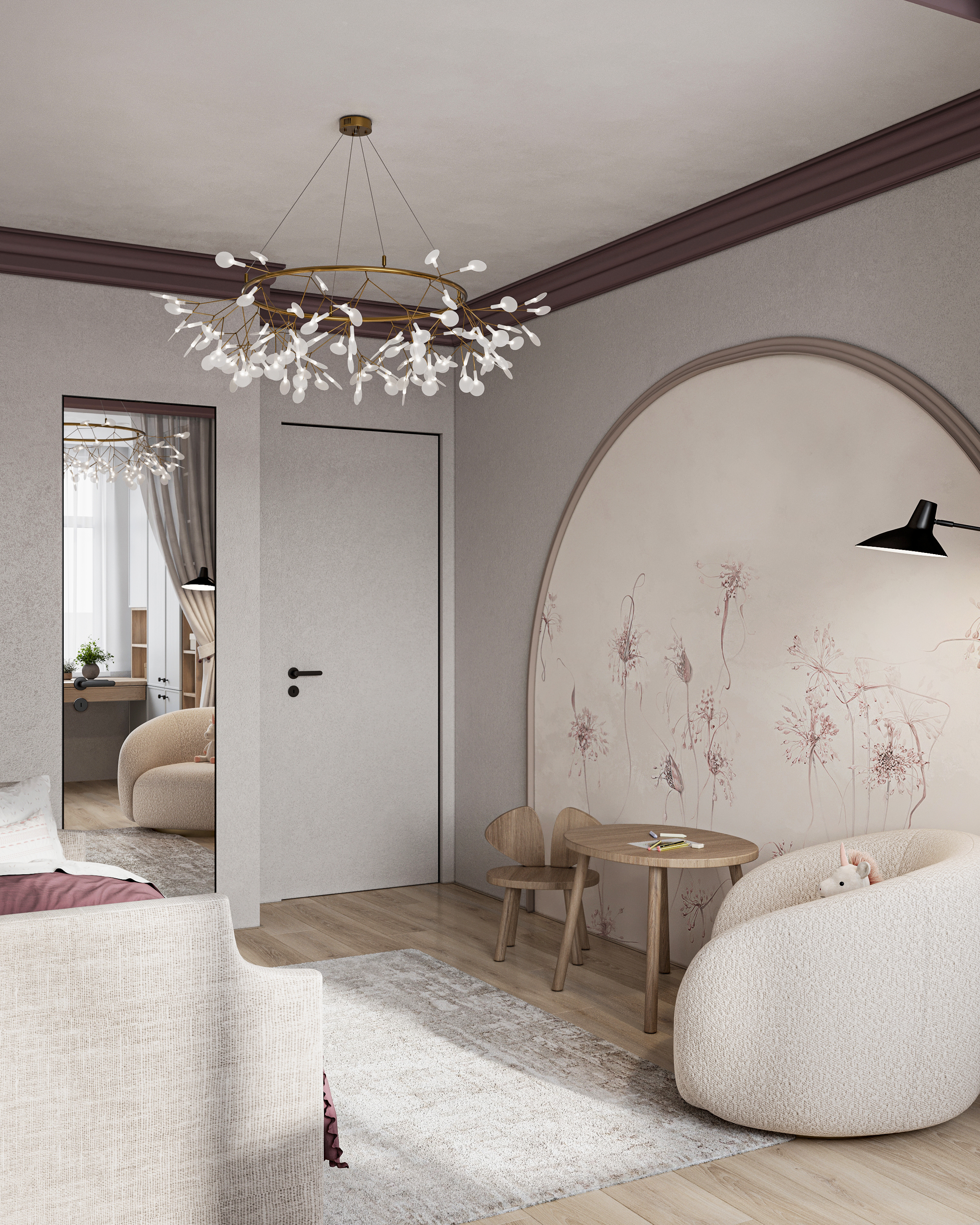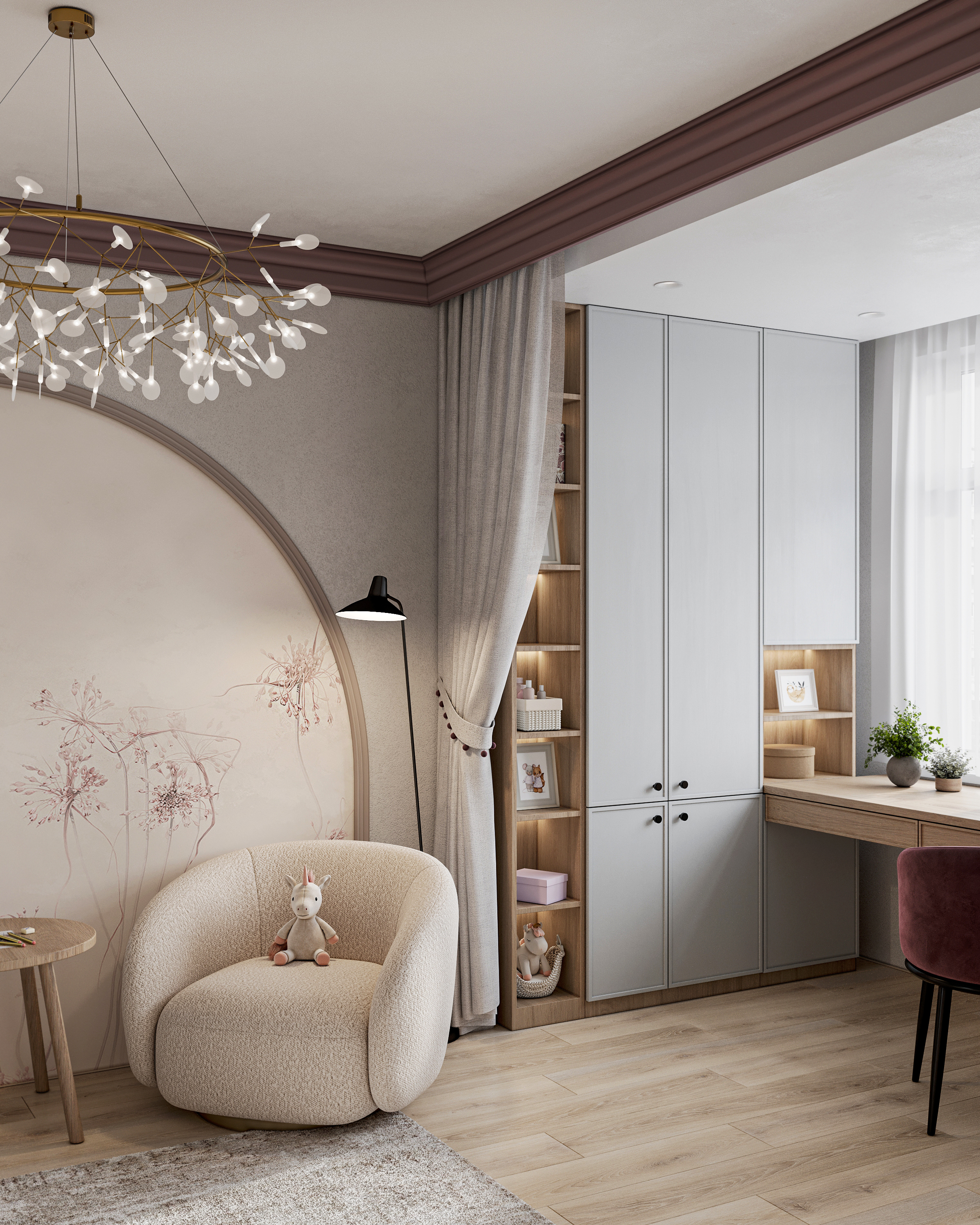 Уютная детская комната. Шторы создают визуальное разделение между игровой и учебной зонами, что помогает ребенку сосредоточиться на учебе, когда это необходимо. Предусмотрена зона для творчества. Таким образом, такая комната не только функциональна, но и способствует развитию ребенка, создавая подходящие условия для игр, учебы и отдыха.