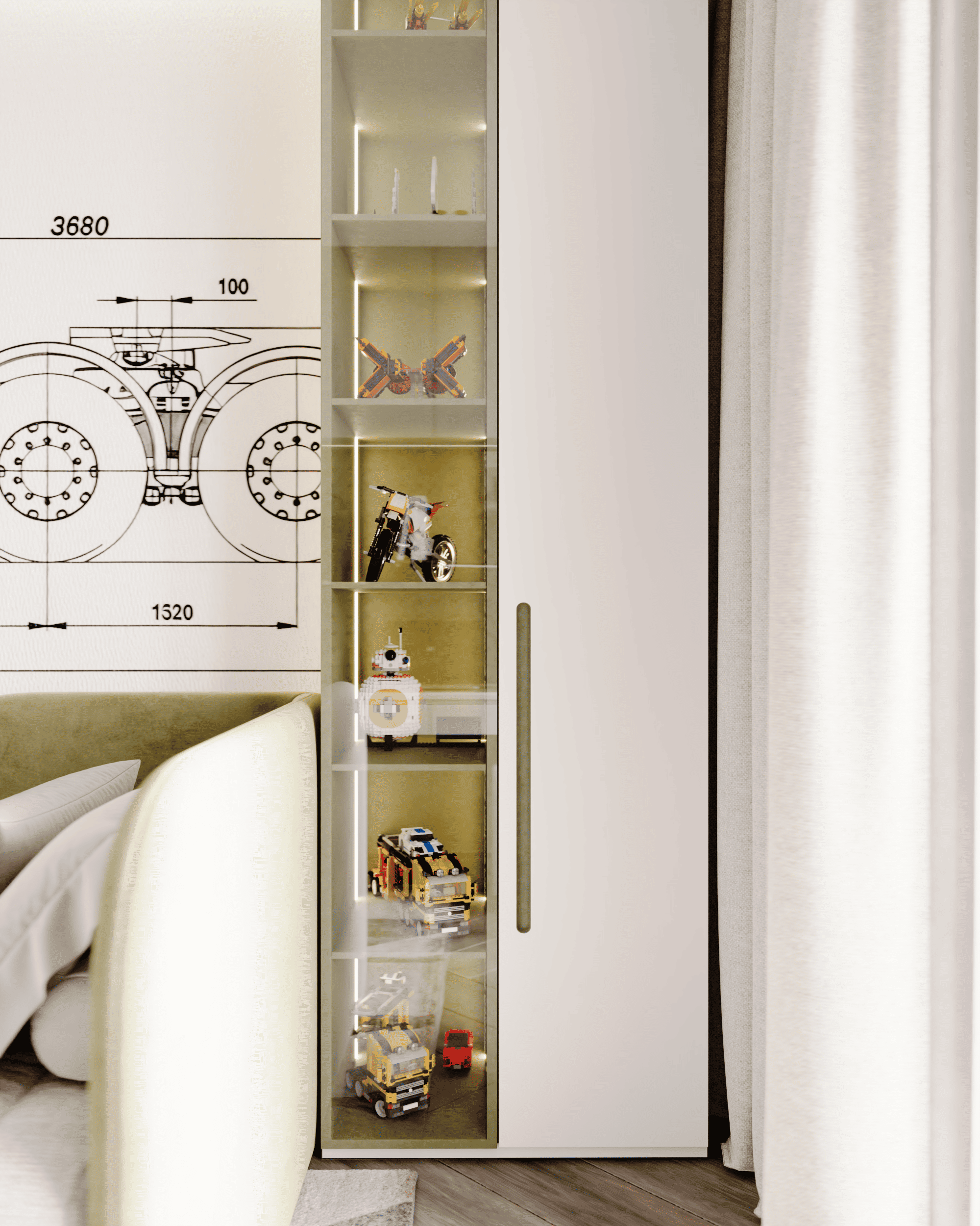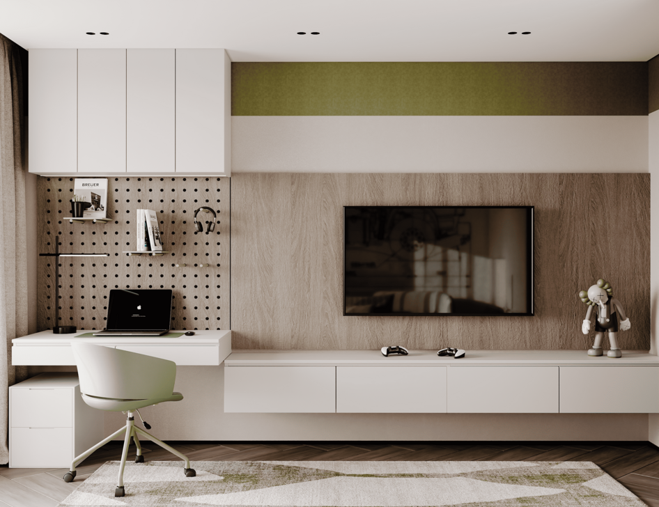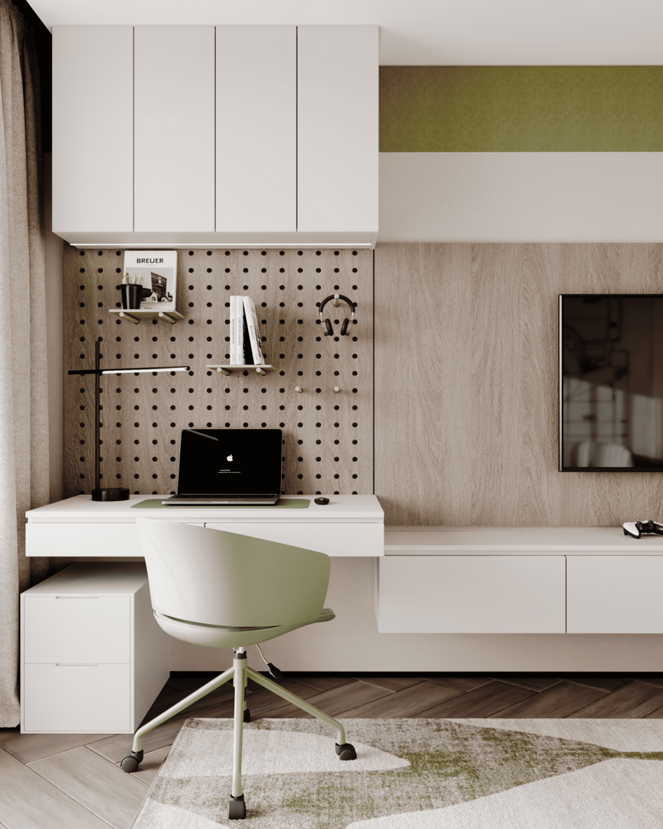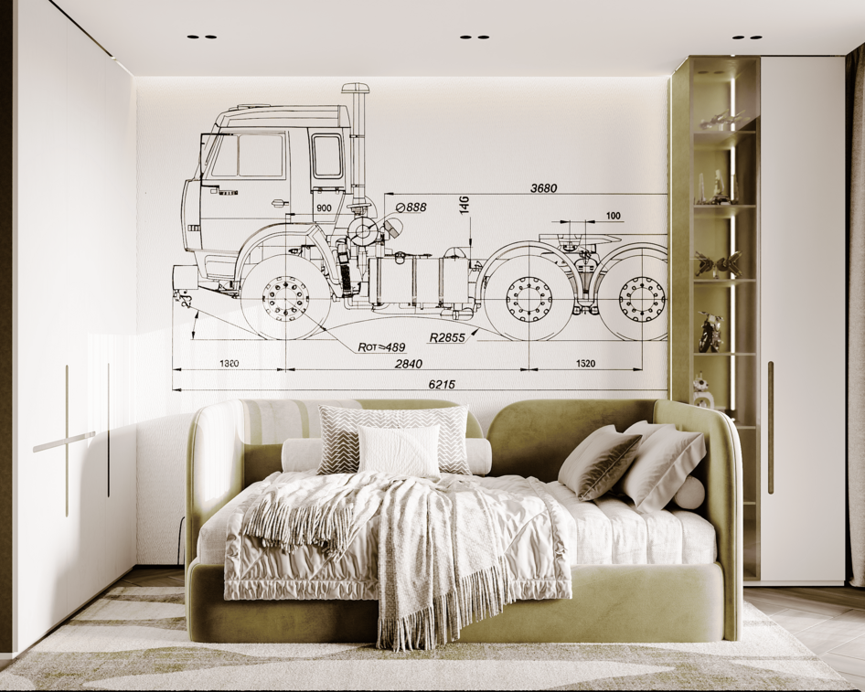 Милая и уютная детская комната для мальчика 10 лет, выполнена в оливковых оттенках с добавлением деревянных элементов, в исполнении перфорированной панели на рабочей зоне и тв зоне. Юный заказчик очень любит грузовые машины и лего, поэтому в зону кровати украшают обои с "Камазом".