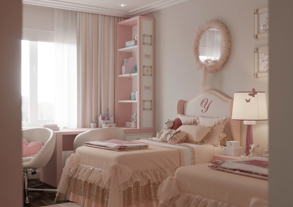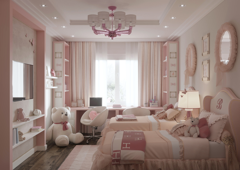 приятный рендер некоторые элементы особо удались - понравилось зеркало с бантиком и текстиль на кровати. Из недочетов- фон за окном и взлетевший медведь не сглаженный.