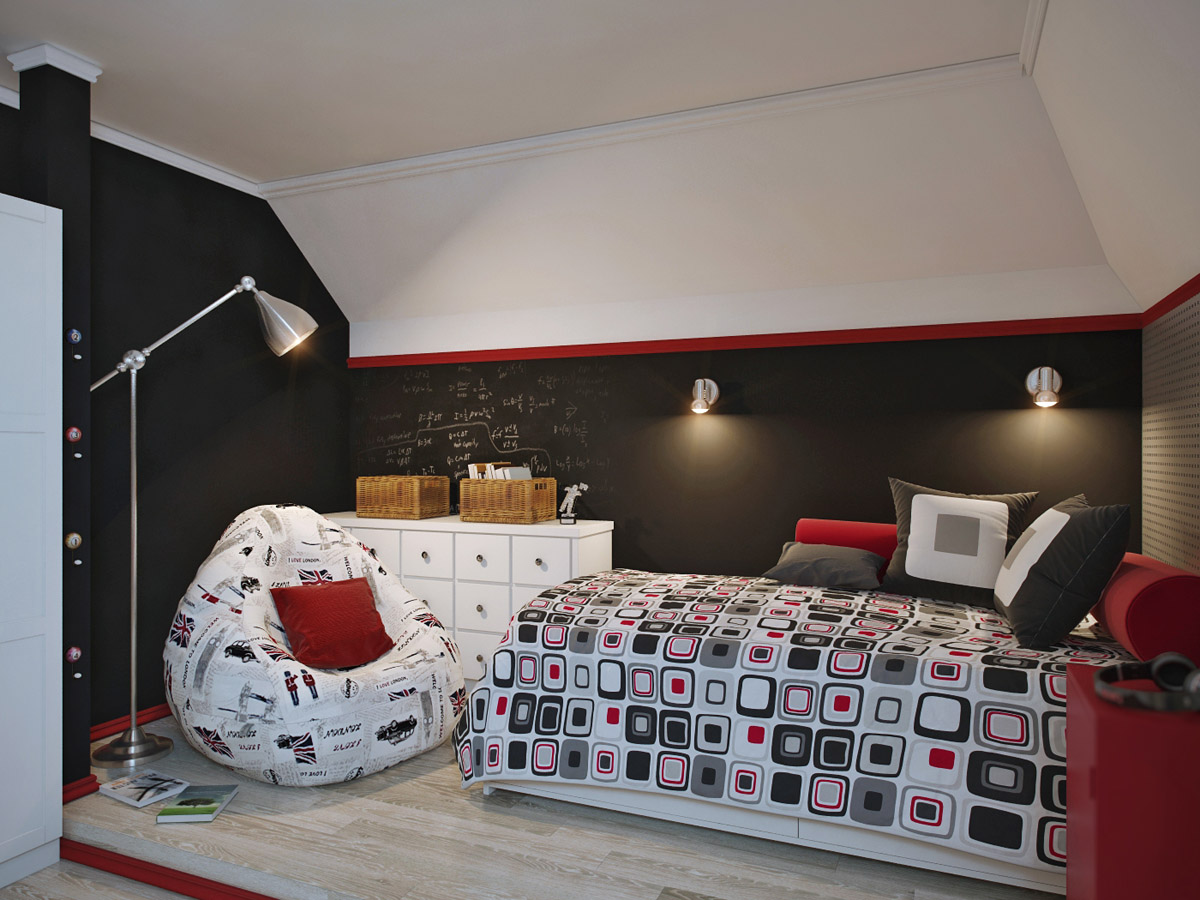 меня тут рвали на куски за красную стену в санчике а черные стены в детской хвалите. с ума чтоли посходили? Куда ребенку красно черная гамма? с красным цветом ставили эксперименты на щенках, они потом психованными становились. Светильники над кроватью будут светить прямо в глаза. потолочные профиля в мансардах клеятся только к потолку, тк если приклеить к стене, то они не стыкуются. порог перед кроватью - отличный спотыкач.