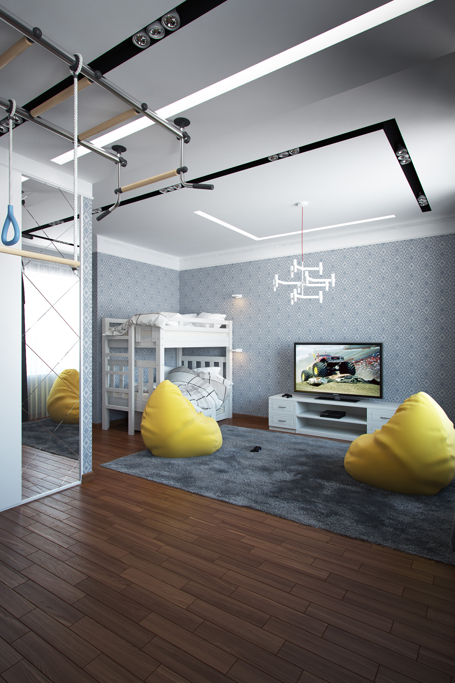 Если это детская не значит что туда кроме ребенка ничья нога не ступит) может папаня тоже захочет там развалиться, футбол погонять) Не думаю, что в детской принципиальны разноцветные решения, игрушки и так разукрасят его интерьер. Правильно Обама подметила на счет брутальных парней, т.к. цвет воспитывает характер в некоторой степени.