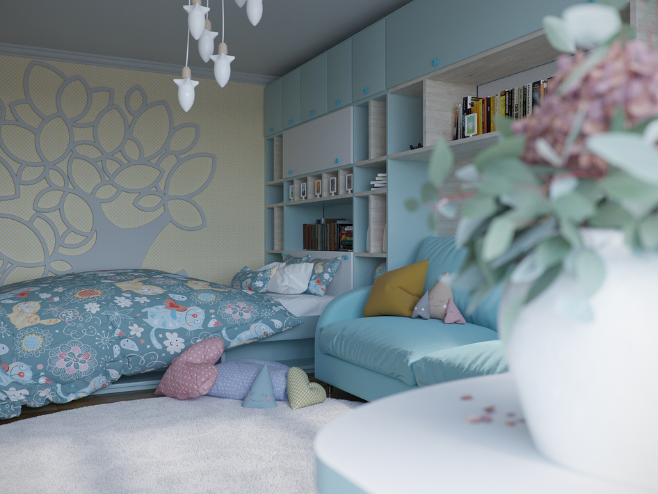 Сглаживание на шкафчиках надо бы поправить и к дивану эдит поли применить, а так - не плохая комнатка со свеженькой гаммой.