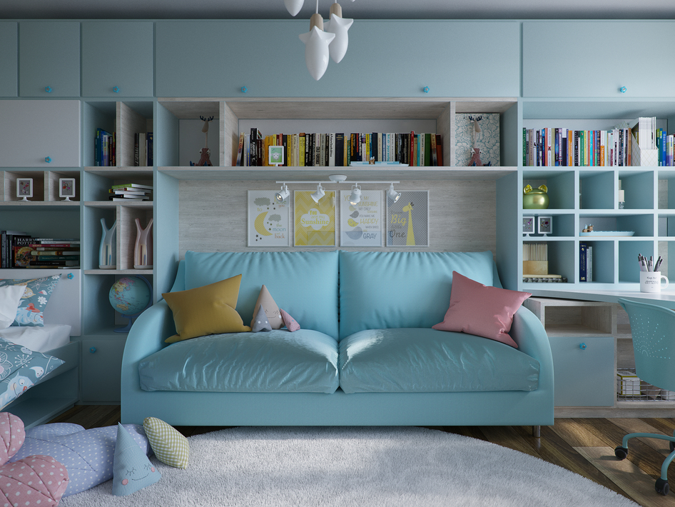Текстура дерева в третьем ракурсе не верно лежит,режет глаз белый плинтус и тёмный пол,слишком много открытых полок. Двоякое впечатление вроде и ничего,а вроде и не понятно кто хозяин, мальчик или девочка?