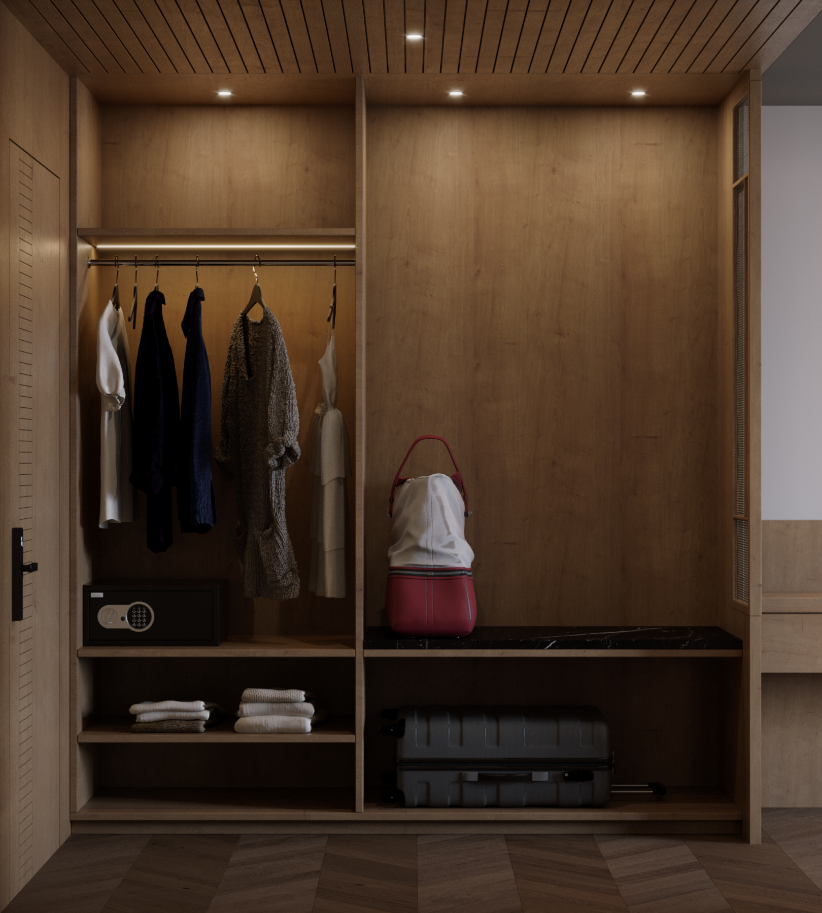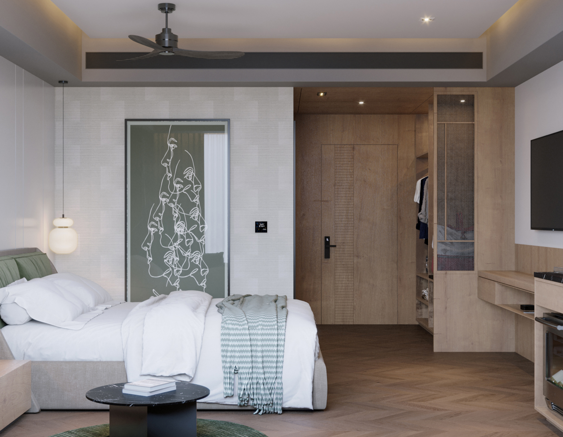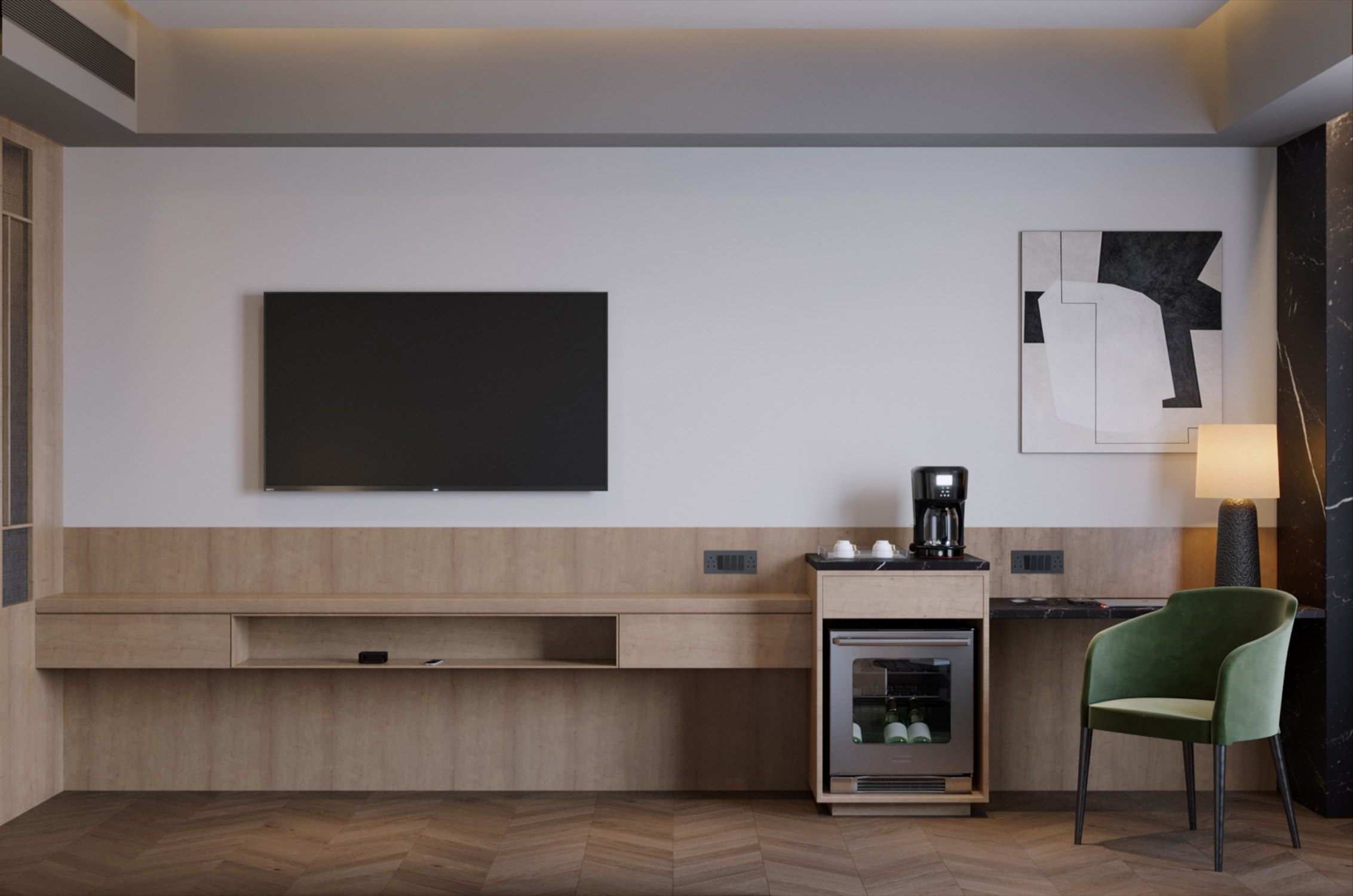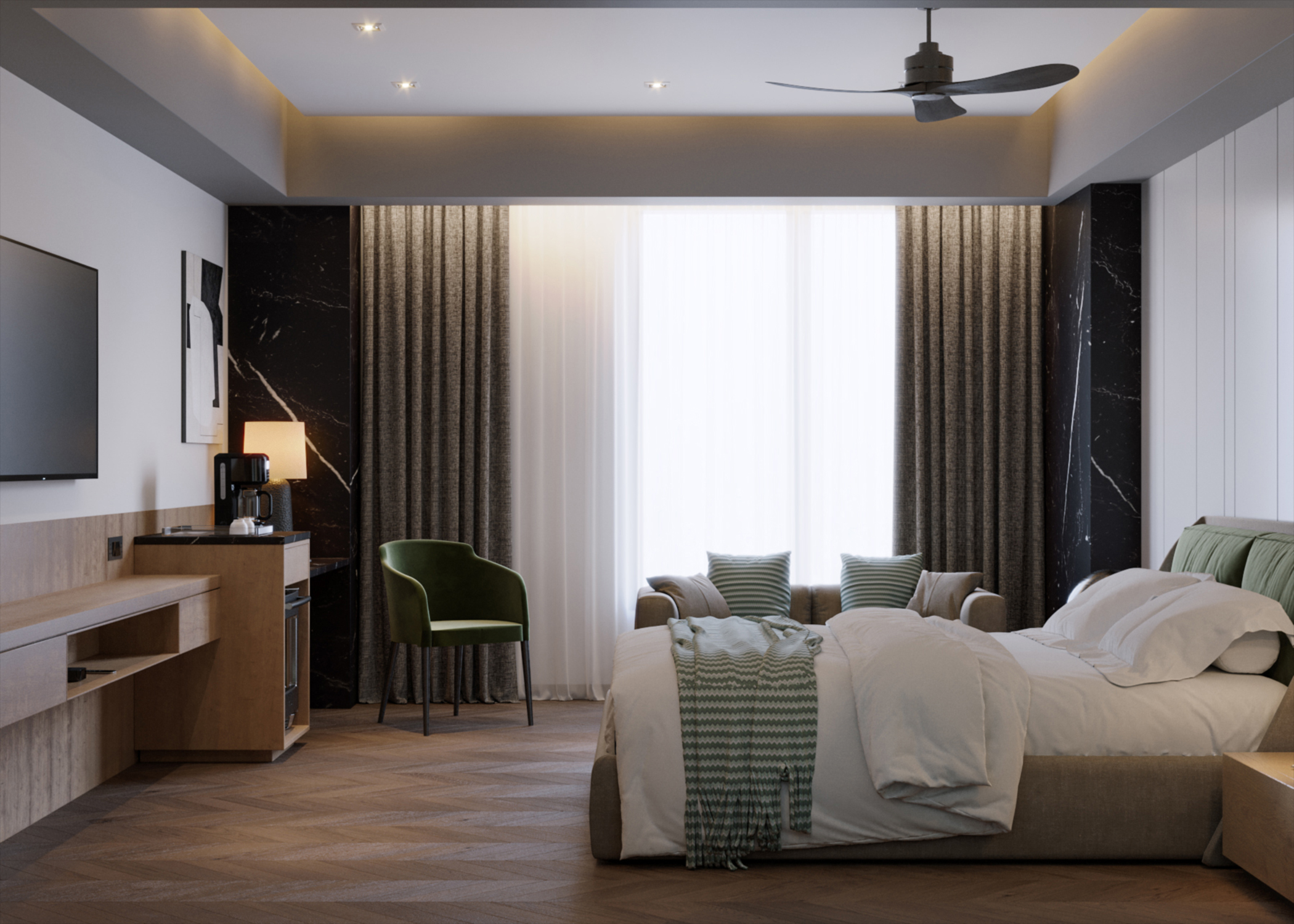 Современный дизайн гостиничного номера, созданный с акцентом на комфорт, функциональность и спокойную атмосферу. В проекте использованы мягкие нейтральные оттенки, сбалансированное освещение и тщательно подобранные материалы, формирующие уютное и гармоничное пространство. Визуализация направлена на передачу реалистичного настроения интерьера и ощущения современного гостеприимства.