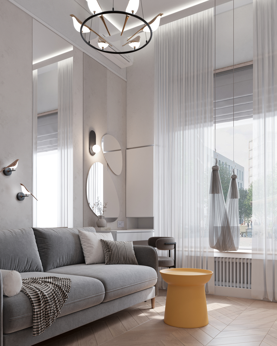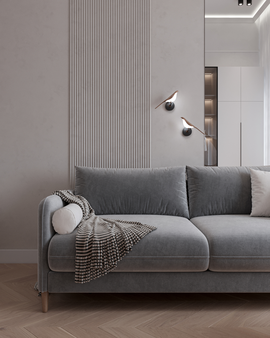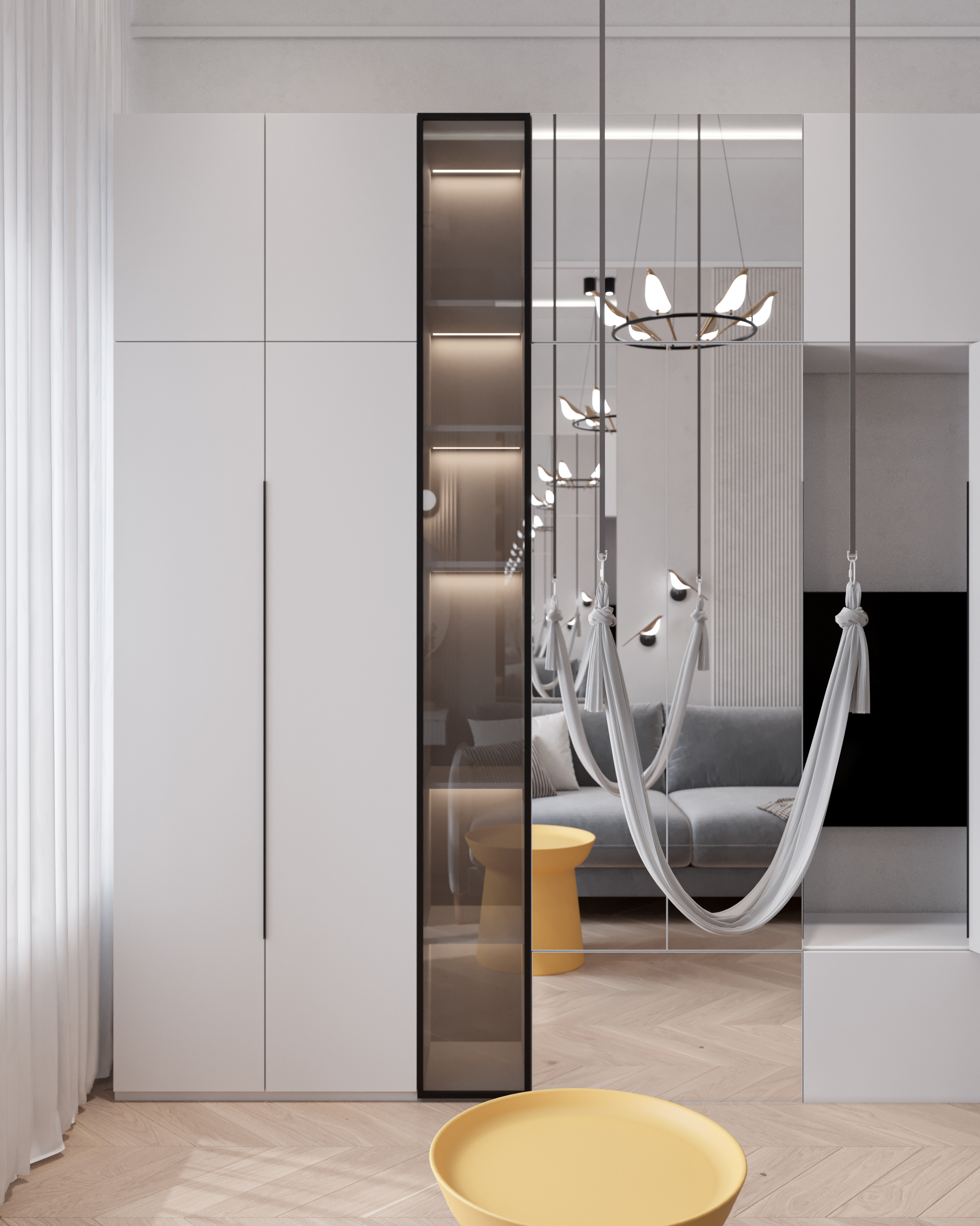 В данном проекте для спальни был умышленно заказчиками выбран диван, а не кровать, так как было жизненно необходимо место для занятий на гимнастическом полотне.