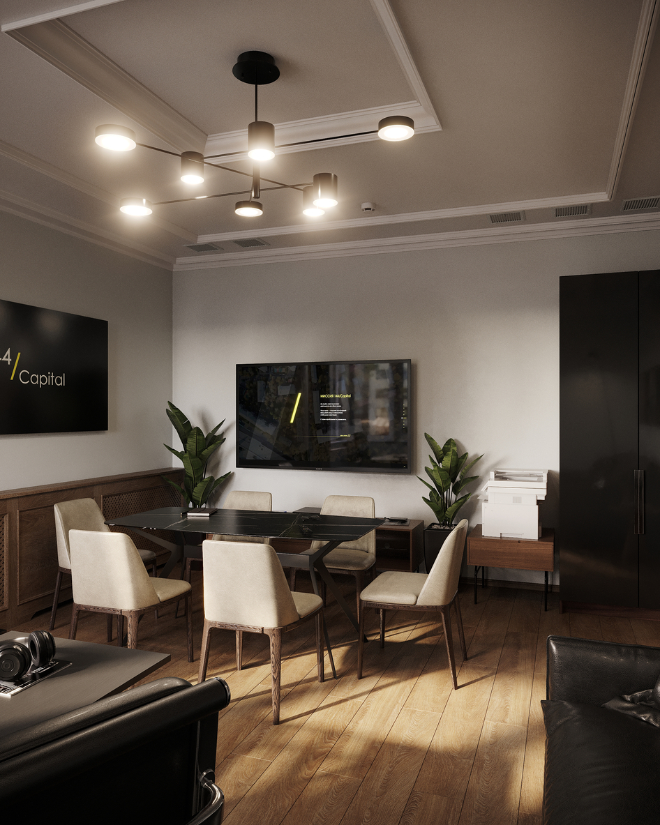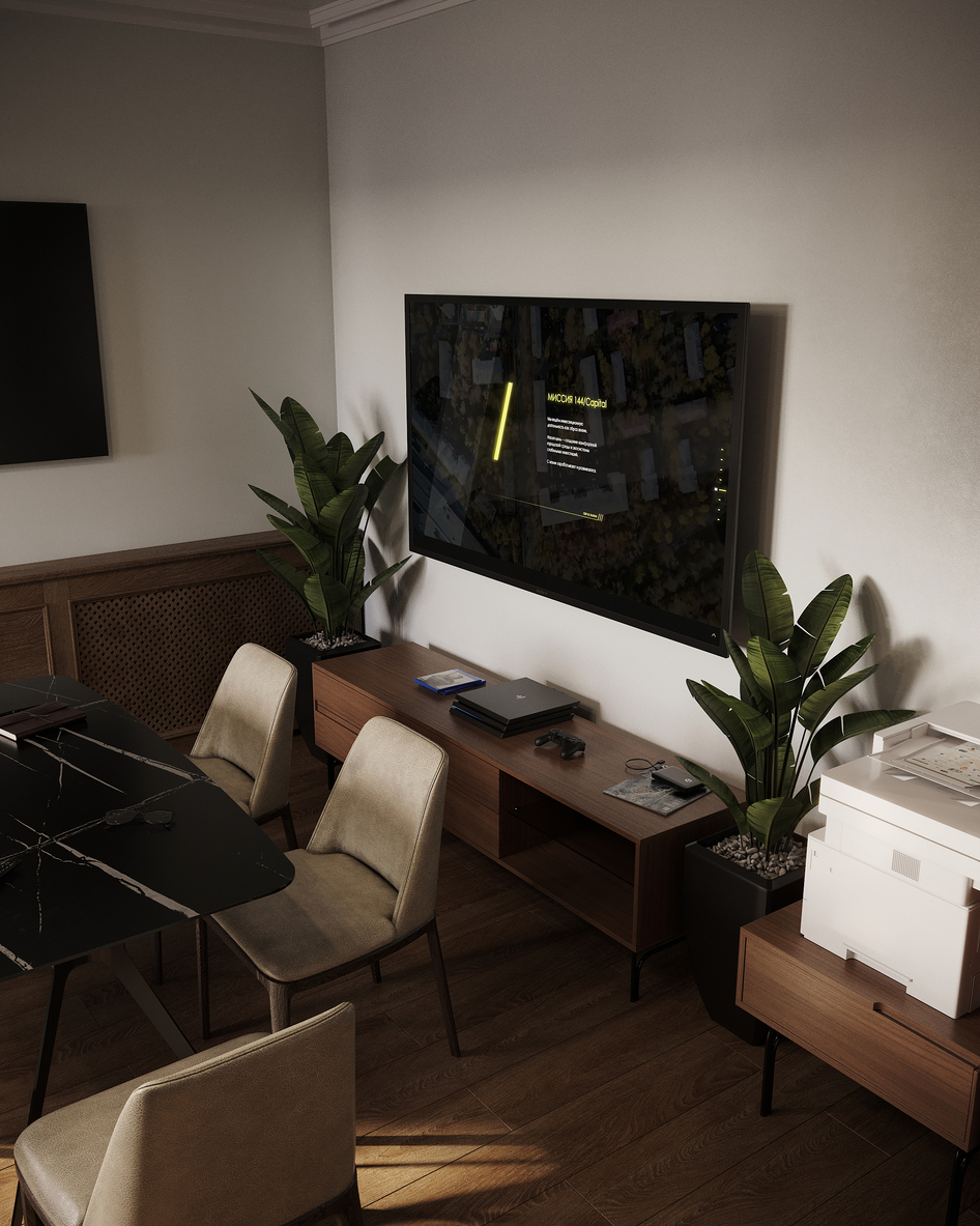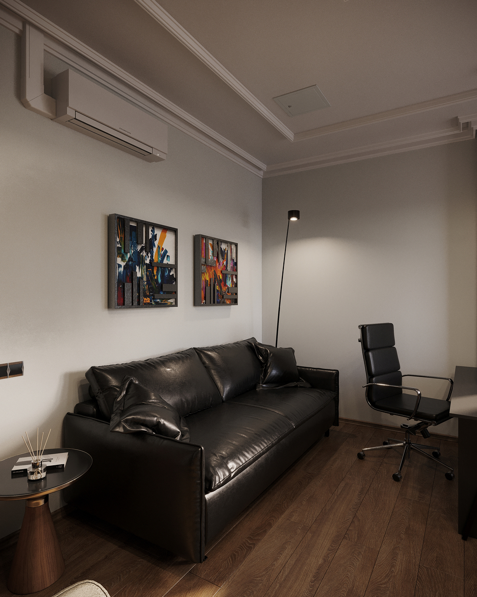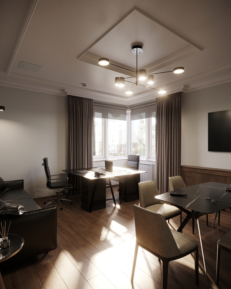 Нет, потому что там ремонт был уже готовый, надо было его изобразить и придумать все на основе того, что есть. Потолки менять нельзя. Но там помещение небольшое, света и так достаточно.