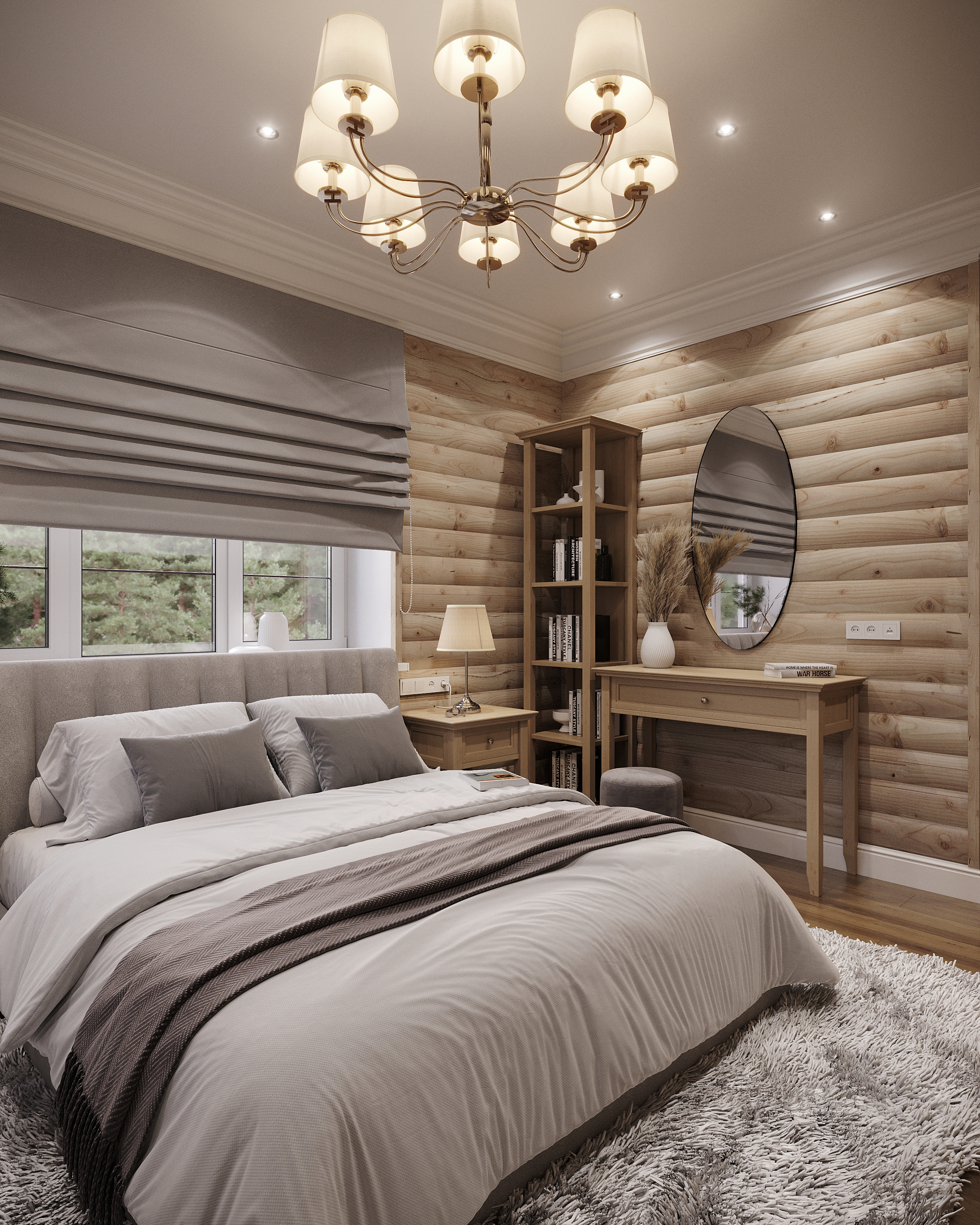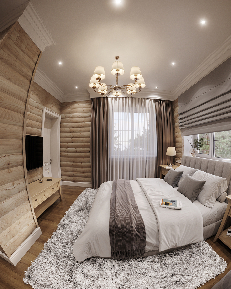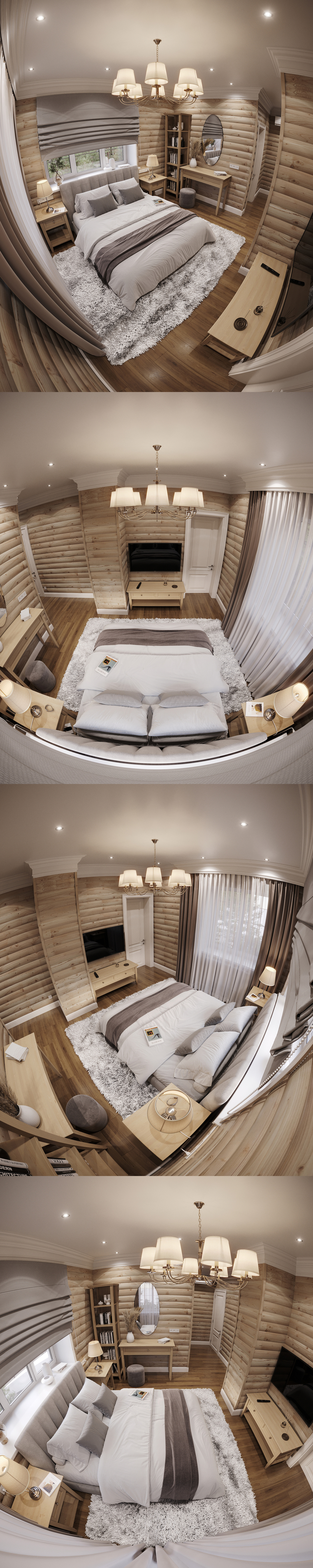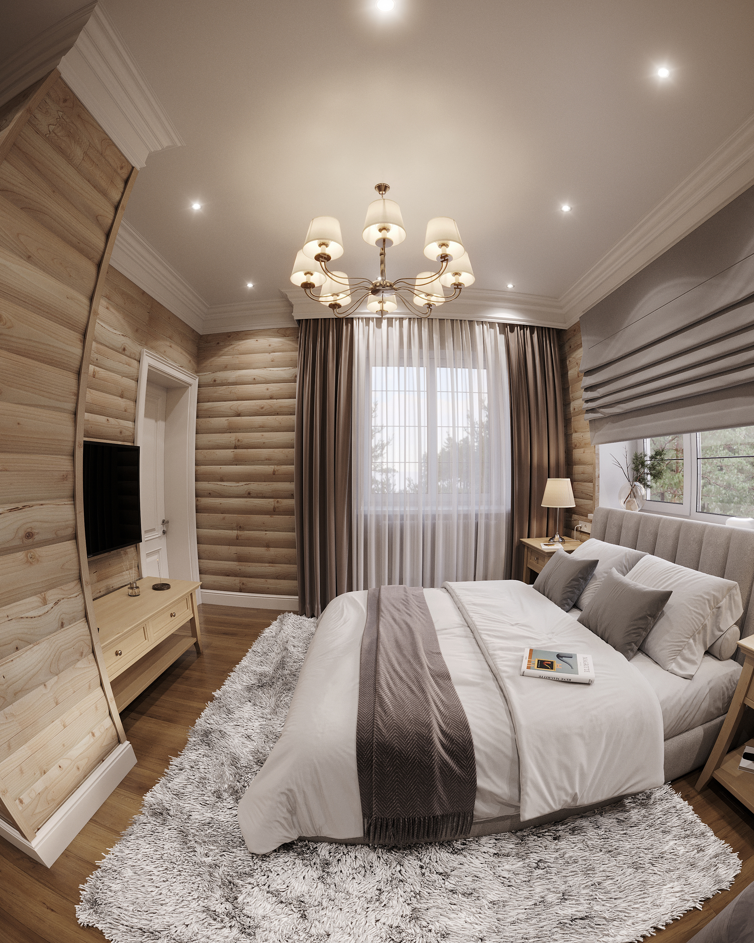 Круто, но 1 момент не понятен - домик явно в красивой лесистой местности, а кровать лицом в стенку - чтоб в ящик пялиться вместо красивых елочек. А карнизы а доме из бруса не отстрелят от стены? Такие дома довольно сильно "дышат".