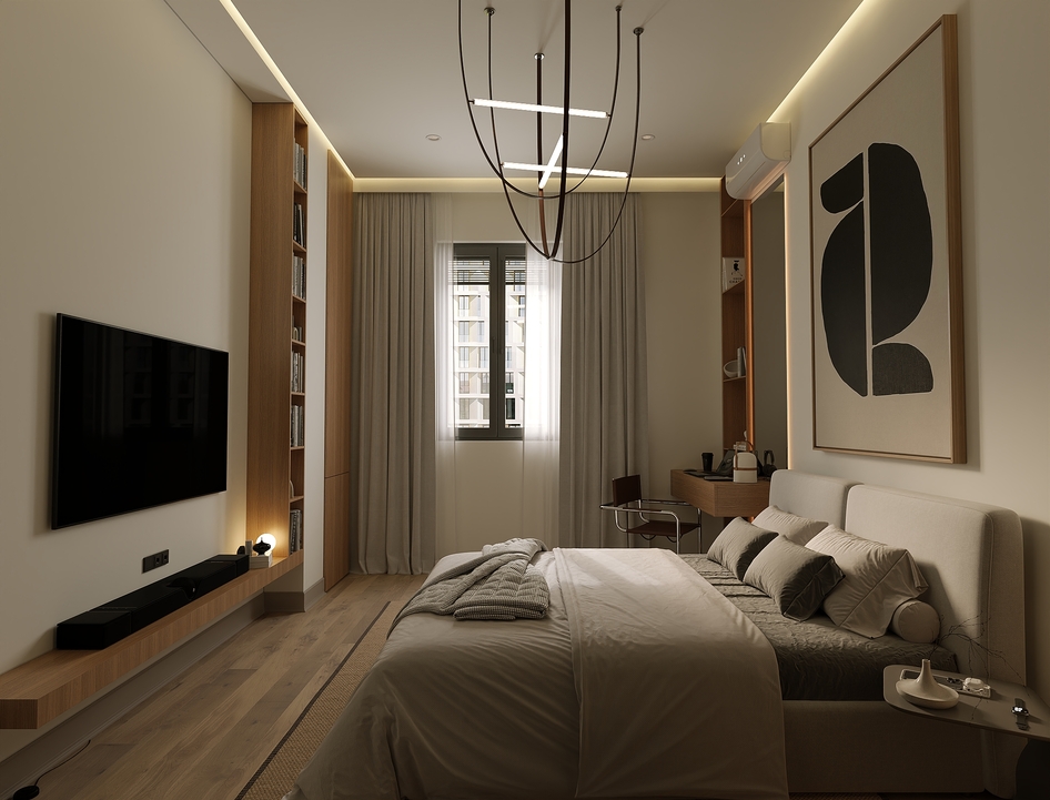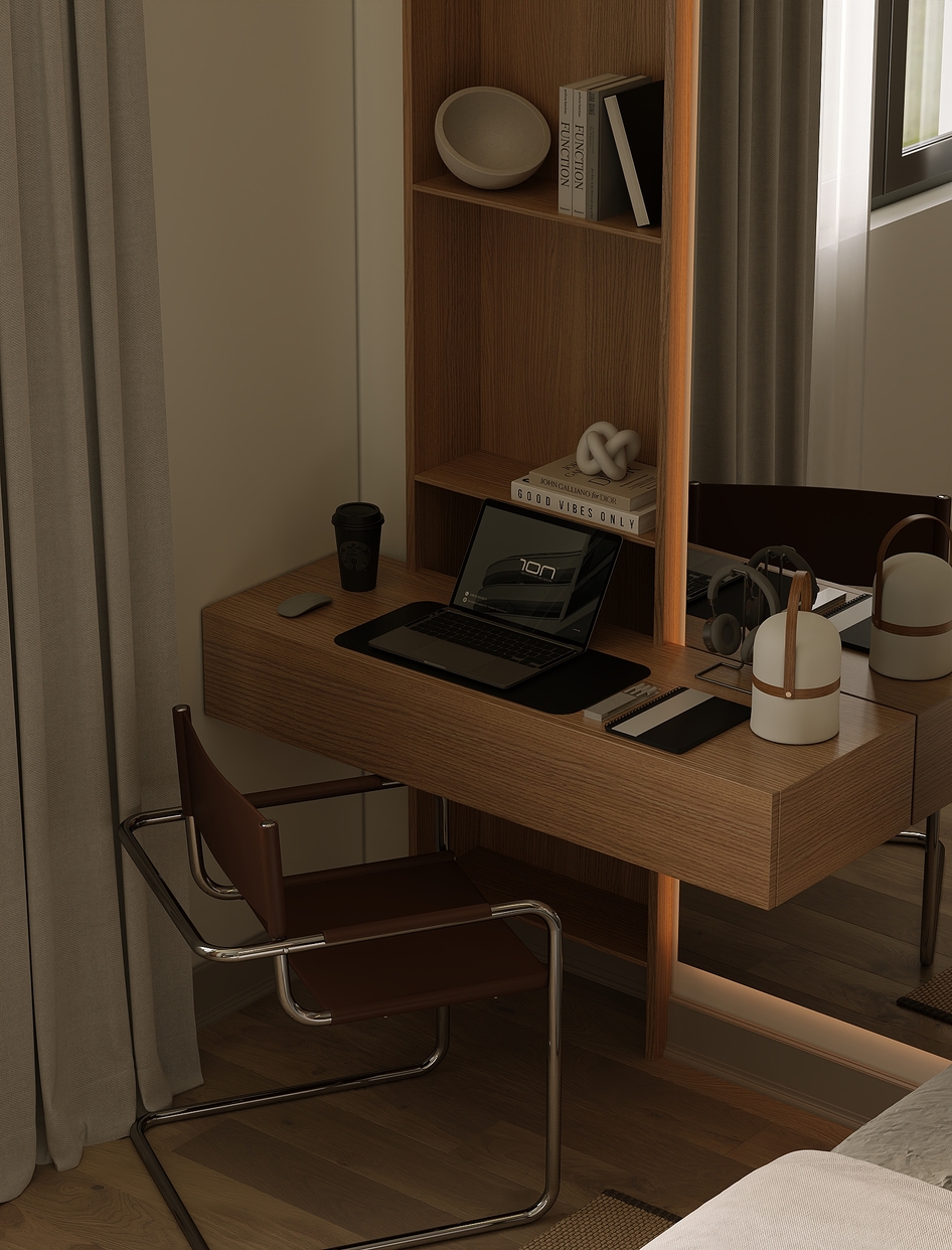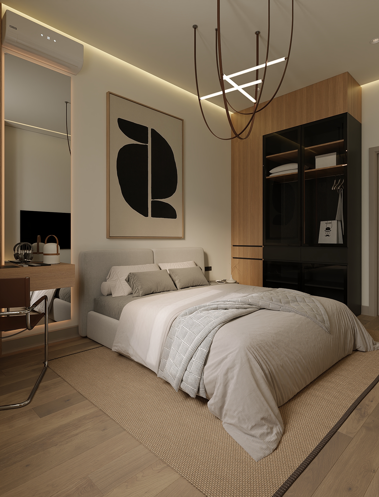 Декоративное панно с абстрактным рисунком придает комнате характер, а встроенное освещение и потолочные светильники создают мягкую атмосферу. Рабочая зона с деревянным столом и открыенными полками гармонично вписывается в интерьер.