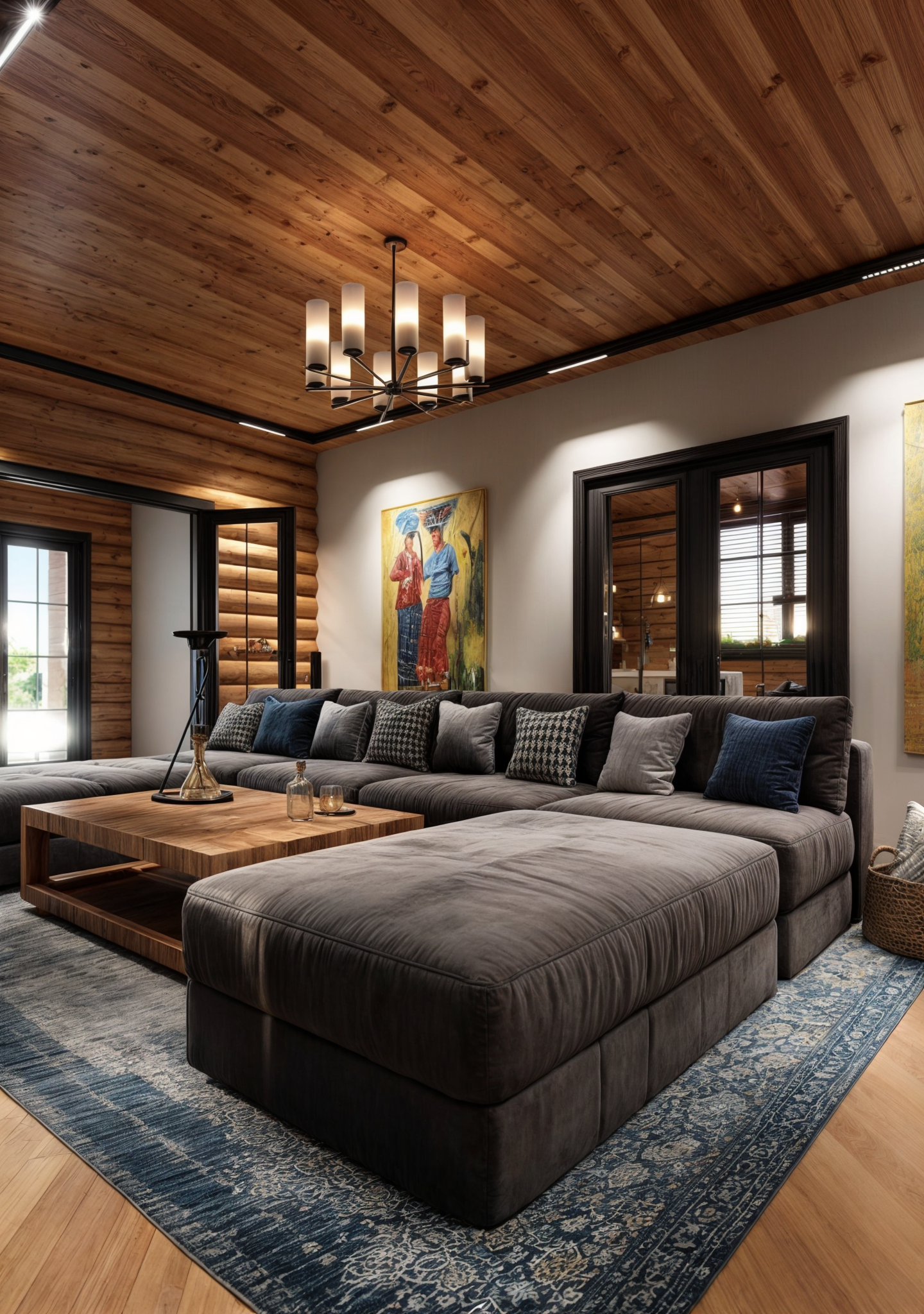 Современный уют в деревянном доме: стильный интерьер с мягким диваном, деревянными элементами и атмосферным освещением.