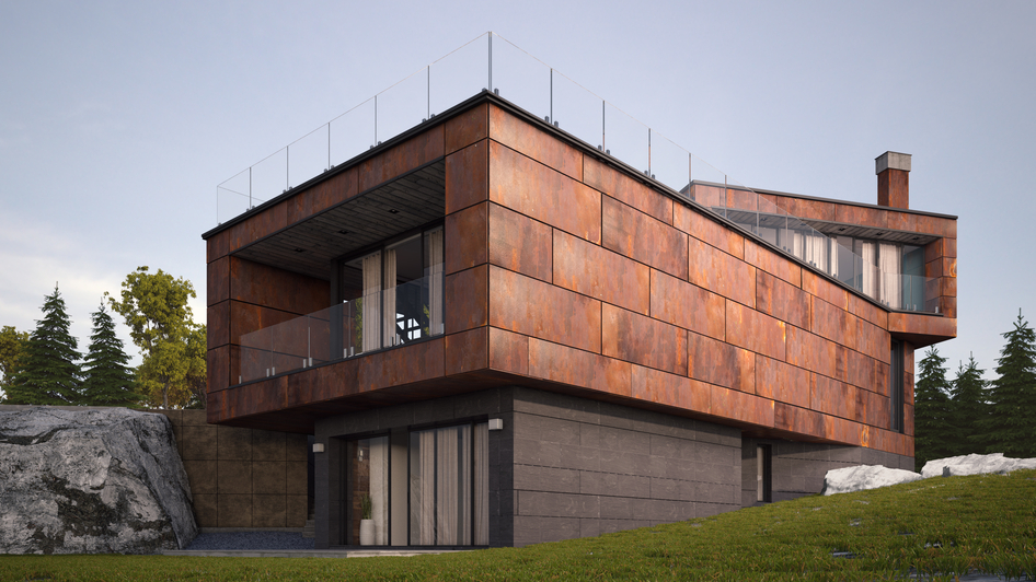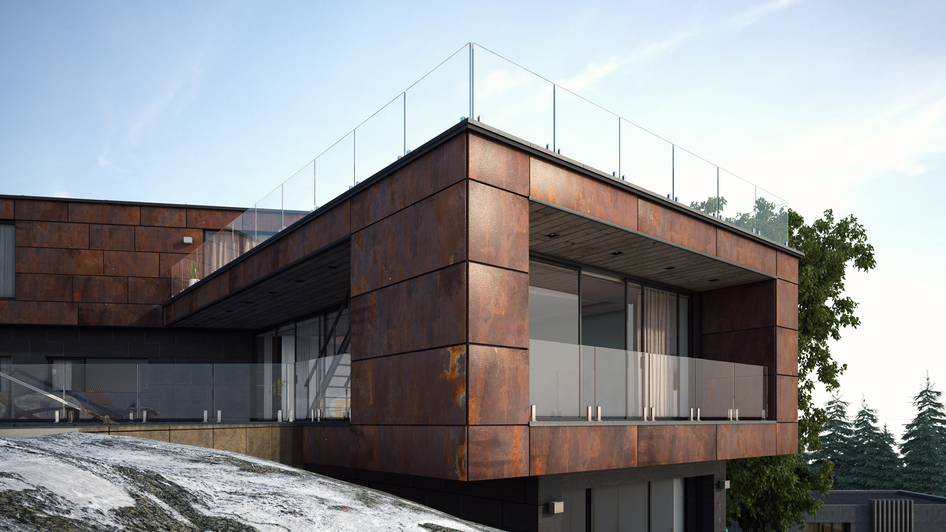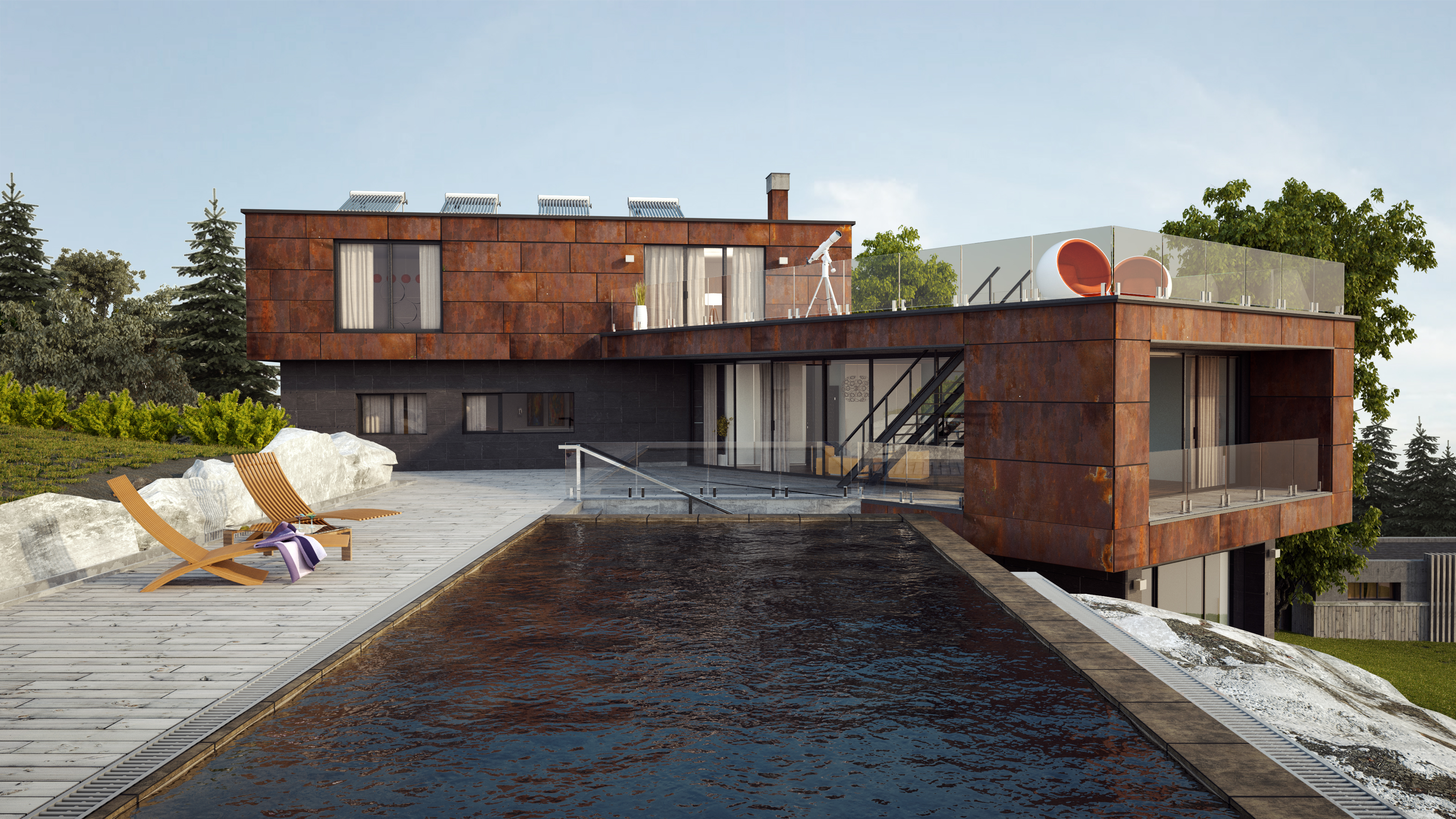 Над кортеном я бы еще поработал, кое где тайлится и сглаживание настроено не совсем корректно. Бассейн ну уж очень брутальный вышел. Обычно, когда кортеновую сталь применяют, другими вещами сглаживают ее брутальность. А в вашем случае бассейн наоборот ее только добавляет и получается перебор.