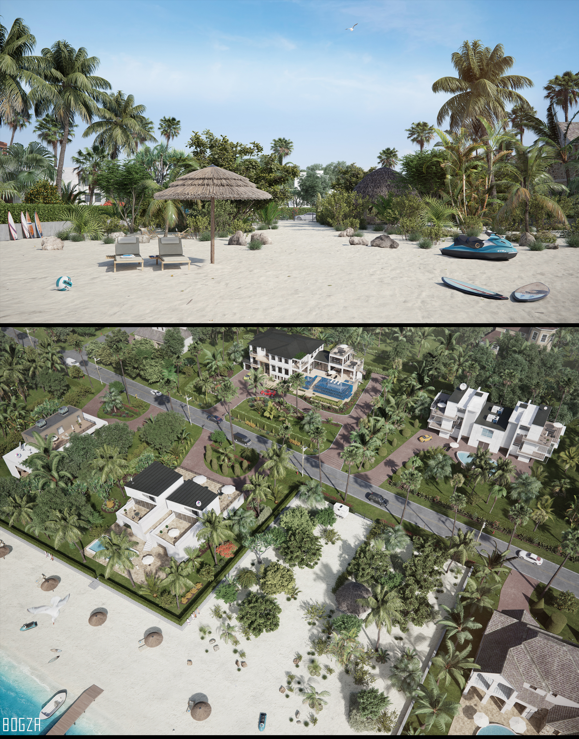 Там интересный момент в проекте был. Клиент выкупил большой кусок земли для прямого доступа к океану. Поэтому есть визуализация пляжной зоны и общая птичка. Растительность на пляже пожелал оставить максимально дикую.
