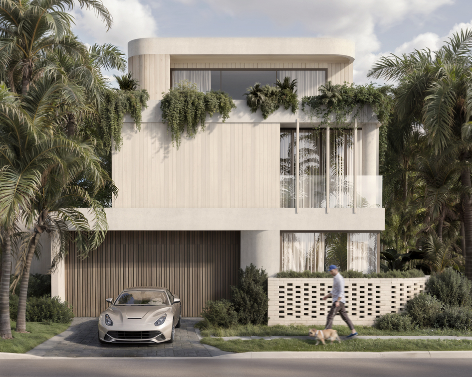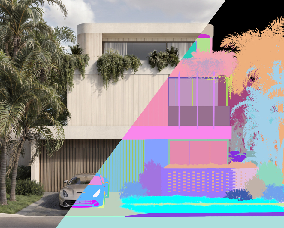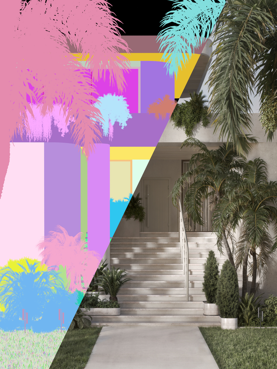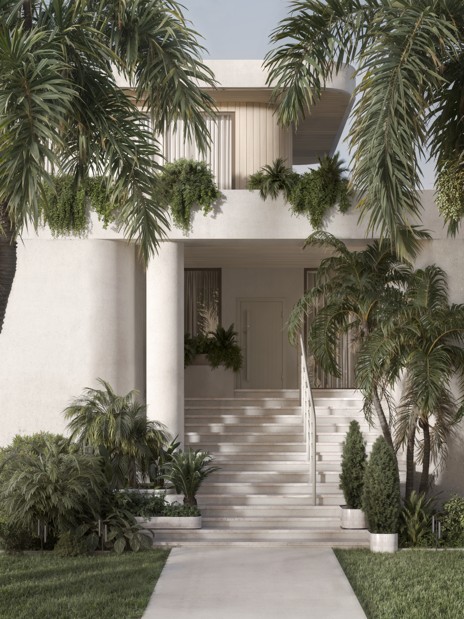 3ds Max | Corona Render | Photoshop | AI Визуализация частного дома в тропиках. Фасад сделала на основе внешнего вида дома с этого изображения: