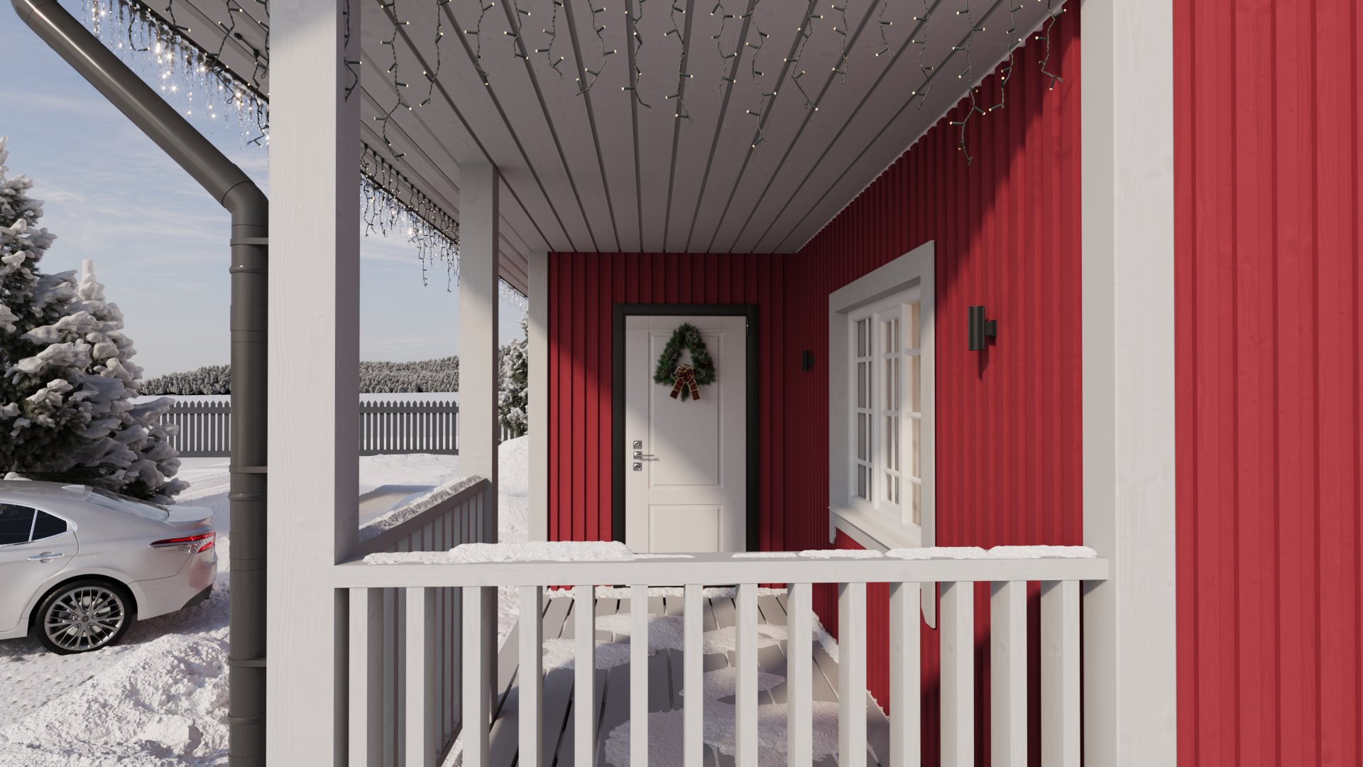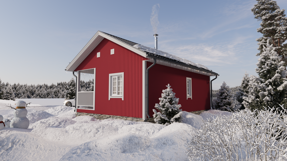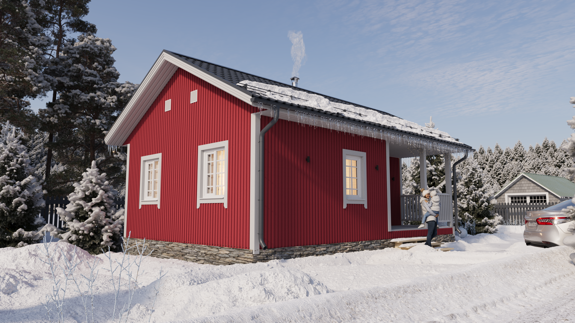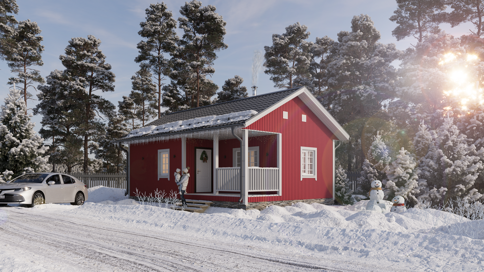 Домик у зимней дороги. Отделка красной рейкой монтированной горизонтально. Дом расположен близ хвойного леса. Погода снежная. У дома стоит белая tayota camry
