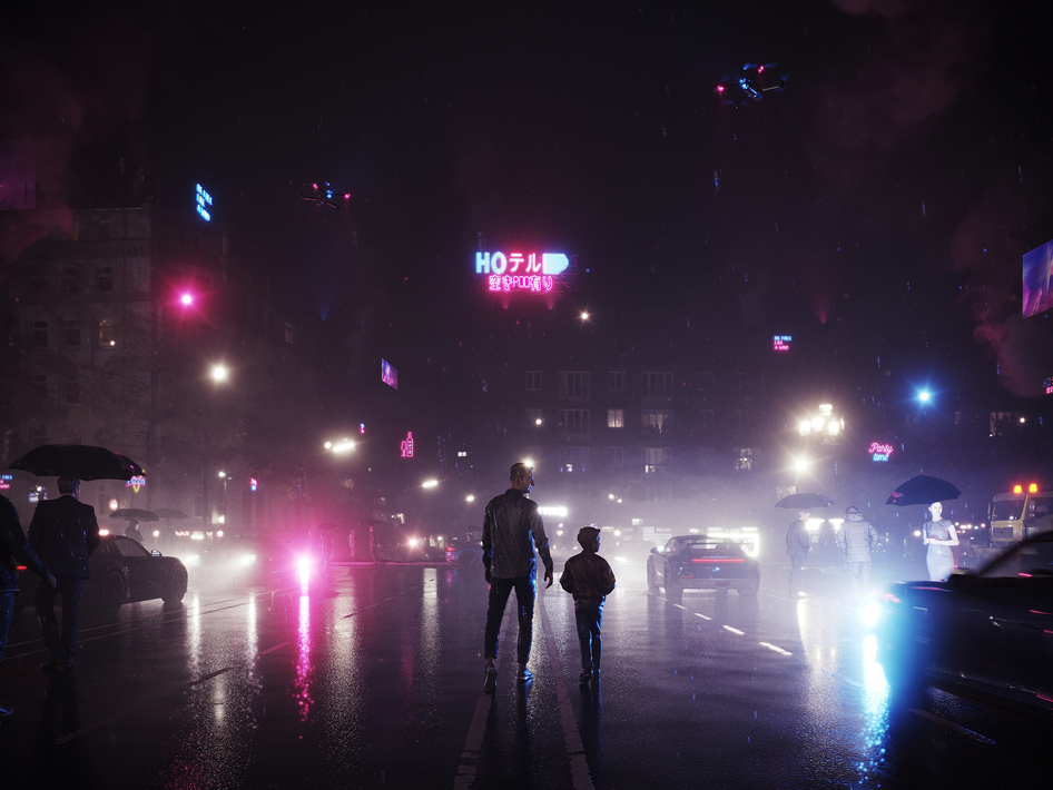 Решил потестировать туман в максе без использования сторонних программ и немного увлекся. Люблю тему антиутопии и неона, хотел сделать что-то атмосферное.