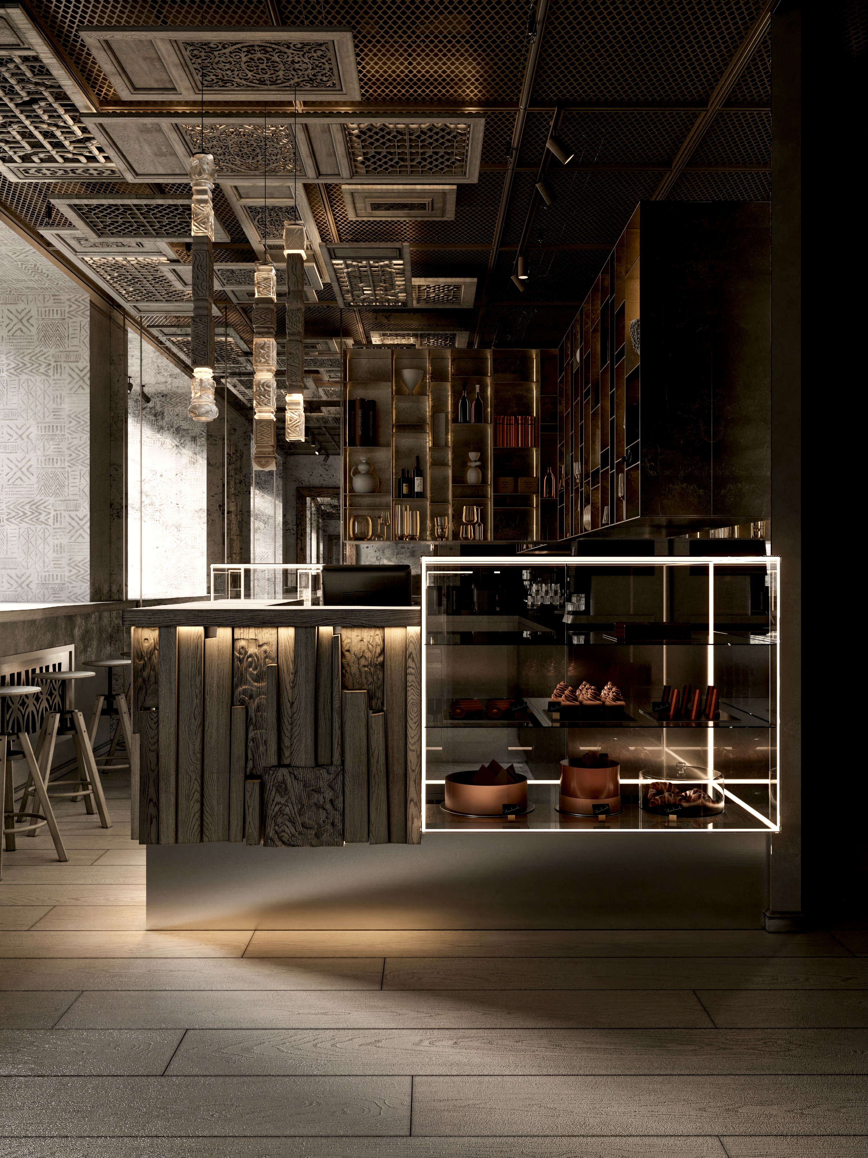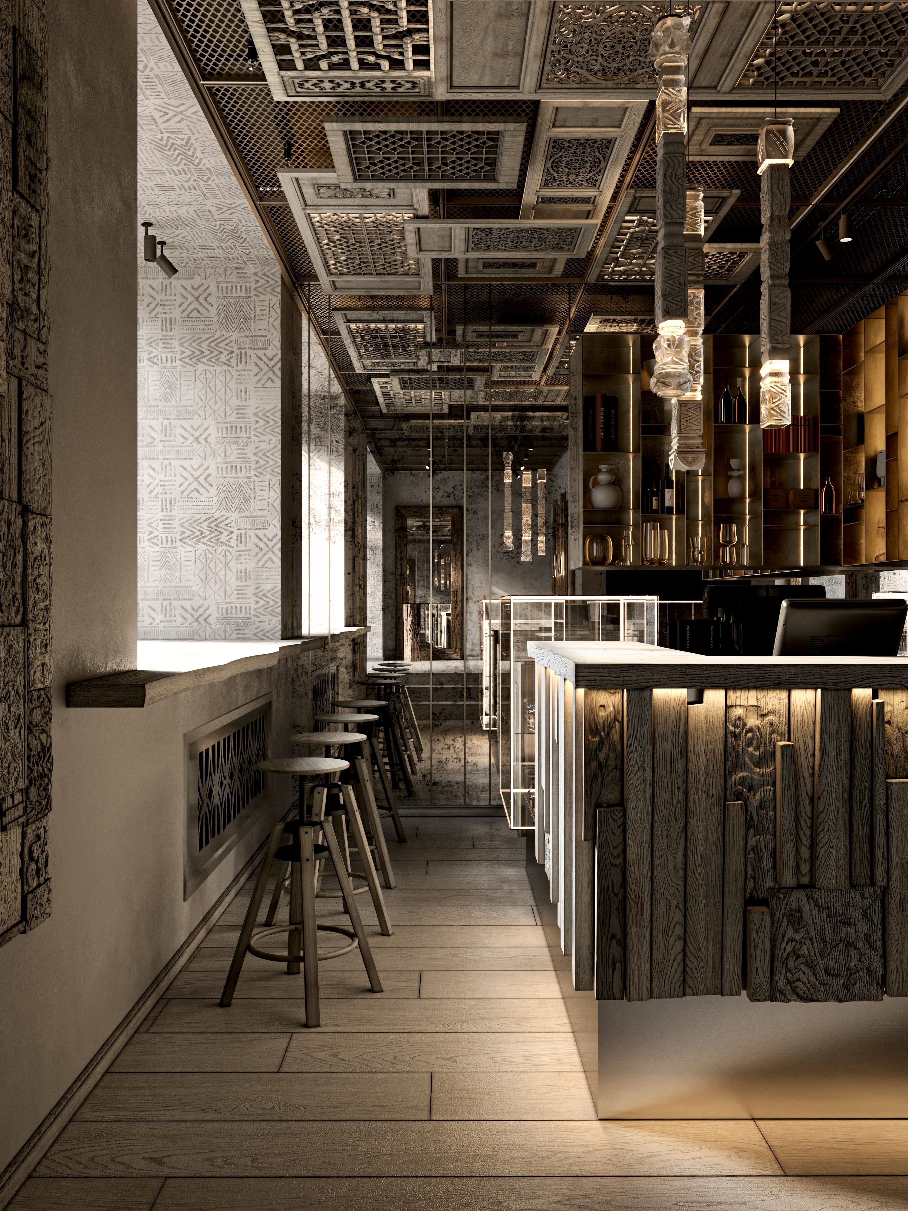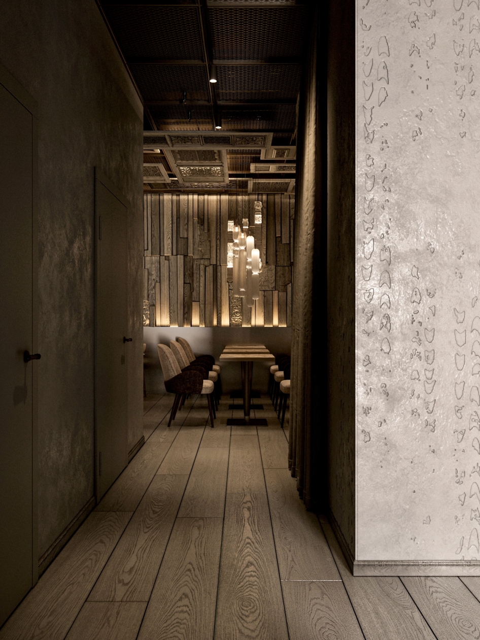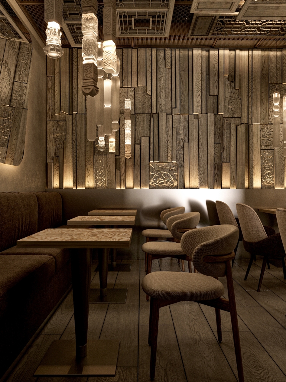 Кафе бистро в г. Рыбинск с отсылками к затопленному рыбинским водохранилищем городу Молога. Дизайн: MZ BURO