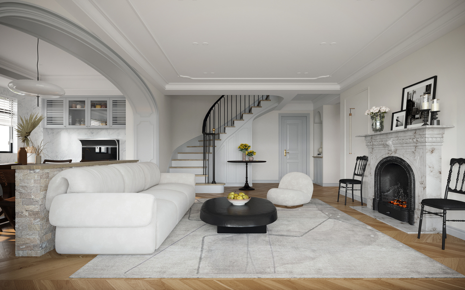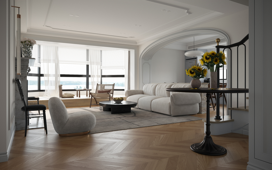 Очень приятный светлый интерьер, подсолнухи просто прелесть)) Единственное текстура у кресла на первом ракурсе крупновата, но это так, мелкая придирка)
