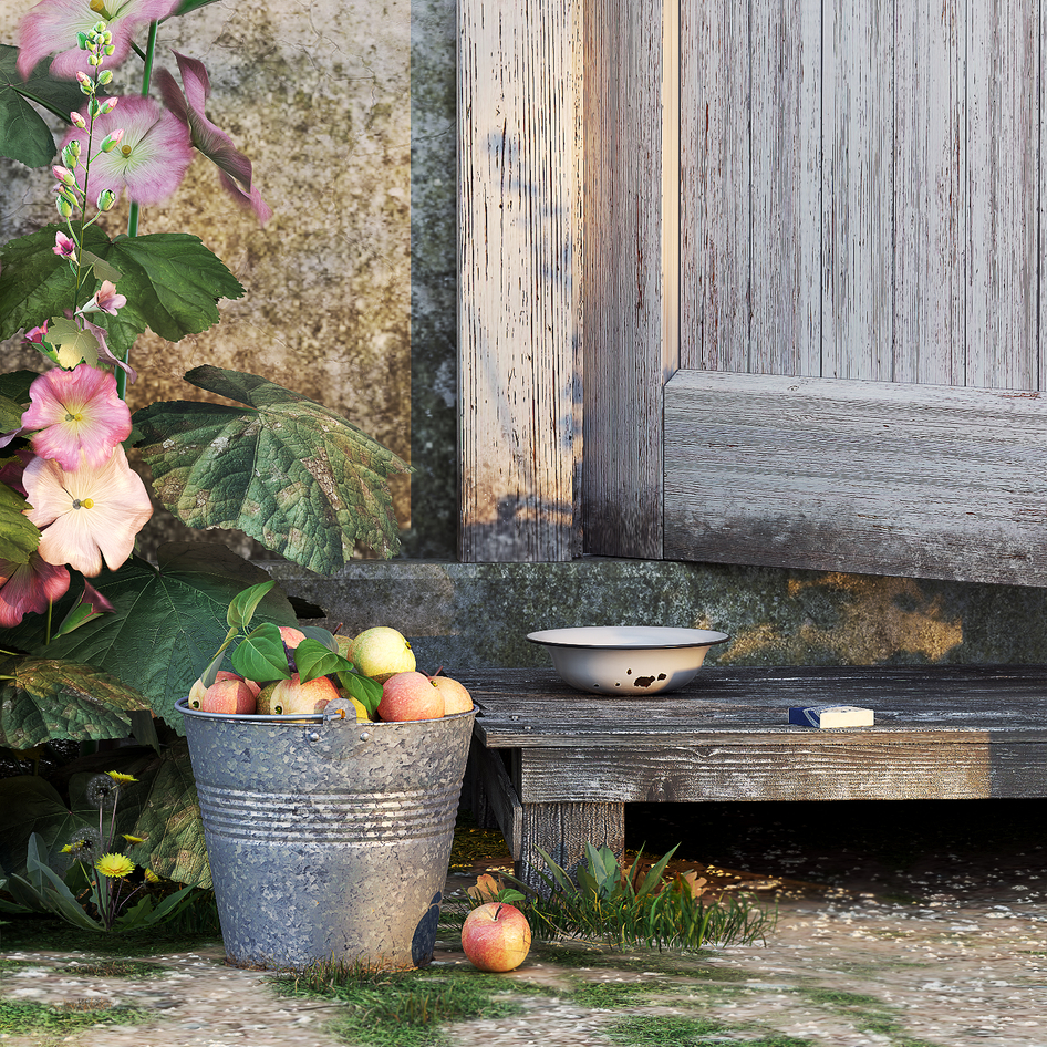 Цветущие одуванчики - весна, яблоки в ведре - осень, дисонанс. Материалы не для клоузапов. У деревяшек не хватает дисплейсмента. Но настрой мне нравится.