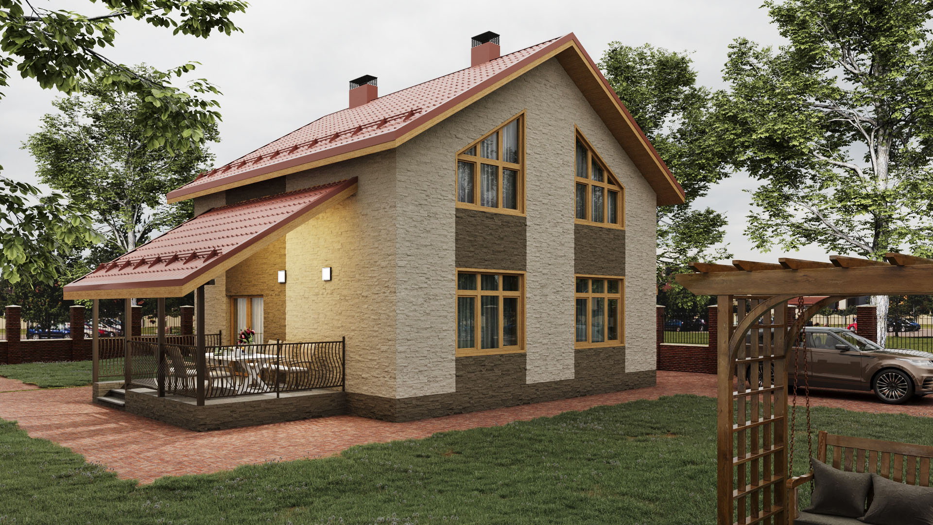 ракурсы конеша страшненькие. Как и домик. Все-таки цвет рам я бы взял другой, темнее. Вырвиглазную плитку убрал. Цоколь обычно выделяют, хотя бы отбивкой или капельником. Ливневки не хватает