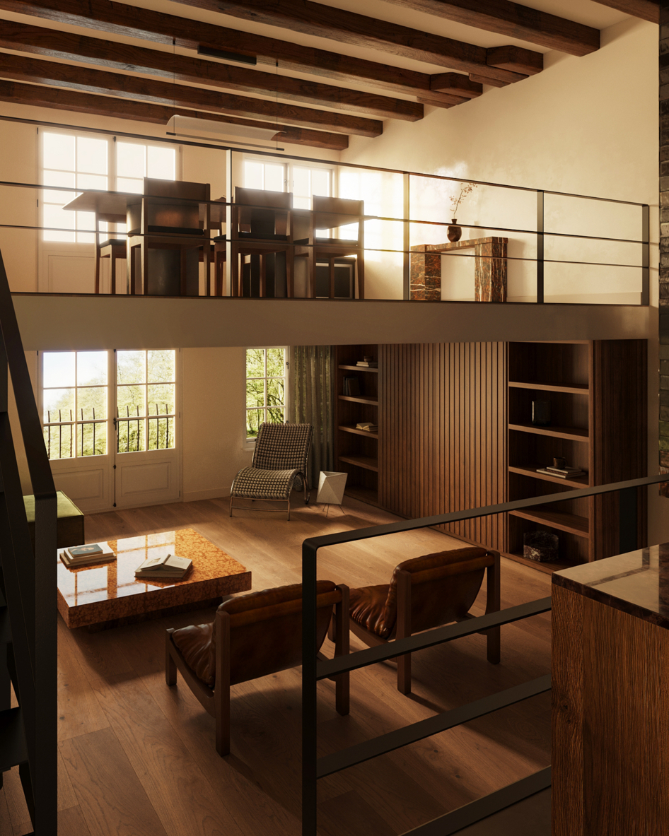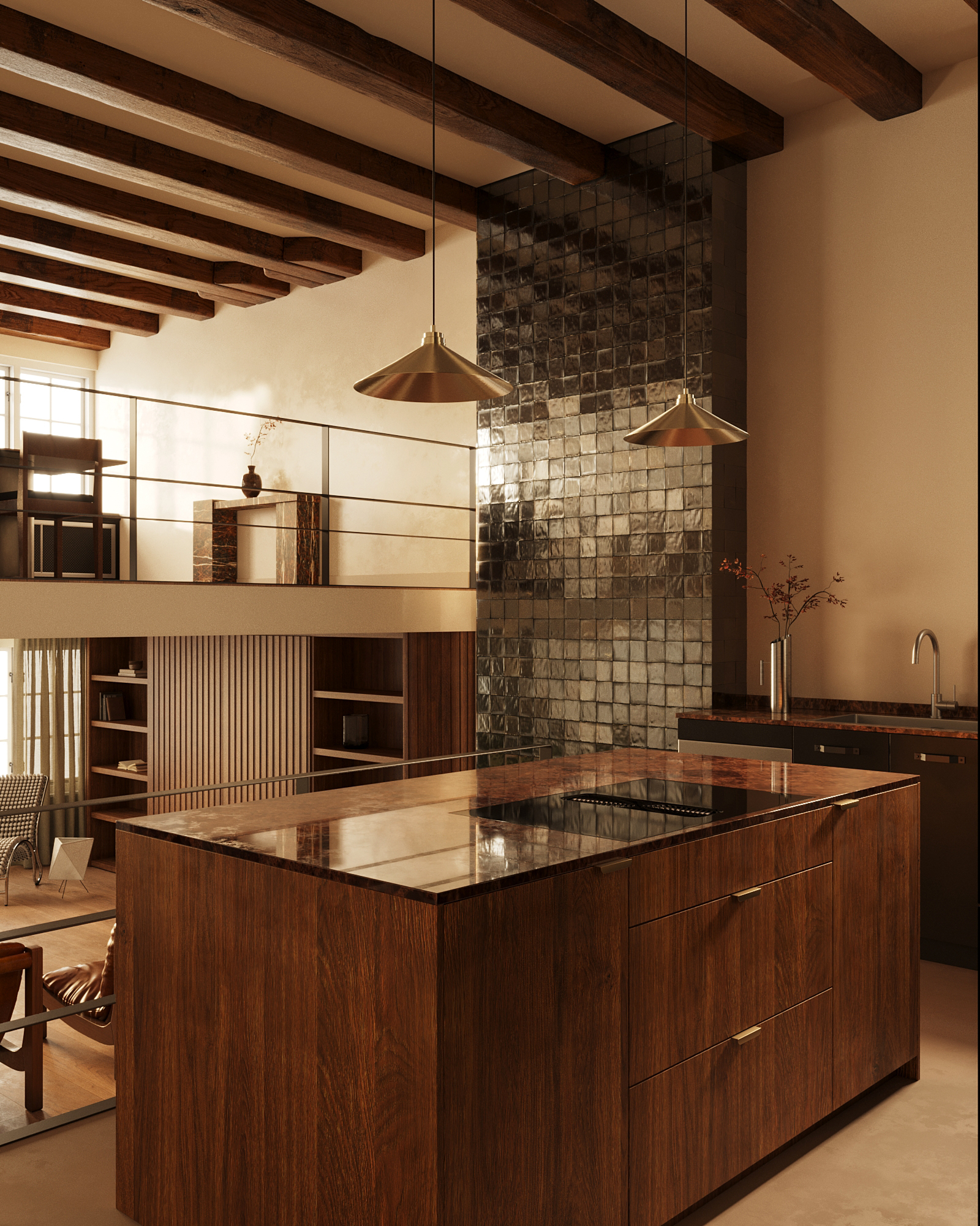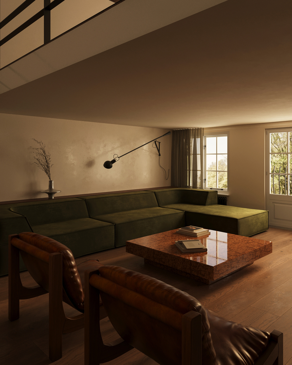 Визуализация выполнена на основе фотографий Daniëlle Siobhán реализованного дизайн проекта, разработанного Keltie Wijsman. В работе я опиралась на оригинальные кадры, стараясь передать атмосферу пространства через материалы, свет и пропорции. Референс -