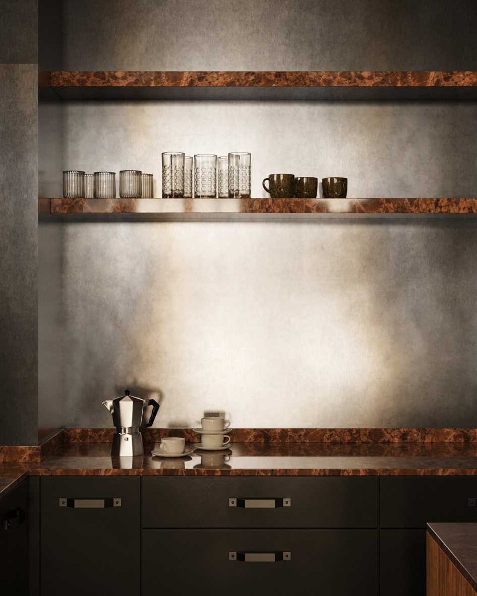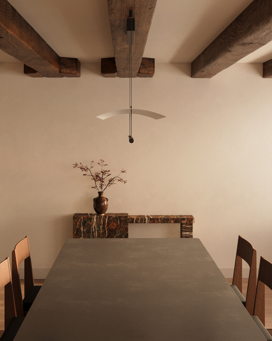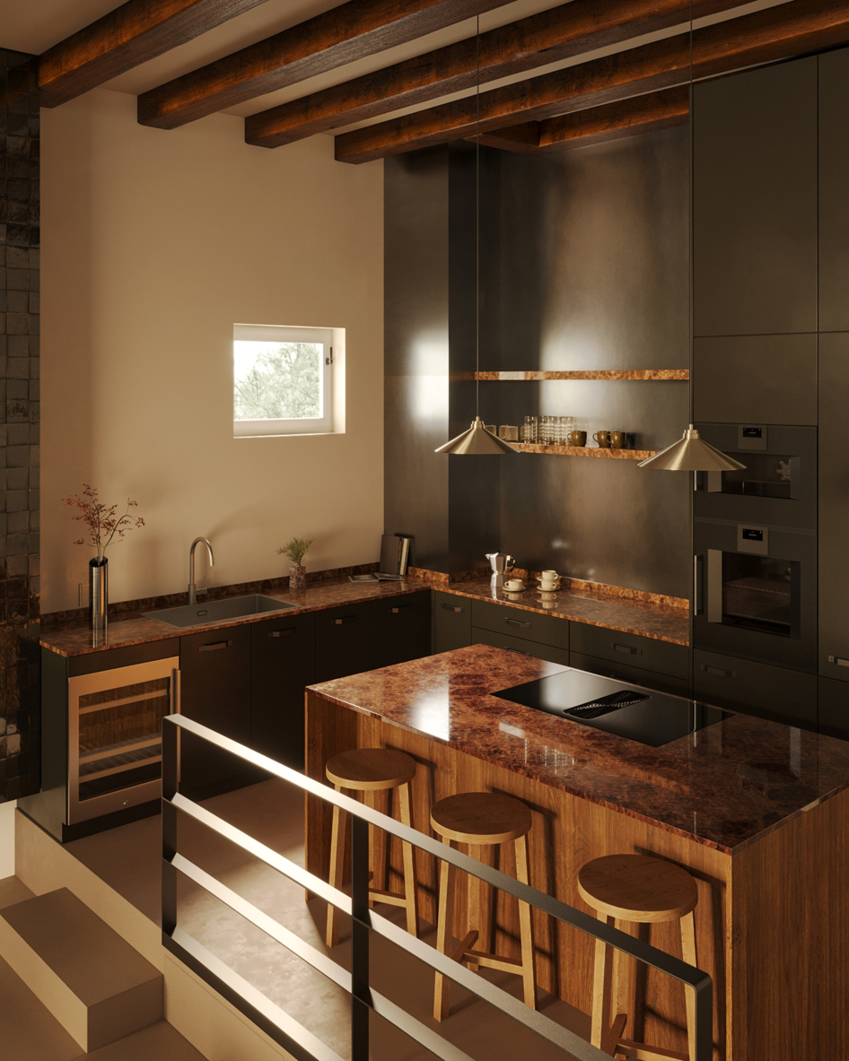 Визуализация выполнена на основе фотографий Daniëlle Siobhán реализованного дизайн проекта, разработанного Keltie Wijsman. В работе я опиралась на оригинальные кадры, стараясь передать атмосферу пространства через материалы, свет и пропорции. Референс -