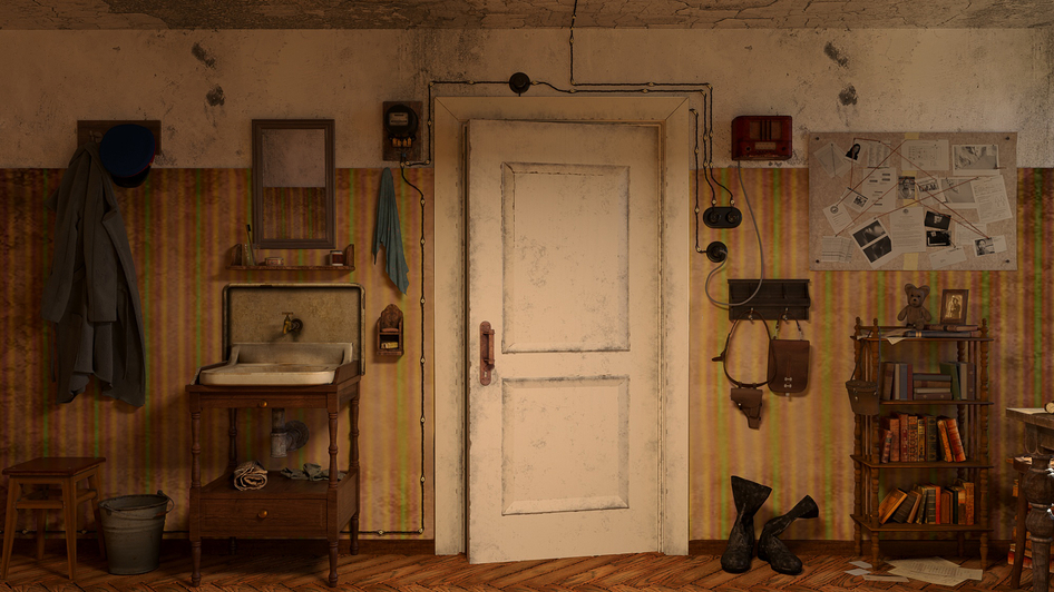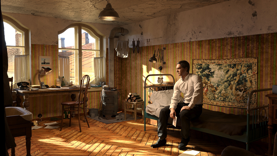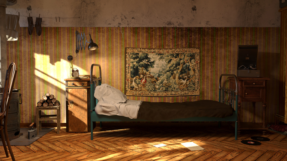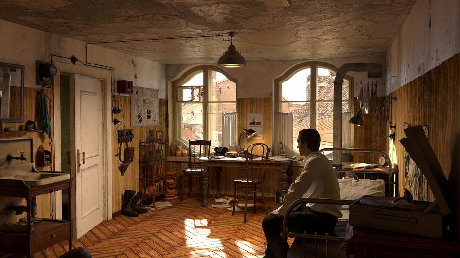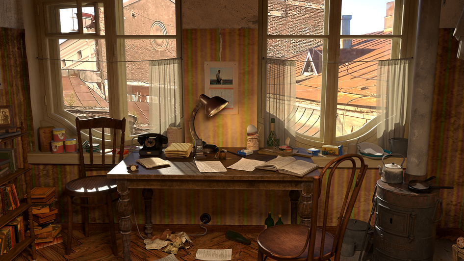 Эскиз освоения существующего помещения в Выборге. Полностью моделилась эта комната и повторялась компоновка крыш за окнами. Окна в реальности такие. По характеристике сценарной персонажа, это пространство идеально подходило(при том что оно пустое).