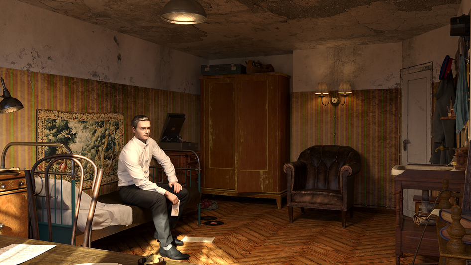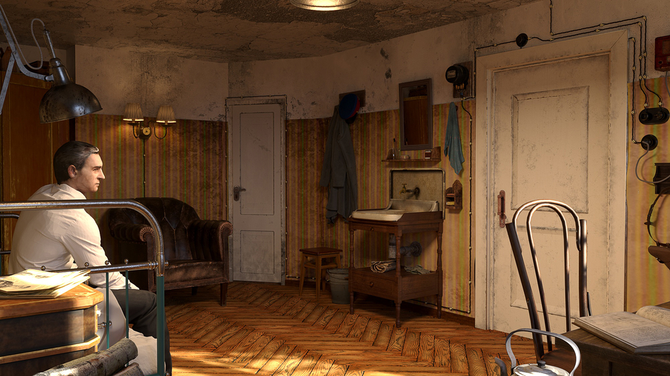 Я писал в описании что это реальная комната в Выборге. Именно с такими окнами и таким потолком. На главного героя бал утвержден высокий актер. А здесь да же мне со средним ростом было не уютно. Именно этот объект и был выбран что бы да же на сидящего героя все давило. Он находиться под самой крышей. Можно сказать что бывшая конура Карлсона))